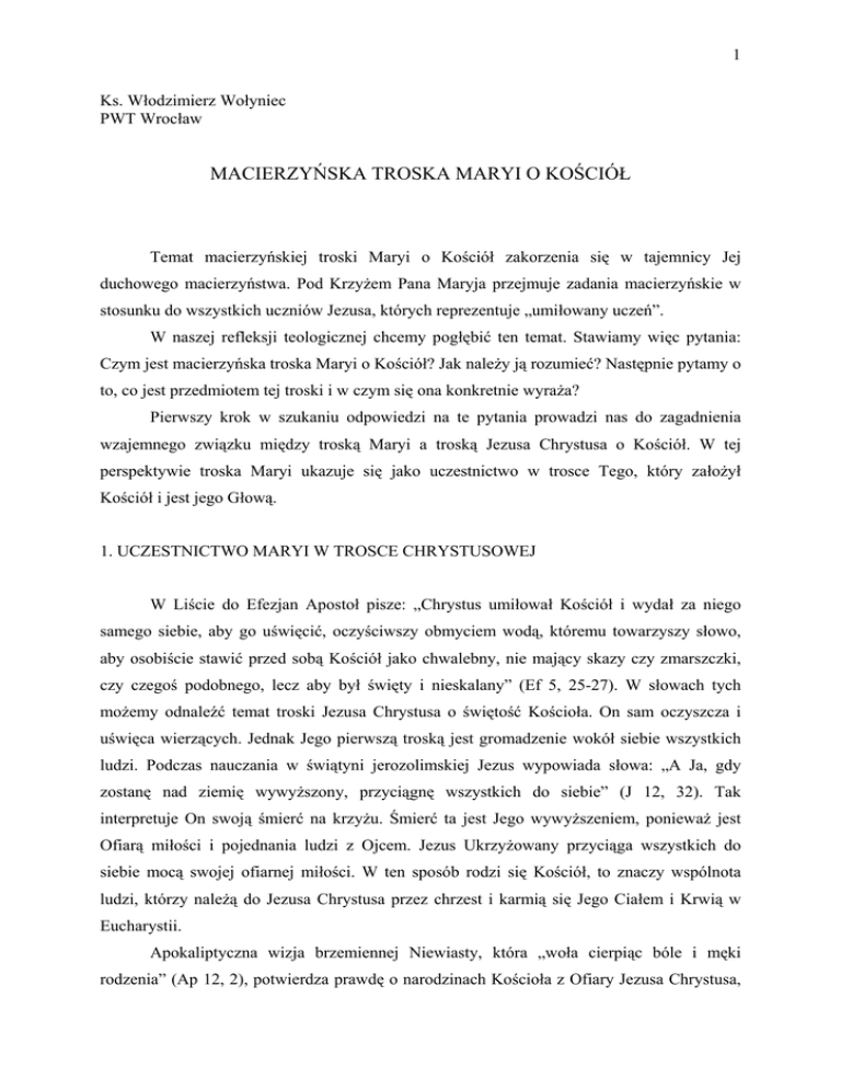 1 Ks. Włodzimierz Wołyniec PWT Wrocław MACIERZYŃSKA TROSKA MARYI O KOŚCIÓŁ Temat macierzyńskiej troski Maryi o Kościół zakorzenia się w tajemnicy Jej duchowego macierzyństwa. Pod Krzyżem Pana Maryja przejmuje zadania macierzyńskie w stosunku do wszystkich uczniów Jezusa, których reprezentuje „umiłowany uczeń”. W naszej refleksji teologicznej chcemy pogłębić ten temat. Stawiamy więc pytania: Czym jest macierzyńska troska Maryi o Kościół? Jak należy ją rozumieć? Następnie pytamy o to, co jest przedmiotem tej troski i w czym się ona konkretnie wyraża? Pierwszy krok w szukaniu odpowiedzi na te pytania prowadzi nas do zagadnienia wzajemnego związku między troską Maryi a troską Jezusa Chrystusa o Kościół. W tej perspektywie troska Maryi ukazuje się jako uczestnictwo w trosce Tego, który założył Kościół i jest jego Głową. 1. UCZESTNICTWO MARYI W TROSCE CHRYSTUSOWEJ W Liście do Efezjan Apostoł pisze: „Chrystus umiłował Kościół i wydał za niego samego siebie, aby go uświęcić, oczyściwszy obmyciem wodą, któremu towarzyszy słowo, aby osobiście stawić przed sobą Kościół jako chwalebny, nie mający skazy czy zmarszczki, czy czegoś podobnego, lecz aby był święty i nieskalany” (Ef 5, 25-27). W słowach tych możemy odnaleźć temat troski Jezusa Chrystusa o świętość Kościoła. On sam oczyszcza i uświęca wierzących. Jednak Jego pierwszą troską jest gromadzenie wokół siebie wszystkich ludzi. Podczas nauczania w świątyni jerozolimskiej Jezus wypowiada słowa: „A Ja, gdy zostanę nad ziemię wywyższony, przyciągnę wszystkich do siebie” (J 12, 32). Tak interpretuje On swoją śmierć na krzyżu. Śmierć ta jest Jego wywyższeniem, ponieważ jest Ofiarą miłości i pojednania ludzi z Ojcem. Jezus Ukrzyżowany przyciąga wszystkich do siebie mocą swojej ofiarnej miłości. W ten sposób rodzi się Kościół, to znaczy wspólnota ludzi, którzy należą do Jezusa Chrystusa przez chrzest i karmią się Jego Ciałem i Krwią w Eucharystii. Apokaliptyczna wizja brzemiennej Niewiasty, która „woła cierpiąc bóle i męki rodzenia” (Ap 12, 2), potwierdza prawdę o narodzinach Kościoła z Ofiary Jezusa Chrystusa, 2 ponieważ „rodzenie w bólach i w męce” oznacza Mękę i Zmartwychwstanie Jezusa Chrystusa1. Obraz ten ma jednak podwójne znaczenie. „Niewiasta” oznacza też Kościół, w którym dzieci Boże rodzą się powtórnie z wody i Ducha Świętego. Początkiem tego rodzenia jest sakrament chrztu. Następnie całe życie ochrzczonego jest „rodzeniem” się na nowo do życia dla Boga na wzór pszenicznego ziarna, które wydaje plon tylko wtedy, gdy obumiera2. Kościół rodzący się z Ofiary Jezusa Chrystusa jest reprezentowany przez stojących pod krzyżem: „Matkę Jego, siostrę Matki Jego, Marię, żonę Kleofasa, Marię Magdalenę i umiłowanego ucznia” (por. J 19, 25). W sposób szczególny jednak obraz Kościoła konkretyzuje się w osobie Maryi, którą Jezus nazywa „niewiastą”. Jezus widzi w Niej wcielenie ideału starego Izraela, który doszedł już do pełni czasu3. Dlatego określenie to nasuwa na myśl starotestamentową figurę „Córy Syjonu”, to znaczy figurę „niewiasty matki” symbolizującej Izraela i matkę wszystkich narodów. W wydarzeniu Krzyża wypełnia się więc proroctwo zapowiadające zgromadzenie się przy Chrystusie Kościoła wszystkich narodów: „Podnieś oczy wokoło i popatrz: Ci wszyscy zebrani zdążają do ciebie, Twoi synowie przychodzą z daleka, na rękach niesione twe córki” (Iz 60, 4); „Oto idą synowie twoi, których wysłałaś, idą, zebrani ze wschodu i zachodu na słowo Świętego ciesząc się chwałą Boga” (Ba 4, 37)4. W trosce o Kościół Jezus wypowiada słowa nazywane „testamentem z krzyża”: „Kiedy więc Jezus ujrzał Matkę i stojącego obok Niej ucznia, którego miłował, rzekł do Matki: <Niewiasto, oto syn Twój>. Następnie rzekł do ucznia: <Oto Matka twoja>. I od tej godziny uczeń wziął Ją do siebie” (J 19, 26-27). W ten sposób czyni On Maryję uczestnikiem swojej własnej troski o Kościół. Jego troska ma być odtąd Jej troską, Jej uczestnictwem w Jego trosce o budowanie wspólnoty Kościoła. Wywyższony na krzyżu Pan dzieli się troską o Kościół ze swoją Matką, którą powołuje do duchowego macierzyństwa względem wszystkich ludzi. 2. PRZEDŁUŻENIE MACIERZYŃSKIEJ TROSKI MARYI O JEZUSA Stając się duchową Matką wszystkich ludzi Maryja nie przestaje być Matką Jezusa. Przeciwnie. Jej duchowe macierzyństwo jest przedłużeniem macierzyństwa w stosunku do 1 Por. A. SERRA, Maria nell’A.T., [w] Nuovo Dizionario di Teologia Biblica (odtąd skrót NDTB), red. P. Rossano, G. Ravasi, A. Ghirlanda, Cinisello Balsamo (Milano) 1988, 907. 2 Por. J. RATZINGER, O sensie bycia chrześcijaninem, przekład J. Merecki, Kraków 2006, 56n. 3 Por. A SERRA, Maria nell’A.T...art. cyt., 897. 4 Por. J. RATZINGER, Córa Syjonu. Maryja w refleksji Kościoła, przekład B. Widła, Warszawa 1997, 17n. 3 Jezusa Chrystusa. Dlatego można stwierdzić, że również troska Maryi o Kościół jest przedłużeniem Jej macierzyńskiej troski o Jezusa Chrystusa. Jeśli pod krzyżem Maryja przejmuje zadanie macierzyńskie względem wszystkich uczniów Jezusa, których reprezentuje „umiłowany uczeń”, to odtąd wszyscy oni stanowią Jej duchowe potomstwo. O potomstwie tym mówi Księga Apokalipsy, ukazując obraz walki Smoka z „resztą potomstwa Niewiasty”, to znaczy z tymi, „co strzegą przykazań Boga i mają świadectwo Jezusa” (Ap 12, 17) 5. Idea przedłużenia macierzyńskiej troski Maryi o Jezusa na cały Kościół jest obecna w nauczaniu ostatnich Papieży. U św. Piusa X wynika ona ze ścisłej więzi Matki z Synem: „Nikt tak nie zna Chrystusa, jak Jego Matka, a więc nikt nie może być lepszym przewodnikiem i mistrzem na drodze do poznania Chrystusa”6. Myśl tę rozwija Piu