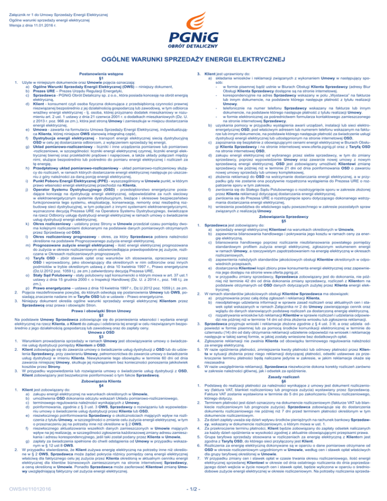 Załącznik nr 1 do Umowy Sprzedaży Energii Elektrycznej Ogólne warunki sprzedaży energii elektrycznej Wersja z dnia 11.01.2016 r. OGÓLNE WARUNKI SPRZEDAŻY ENERGII ELEKTRYCZNEJ Postanowienia wstępne §1 1. Użyte w niniejszym dokumencie oraz Umowie pojęcia oznaczają: a) Ogólne Warunki Sprzedaży Energii Elektrycznej (OWS) – niniejszy dokument, b) Prezes URE – Prezes Urzędu Regulacji Energetyki, c) Sprzedawca - PGNiG Obrót Detaliczny sp. z o.o., która posiada koncesję na obrót energią elektryczną, d) Klient - konsument czyli osoba fizyczna dokonująca z przedsiębiorcą czynności prawnej niezwiązanej bezpośrednio z jej działalnością gospodarczą lub zawodową, w tym odbiorca wrażliwy energii elektrycznej - tj. osoba, której przyznano dodatek mieszkaniowy w rozumieniu art. 2 ust. 1 ustawy z dnia 21 czerwca 2001 r. o dodatkach mieszkaniowych (Dz. U. z 2013 r. poz. 966 ze zm.), która jest stroną Umowy i zamieszkuje w miejscu dostarczania energii elektrycznej, e) Umowa - zawarta na formularzu Umowa Sprzedaży Energii Elektrycznej, indywidualizująca Klienta, której niniejsze OWS stanowią integralną część, f) Dystrybucja energii elektrycznej - transport energii elektrycznej siecią dystrybucyjną OSD w celu jej dostarczania odbiorcom, z wyłączeniem sprzedaży tej energii, g) Układ pomiarowo-rozliczeniowy - liczniki i inne urządzenia pomiarowe lub pomiarowo -rozliczeniowe, w szczególności: liczniki energii elektrycznej czynnej, liczniki energii elektrycznej biernej oraz przekładniki prądowe i napięciowe, a także układy połączeń między nimi, służące bezpośrednio lub pośrednio do pomiaru energii elektrycznej i rozliczeń za tę energię, h) Przedpłatowy układ pomiarowo-rozliczeniowy - układ pomiarowo-rozliczeniowy służący do rozliczeń, w ramach których dostarczanie energii elektrycznej następuje po uiszczeniu z góry należności za daną porcję energii elektrycznej, i) Punkt Poboru Energii Elektrycznej (PPE) - wyszczególniony w Umowie punkt, w którym prawo własności energii elektrycznej przechodzi na Klienta, j) Operator Systemu Dystrybucyjnego (OSD) - przedsiębiorstwo energetyczne posiadające koncesję na dystrybucję energii elektrycznej, odpowiedzialne za ruch sieciowy w elektroenergetycznym systemie dystrybucyjnym, bieżące i okresowe bezpieczeństwo funkcjonowania tego systemu, eksploatację, konserwację, remonty oraz niezbędną rozbudowę sieci dystrybucyjnej, w tym połączeń z innymi systemami elektroenergetycznymi, wyznaczone decyzją Prezesa URE na Operatora Systemu Dystrybucyjnego, świadczące na rzecz Odbiorcy usługę dystrybucji energii elektrycznej w ramach umowy o świadczenie usług dystrybucji energii elektrycznej, k) Okres rozliczeniowy - ustalony przez Strony w Umowie przedział czasu pomiędzy dwoma kolejnymi rozliczeniami dokonanymi na podstawie danych pomiarowych otrzymanych przez Sprzedawcę od OSD, l) Okres rozliczeniowy prognozowy - okres, za który Sprzedawca pobiera należności określone na podstawie Prognozowanego zużycia energii elektrycznej, m) Prognozowane zużycie energii elektrycznej - ilość energii elektrycznej prognozowana do zużycia w okresie rozliczeniowym odzwierciedlająca prawdopodobne jej zużycie, rozliczana w Okresach rozliczeniowych prognozowych, n) Taryfa OSD - zbiór stawek opłat oraz warunków ich stosowania, opracowany przez OSD i wprowadzony, jako obowiązujący dla określonych w nim odbiorców oraz innych podmiotów w trybie określonym ustawą z dnia 10 kwietnia 1997 r., Prawo energetyczne (Dz.U.2012 poz. 1059 t.j. ze zm.) zatwierdzony decyzją Prezesa URE, o) Stały Sąd Polubowny - stały polubowny sąd konsumencki o którym mowa w art. 37 ust.1 ustawy z dnia 15 grudnia 2000 r. o Inspekcji Handlowej (Dz. U. z 2014 r., poz. 148 t.j. ze zm.), p) Prawo energetyczne – ustawa z dnia 10 kwietnia 1997 r., Dz.U.2012 poz. 1059 j.t. ze zm. 2. Pojęcia niezdefiniowane powyżej, do których odwołują się postanowienia Umowy lub OWS, posiadają znaczenie nadane im w Taryfie OSD lub w ustawie - Prawo energetyczne. 3. Niniejszy dokument określa ogólne warunki sprzedaży energii elektrycznej Klientom przez Sprzedawcę oraz prawa i obowiązki Stron. Prawa i obowiązki Stron Umowy §2 Na podstawie Umowy Sprzedawca zobowiązuje się do przeniesienia własności i wydania energii elektrycznej na rzecz Klienta, a Klient do zakupu i odebrania tej energii w celu niezwiązanym bezpośrednio z jego działalnością gospodarczą lub zawodową oraz do zapłaty ceny. Umowa z OSD §3 1. Warunkiem prowadzenia sprzedaży w ramach Umowy jest obowiązywanie umowy o świadczenie usług dystrybucji pomiędzy Klientem a OSD. 2. Klient zobowiązuje się do zawarcia umowy o świadczenie usług dystrybucji z OSD lub do udzielenia Sprzedawcy, przy zawieraniu Umowy, pełnomocnictwa do zawarcia umowy o świadczenie usług dystrybucji w imieniu Klienta. Niewykonanie tego obowiązku w terminie 60 dni od dnia zawarcia niniejszej Umowy, skutkuje jej rozwiązaniem bez konieczności ponoszenia jakikolwiek kosztów przez Strony. 3. W przypadku wypowiedzenia lub rozwiązania umowy o świadczenie usług dystrybucji z OSD, Klient zobowiązany jest bezzwłocznie poinformować o tym fakcie Sprzedawcę. Zobowiązania Klienta §4 1. Klient jest zobowiązany do: a) zakupu energii elektrycznej na warunkach określonych w Umowie, b) umożliwienia OSD dokonania odczytu wskazań Układu pomiarowo-rozliczeniowego, c) terminowego regulowania należności wynikających z Umowy, d) poinformowania, zgodnie z § 3 ust. 3 OWS, Sprzedawcy o rozwiązaniu lub wypowiedzeniu umowy o świadczenie usług dystrybucji przez Klienta lub OSD, e) niezwłocznego poinformowania Sprzedawcy o okolicznościach mających wpływ na rozliczenia z tytułu Umowy, w szczególności o zmianie celu zużycia energii elektrycznej, w tym o przeznaczeniu jej na potrzeby inne niż określone w § 2 OWS, f) niezwłocznego aktualizowania wszelkich dan