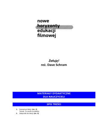 Żałuję! reż. Dave Schram MATERIAŁY DYDAKTYCZNE DLA NAUCZYCIELI SPIS TREŚCI 1. 2. Scenariusz lekcji. (str. 2) Temat: To zaszło za daleko. Załączniki do lekcji. (str. 5) SCENARIUSZ LEKCJI DLA KLAS GIMNAZJUM Opracowała: Wioletta Mrozek Temat: To zaszło za daleko. CELE LEKCJI Po lekcji uczeń: rozpoznaje intencje wypowiedzi (aprobatę, dezaprobatę, negację, prowokację); dostrzega w wypowiedzi ewentualne przejawy agresji i manipulacji; potrafi opisać odczucia, które budzi w nim dzieło; rozpoznaje problematykę utworu; omawia na podstawie poznanych dzieł literackich i innych tekstów kultury podstawowe, ponadczasowe zagadnienia egzystencjalne np.: miłość, przyjaźń, śmierć, cierpienie, lęk, nadzieja, wiara religijna, samotność, inność, poczucie wspólnoty, solidarność, sprawiedliwość; dostrzega i poddaje refleksji uniwersalne wartości humanistyczne; uczestniczy w dyskusji, uzasadnia własne zdanie, przyjmuje poglądy innych lub polemizuje z nimi. METODY I FORMY PRACY e-portfolio, drama, dyskusja, formy pracy: grupowa. ŚRODKI DYDAKTYCZNE slajdy przedstawiające głównych bohaterów filmu: Sanne, Jochema, Verę, Davida, Justina, Remco, Youssefa, Nielsa; notebooki z dostępnym Internetem (np.: zestaw Cyfrowa Szkoła); załączniki do lekcji: tekst piosenki, treść sceny filmowej – przemoc na stołówce; odtwarzacz DVD i wybrane fragmenty filmu Spijt!, reż. Dave Schram: 00:06:14–00:07:30 00:54:35–00:57:26 białe kartki, markery. CZAS 135 minut PRZEBIEG LEKCJI 1. Nauczyciel pokazuje uczniom wybrany fragment (czas: 00:06:14’-00:07:30’) filmu Spijt! w reżyserii Dave’a Schrama. 2. Nauczyciel zaprasza uczniów do analizy obejrzanej sceny filmowej. Pyta, co jest kluczowym problemem tej sceny. Uczniowie odpowiadają, że głównym tematem prezentowanej sceny jest agresja i znęcanie się nad Jochemem. Nauczyciel prosi o wymienienie bohaterów biorących udział w tej scenie: Sanne, Jochem, Vera, David, Justin, Remco, Youssef, Niels. Następnie wypisuje, w przypadkowej kolejności, nazwy ról, jakie te osoby pełniły względem siebie: znęcający się, ofiara, obrońca, dołączający się, dopingujący, outsider. 3. Nauczyciel proponuje wykonanie ćwiczenia testowego (załącznik nr 1), aby pomóc uczniom w ustaleniu na czym polegały postawy i role bohaterów filmu. Następnie prosi o zaklasyfikowanie poszczególnych bohaterów filmu do ról wymienionych w ćwiczeniu. Wyświetla zdjęcia bohaterów: Sanne, Jochema, Very, Davida, Justina, Remco, Youssefa, Nielsa. Uczniowie nazywają role tych osób: znęcający się – Sanne ofiara – Jochem obrońca – Vera (David) dołączający się – Justin, Remco dopingujący – Youssef outsider – Niels, David 4. Nauczyciel dzieli klasę na 6 grup, każda z nich losuje wybraną postać. Uczniowie mają wziąć pod uwagę następujące informacje o tych osobach: jak wygląda ich dom lub rodzice, w czym są dobrzy, z kim się przyjaźnią, o czym marzą, jakiej muzyki słuchają, jak się ubierają, czy są popularni w grupie, co myślą o Jochemie lub o sobie, jeśli wylosowaną postacią jest Jochem. itp. Zadaniem grup jest stworzenie fikcyjnego profilu na Facebooku wylosowanego bohatera. Uczniowie mają do dyspozycji komputer z dostępem do Internetu, folder z informacjami o filmie i zdjęciami bohaterów. Tworząc profil, mogą wykorzystać informacje z filmu, komentarze innych bohaterów. Mogą tworzyć fikcyjne konwersacje i komentarze na profilu, tak, aby profil wyglądał na jak najbardziej wiarygodny. 5. Grupy prezentują swoich bohaterów, jednocześnie uzasadniając, dlaczego dana osoba odgrywa konkretną rolę (z załącznika nr 1). Nauczyciel rozdaje uczniom tekst piosenki Davida (załącznik nr 2) i pokazuje kolejną scenę filmową (czas: 00:54:35–00:57:26) – scenę znęcania się nad Jochemem w czasie imprezy. Pyta, na czym polega kluczowa różnica między sposobem znęcania się nad chłopakiem w obu przypadkach. Uczniowie dyskutują, a nauczyciel może zasugerować, aby szukali podpowiedzi w piosence Davida. Tu uczniowie powinni wskazać słowa – To zaszło za daleko. Scena podczas imprezy jest o wiele bardziej brutalna od poprzedniej. Tutaj gniew rozrasta się z ogromną siłą. Młodzi nie muszą się kontrolować, bo są na imprezie i nie ma nad nimi nadzoru. Nauczyciel powiedział im wcześniej, że jest ślepy i wielu rzeczy nie widzi. Tutaj też ci, którzy mogliby być obrońcami Jochema przeżywają własne konflikty i to ich oddala od kolegi. 6. W tym momencie lekcji prowadzący podaje temat lekcji: To zaszło za daleko. 7. Nauczyciel pyta, która ze scen przemocy była łatwiejsza do zahamowania, powstrzymania. Uczniowie odpowiadają, że chodzi o scenę na stołówce. Nauczyciel prosi o zainscenizowanie sceny stołówkowej w sposób wierny filmowi. Do inscenizacji zgłaszają się pojedyncze osoby z sześciu wcześniej powołanych grup. Każdy z tych uczniów będzie reprezentować osobę wylosowaną do wcześniejszego zadania, czyli z grupy Jochema zgłasza się odtwórca jego postaci itp. Osoby po ponownym zapoznaniu się ze sceną filmową (można przedstawić skrót w wersji spisanej – załącznik nr 3) odtwarzają scenę ze stołówki. 8. Nauczyciel prosi aktorów, aby zatrzymali się w ostatnim ruchu scenicznym. Przykleja im na plecy duże białe kartki. Osoby, które nie brały udziału w ćwiczeniu, a tylko je oglądały, podchodzą do aktorów i wypisują emocje, jakie według nich powinny być widoczne na twarzach aktorów. Następnie każdy z aktorów dostaje kartkę i dopisuje własne propozycje emocji, które odczuwał, wcielając się w rolę. Kartki z pleców i kartki aktorów są porównywane na forum. Można poprowadzić dyskusję wokół zawartości tych kartek, aby pokazać pobudki postępowania bohaterów. Na zakończenie aktorzy mogą podsumować informacje o emocjach swoich postaci, np.: Aktor–David powie: Nie miałem odwagi zareagować bardziej, d
