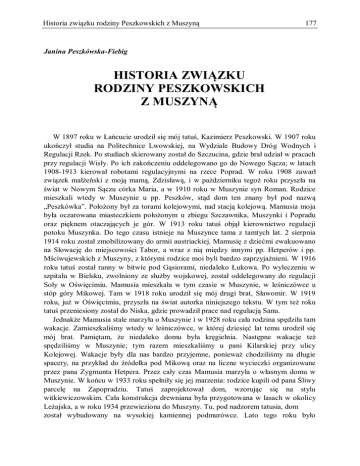 Historia związku rodziny Peszkowskich z Muszyną 177 Janina Peszkówska-Fiebig HISTORIA ZWIĄZKU RODZINY PESZKOWSKICH Z MUSZYNĄ W 1897 roku w Łańcucie urodził się mój tatuś, Kazimierz Peszkowski. W 1907 roku ukończył studia na Politechnice Lwowskiej, na Wydziale Budowy Dróg Wodnych i Regulacji Rzek. Po studiach skierowany został do Szczucina, gdzie brał udział w pracach przy regulacji Wisły. Po ich zakończeniu oddelegowano go do Nowego Sącza; w latach 1908-1913 kierował robotami regulacyjnymi na rzece Poprad. W roku 1908 zawarł związek małżeński z moją mamą, Zdzisławą, i w październiku tegoż roku przyszła na świat w Nowym Sączu córka Maria, a w 1910 roku w Muszynie syn Roman. Rodzice mieszkali wtedy w Muszynie u pp. Peszków, stąd dom ten znany był pod nazwą „Peszkówka”. Położony był za torami kolejowymi, nad stacją kolejową. Mamusia moja była oczarowana miasteczkiem położonym u zbiegu Szczawnika, Muszynki i Popradu oraz pięknem otaczających je gór. W 1913 roku tatuś objął kierownictwo regulacji potoku Muszynka. Do tego czasu istnieje na Muszynce tama z tamtych lat. 2 sierpnia 1914 roku został zmobilizowany do armii austriackiej. Mamusię z dziećmi ewakuowano na Słowację do miejscowości Tabor, a wraz z nią między innymi pp. Hetperów i pp. Mściwujewskich z Muszyny, z którymi rodzice moi byli bardzo zaprzyjaźnieni. W 1916 roku tatuś został ranny w bitwie pod Gąsiorami, niedaleko Łukowa. Po wyleczeniu w szpitalu w Bielsku, zwolniony ze służby wojskowej, został oddelegowany do regulacji Soły w Oświęcimiu. Mamusia mieszkała w tym czasie w Muszynie, w leśniczówce u stóp góry Mikowej. Tam w 1918 roku urodził się mój drugi brat, Sławomir. W 1919 roku, już w Oświęcimiu, przyszła na świat autorka niniejszego tekstu. W tym też roku tatuś przeniesiony został do Niska, gdzie prowadził prace nad regulacją Sanu. Jednakże Mamusia stale marzyła o Muszynie i w 1928 roku cała rodzina spędziła tam wakacje. Zamieszkaliśmy wtedy w leśniczówce, w której dziesięć lat temu urodził się mój brat. Pamiętam, że niedaleko domu była kręgielnia. Następne wakacje też spędziliśmy w Muszynie; tym razem mieszkaliśmy u pani Kilarskiej przy ulicy Kolejowej. Wakacje były dla nas bardzo przyjemne, ponieważ chodziliśmy na długie spacery, na przykład do źródełka pod Mikową oraz na liczne wycieczki organizowane przez pana Zygmunta Hetpera. Przez cały czas Mamusia marzyła o własnym domu w Muszynie. W końcu w 1933 roku spełniły się jej marzenia: rodzice kupili od pana Śliwy parcelę na Zapopradziu. Tatuś zaprojektował dom, wzorując się na stylu witkiewiczowskim. Cała konstrukcja drewniana była przygotowana w lasach w okolicy Leżajska, a w roku 1934 przewieziona do Muszyny. Tu, pod nadzorem tatusia, dom został wybudowany na wysokiej kamiennej podmurówce. Lato tego roku było Janina Peszkowska-Fiebig 178 niełaskawe, padały ulewne deszcze, które spowodowały wielką powódź i dały się nam mocno we znaki. Z powodu silnej wilgoci belki modrzewiowe wypaczyły się i trzeba było je naprostowywać. Mimo tych trudności jesienią budynek nadawał się już do zamieszkania i święta Bożego Narodzenia spędziliśmy w „Naszym Domku” — tak „ochrzciliśmy” nasz dom. U stóp willi, położonej na zboczu Suchej Góry, na naszych oczach — dzięki staraniom wspaniałego ówczesnego burmistrza Antoniego Jurczaka i równie wspaniałego doktora Seweryna Mściwujewskiego — zostały wybudowane łazienki mineralne. Muszyna została zarejestrowana jako zdrój. W istniejącej wtedy nad Popradem muszli koncertowej odbywały się występy wielu artystów. W sezonach letnich 1935-1939 mamusia prowadziła w willi pensjonat, natomiast na święta Bożego Narodzenia zjeżdżała się liczna rodzina. W 1936 roku w kościele pod wezwaniem św. Józefa odbył się ślub mojej siostry Marii. Na stałe mieszkaliśmy wtedy w Stanisławowie, tatuś regulował Dniestr. Wejście wojsk sowieckich 17 września 1939 roku i zajęcie Stanisławowa pozbawiło naszą rodzinę dorobku całego życia; jedyne co nam pozostało, to dom w Muszynie, który okazał się być azylem dla rodziny, zwłaszcza po powstaniu warszawskim. Z siostrą mieszkałam w Trzebini, gdzie przed wybuchem wojny pracował jej mąż. Zginął w Katyniu. Z Trzebini ja i siostra, wraz z dziećmi, zostałyśmy wywiezione przez Niemców do obozu. Po uwolnieniu w grudniu w 1942 roku przyjechałyśmy do Muszyny. Dostałam pracę w Krynicy, w aptece magistra Nitribitta w Nowym Domu Zdrojowym, poza tym udzielałam lekcji łaciny i matematyki. Warunki materialne były ciężkie, tatuś zmuszony był oddać parkiet przygotowany do położenia w pokojach młynarzowi, panu Nowakiewiczowi, w zamian za mąkę, z której prawie do końca okupacji mamusia piekła wspaniały chleb. Mieliśmy też kozy, które dawały doskonałe mleko dla dzieci. Najgorszy okres rodzina przeżyła po wkroczeniu Rosjan. Przyszedł nam wtedy z pomocą ówczesny proboszcz, ksiądz Kazimierz Zatorski, zlecając ojcu wykonywanie różnych prac. Także burmistrz (nie pamiętam nazwiska) zlecił tatusiowi wykonanie planu zagospodarowania terenów na Zapopradziu. Gdy powstało gimnazjum, tatuś uczył w nim łaciny, matematyki i gimnastyki. Również siostra została nauczycielką, uczyła języka francuskiego i... też gimnastyki. Do dziś starsi mieszkańcy Muszyny wspominają lekcje prowadzone przez tatusia i siostrę. W roku 1946 rodzice przenieśli się do Poznania, a siostra po zamknięciu gimnazjum muszyńskiego w 1949 roku zamieszkała w Kętach. Ja również wyjechałam do Poznania, gdzie kontynuowałam studia rozpoczęte przed wojną. Mój starszy brat Roman skończył studia na Politechnice Gdańskiej. Brał udział w kampanii wrześniowej i dostał się do niewoli niemieckiej. Po wojnie pracował w stoczni w Gdańsku. Zmarł w Kanadzie w roku 1998. Młodszy brat, Sławomir,