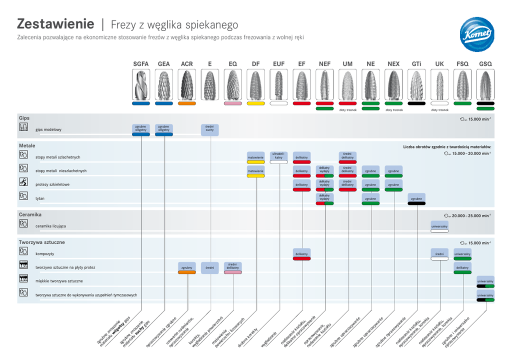Zestawienie | Frezy z węglika spiekanego Zalecenia pozwalające na ekonomiczne stosowanie frezów z węglika spiekanego podczas frezowania z wolnej ręki SGFA GEA ACR E EQ DF EUF EF NEF UM NE złoty trzonek NEX GTi złoty trzonek UK FSQ złoty trzonek Gips π (15.000 min–1 zgrubne wilgotny gips modelowy zgrubne wilgotny średni suchy Metale ~ ~ ® ~ Liczba obrotów zgodnie z twardością materiałów: stopy metali szlachetnych matowienie stopy metali nieszlachetnych matowienie ultradelikatny protezy szkieletowe (15.000 – 20.000 min–1 średni delikatny delikatny delikatny delikatny wydajny średni delikatny zgrubne zgrubne delikatny delikatny wydajny średni delikatny zgrubne zgrubne delikatny wydajny tytan zgrubne zgrubne Ceramika ~ (20.000 – 25.000 min–1 ceramika licująca uniwersalny Tworzywa sztuczne (15.000 min–1 kompozyty delikatny tworzywo sztuczne na płyty protez zgrubny średni średni delikatny średni uniwersalny delikatny uniwersalny tworzywa sztuczne do wykonywania uzupełnień tymczasowych uniwersalny n de ada lik wa at ni ne e op ksz r a t ał co tu op wy , na ra wa da co ni wa wy e ni wa e ni ks e, zt ałt u zg ru bn e op ra co wy wa zg ni ru e bn e op ra co wy wa zg ru ni e bn e op ra co wy n wa op ada ni ra wa e co n wy ie wa ksz ni tał e, tu n ko , op ada re kt ra wa a co n wy ie wa ksz ni tał e, tu z ko , re op gru kt ra bn a co e i wy un wa iw ni ers e a ln e miękkie tworzywa sztuczne z m gr u at bn er e iał zn u os w ze ilg n ot ie zg ny m ru gip at bn er e s iał zn u os su ze ch ni y e gip op s ra co wy wa ni e zg u ru op suw bn ra an e co ie wy n wa adm ni ia e ró k w, wy ore gła kty , dz an ie po wi m er po ato zc wi wi hn er en i zc ie hn il ico wa ny dr ob ch ne ko re kt y wy gła dz an ie ~ ø ø ~ GSQ Zalecenia dot. stosowania GEA ACR E Bezpieczne ostrza z uzębieniem podstawowym lewoskrętnym oznaczone literą "A" oraz pierścieniem w kolorze niebieskim pewne utrzymanie frezu w tulei zaciskowej zapewniają bezpieczną pracę również w przypadku wysokiej liczby obrotów i dużej wydajności skrawania Uzębienie naprzemianskośne powoduje, że ostrza instrumentu tworzą pojedyncze elementy zwrócone do siebie krótkie, ziarniste wióry powstające podczas obróbki nie wbijają się w skórę lekka, prawie niewymagająca nacisku praca gładkie i błyszczące powierzchnie UM * NE NEX* GTi EF UK* EUF FSQ Ostrza tworzące kształt piramidy zbieżnej praca przypominająca szlifowanie delikatnie zmatowione powierzchnie Ostrza do łatwiej obróbki stopów metali twardych niewielki opór przy obróbce materiałów ciągliwych nieznaczna ilość powstającego ciepła gladka powierzchnia NEF EQ DF Opatentowane potrójne ostrza do obróbki metalu niewielki nacisk = gładsze powierzchnie większy nacisk = intensywniejsze usuwanie materiału GSQ nie powoduje zacierania materiału Ostrza prawoskrętne/prawoskrętne ułatwiające obróbkę licującego tworzywa sztucznego, ceramiki przed napaleniem glazury oraz obszarów przejścia w strukturę metalową oznaczenie kolorystyczne Ostrza z nacięciami poprzecznymi ułatwiające obróbkę tworzywa sztucznego dzielące wióry na małe segmenty bardzo mały opór przy obróbce materiałów elastycznych i ciągliwych nie powoduje zacierania materiału UWAGA: pracować wyłącznie w stronę ciała * złoty trzonek Wskazówki dot. stosowania: Pozwalające na zachowanie długiego okresu użytkowania i zapewniające efektywną pracę znacznik laserowy oznaczenie rodzaju ostrzy Liczba obrotów: Używając frezów należy przestrzegać zalecanej liczby obrotów oraz siły nacisku 2-4N. Prostnica powinna obracać się spokojnie (bez drgań) ze stałą liczbą obrotów. Konserwacja prostnicy: Aby zapewnić właściwe działanie, frez należy umieścić w zacisku aż po szyjkę. Zacisk prostnicy musi być regularnie czyszczony. Widoczne na frezie ślady zużycia sygnalizują konieczność wymiany. Konserwacja frezu: Wióry metalu przylegające do ostrzy utrudniają efektywną pracę. Do czyszczenia zabrudzonego frezu stosuje się szczotkę do czyszczenia metalu 9791 lub 9785. Komet Dental · Gebr. Brasseler GmbH & Co. KG · Postfach 160 · 32631 Lemgo · Export: Telefon +49 (0) 5261 701-0 · Telefax +49 (0) 5261 701-329 · [email protected] · www.kometdental.pl © 08/2012 · Gebr. Brasseler · Germany · Printed in Germany · 410809V0 SGFA
