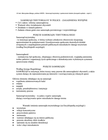 Dr hab. Mieczysław Miazga, profesor WSPA - Samorząd terytorialny i społeczności lokalne (konspekt wykładu - część I) SAMORZĄD TERYTORIALNY W POLSCE – ZAGADNIENIA WSTĘPNE Cel i zakres reformy samorządowej Ważność sfery świadomości obywateli Działanie w ramach państwa Zadania własne gmin oraz samorządu powiatowego i wojewódzkiego POJĘCIE SAMORZĄDU TERYTORIALNEGO Samorząd terytorialny - to instytucja społeczna, w której wybrani członkowie zbiorowości dysponują uprawnieniami do podejmowania i koordynowania społecznie doniosłych działań związanych z zaspokajaniem potrzeb publicznych mieszkańców danego terytorium (według Encyklopedii socjologii) Samorządność - normatywny ład społeczny, obejmujący zbiorową podmiotowość, względną autonomię wobec państwa i organizację życia społecznego z demokratycznie wyłonionym systemem sprawowania władzy POJĘCIE SAMORZĄDU Według Jerzego Regulskiego SAMORZĄD to instytucja, która tworzy ramy prawne dla samorządności obywateli, a także system służący do reprezentowania jej interesów i rozwiązywania jej własnych spraw Główne elementy składające się na samorząd: wspólnota zainteresowanych ludzi ► władze ► majątek ► urzędy, przedsiębiorstwa i instytucje ► ► instrumenty prawne Samorząd terytorialny – to jeden z typów samorządu służący rozwiązywaniu spraw mieszkańców danego terenu ► ► ► ► ► ► ► ► Warunki istnienia samorządu terytorialnego (za Encyklopedią socjologii:) terytorium relacje koncentryczne przyzwolenie państwa autonomia wartości składające się na interes publiczny prawnie określony zbiór środków opieranie się na zasadzie demokracji wola i chęci mieszkańców ANALIZA POJĘCIA SAMORZĄDU Samorząd w węższym znaczeniu (za prof. Zbigniewem Leońskim) - zbiorowość powołana przez przepisy prawa w celu sprawowania funkcji administracji publicznej w formach zdecentralizowanych. Cechy samorządu składające się na jego istotę: zabezpieczenie prawne ► obligatoryjność ► wykonywanie zadań administracji publicznej ► samodzielność (zasada decentralizacja); ► nadzór wyłącznie w formach przewidzianych ustawą Występowanie różnych form samorządu: terytorialnego, gospodarczego, zawodowego itd. ► ► ► ► GWARANCJE PRAWNO-USTROJOWE Zmiany Konstytucji ustawa z 8 marca 1990 r. o zmianie Konstytucji RP ustawa z 17 października 1992 r. Aktualna ustawa konstytucyjna z 1997 r. - rozdział VII i inne artykuły Tzw. ustawy samorzadowe: ustawa z 8 marca 1990 r. o samorządzie terytorialnym, która była wielokrotnie nowelizowana i obecnie nosi nazwę ustawy o samorządzie gminnym ustawa z 5 czerwca 1998 r. o samorządzie powiatowym ustawa z 5 czerwca 1998 r. o samorządzie województwa Ustawy uzupełniające – np. ustawa z 22 marca 1990 r. o pracownikach samorządowych Zawartość najważniejszych przepisów: obligatoryjny charakter samorządu ► ► gmina, powiat i województwo - jako „wspólnota” oraz „terytorium” ► samorząd wykonawcą „zadań publicznych” ► samodzielny charakter gminy, powiatu i samorządowego województwa, ochrona sądowa, posiadanie osobowości prawnej i inne Europejska Karta Samorządu Terytorialnego - międzynarodowa konwencja ratyfikowana przez Polskę 26 kwietnia 1993 r. „Samorząd terytorialny oznacza prawo i zdolność społeczności lokalnej, w granicach określonych prawem, do kierowania i zarządzania zasadniczą częścią spraw publicznych na ich własną odpowiedzialność i w interesie ich mieszkańców” (według Karty) Zobowiązanie państw członkowskich do przyjęcia pewnych reguł, w tym zwłaszcza takich jak: ustawowe regulowanie problematyki samorządu terytorialnego prawo wyłaniania organów przedstawicielskich w wyborach - wolnych, tajnych, równych, bezpośrednich i powszechnych uznanie, że do samorządu należą wszystkie sprawy lokalne (z wyłączeniem tych, które ustawowo są przekazywane innym organom) ochrona granic terytorialnych ZASADA POMOCNICZOŚCI Zasada pomocniczości (subsydiarności) - sformułowana na gruncie katolickiej nauki społecznej przez Piusa XI w Encyklice „Quadrogesimo anno”: „...nie wolno jednostkom wydzierać i na społeczeństwo przenosić tego, co mogą wykonać z własnej inicjatywy i własnymi siłami, podobnie niesprawiedliwością, szkodą społeczną i zakłóceniem porządku jest zabierać mniejszym i niższym społecznościom te zadania, które mogą spełnić i przekazywać je społecznościom większym i wyższym”. Problem częstego niezrozumienia zasady pomocniczości Elementy zasady pomocniczości: Człowiek podstawowym podmiotem - wszelkie instytucje jedynie jednostkami pomocniczymi Gmina zajmuje się jedynie tym, czego człowiek nie jest w stanie wykonać Powiat jest pomocniczy w stosunku do gminy, a województwo - w stosunku do powiatu; państwo ma być pomocnicze w stosunku do wszystkich organizacji działających w jego ramach i będących bliżej obywatela Władze Unii Europejskiej mogą zajmować się tylko takimi sprawami, których poszczególne kraje członkowskie nie są w stanie rozwiązać samodzielnie Odrzucenie zależności hierarchicznej Przywołanie zasady pomocniczości w Konstytucji RP Obowiązywanie w Unii Europejskiej DECENTRALIZACJA JAKO PODSTAWA REFORMY USTROJU TERYTORIALNEGO W POLSCE Decentralizacja ustawowe przekazanie uprawnień wraz z odpowiedzialnością za realizację pewnych zadań oraz środkami niezbędnymi do ich realizacji zmiana ustroju instytucjonalnego państwa, a nie tylko sposobu wykonywania zadań Z punktu widzenia prawno-administracyjnego - decentralizacja to taki system administracji, w którym podmioty administracyjne mają samodzielność w stosunku do władzy centralnej, a podporządkowanie hierarchiczne jest uchylone Przeciwieństwo centralizacji – czyli ustroju administracyjnego, w którym władza pozostaje skupiona w ręku organów państwowych, opartych na 