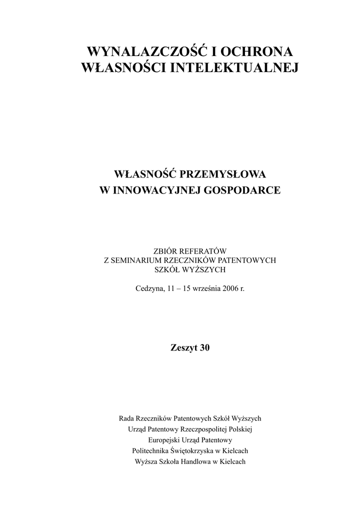 WYNALAZCZOŚĆ I OCHRONA WŁASNOŚCI INTELEKTUALNEJ WŁASNOŚĆ PRZEMYSŁOWA W INNOWACYJNEJ GOSPODARCE ZBIÓR REFERATÓW Z SEMINARIUM RZECZNIKÓW PATENTOWYCH SZKÓŁ WYŻSZYCH Cedzyna, 11 – 15 września 2006 r. Zeszyt 30 Rada Rzeczników Patentowych Szkół Wyższych Urząd Patentowy Rzeczpospolitej Polskiej Europejski Urząd Patentowy Politechnika Świętokrzyska w Kielcach Wyższa Szkoła Handlowa w Kielcach Ochrona własności intelektualnej: Z doświadczeń prac naukowo – badawczych w Finlandii ____________________________________________________________________________ Janusz Marszalec OCHRONA WŁASNOŚCI INTELEKTUALNEJ: Z DOŚWIADCZEŃ PRAC NAUKOWO – BADAWCZYCH W FINLANDII 1. Wstęp Finlandia to rozległy, rzadko zaludniony kraj o pięknej przyrodzie, trudnym klimacie i skąpych zasobach bogactw naturalnych ale także to jeden z najbogatszych krajów Unii Europejskiej i jedna z najbardziej konkurencyjnych gospodarek na świecie. Świadczą o tym m.in. wysoki produkt krajowy brutto na osobę (30.900 $ w 2005 roku) i wiodące miejsce na liście najbardziej konkurencyjnych gospodarek świata według World Competitivess Report 2006-2007 [1]. Przeszło 70% fińskich firm współpracuje z uniwersytetami i instytucjami naukowo – badawczymi, przy średniej dla krajów Unii Europejskiej około 25%. Finlandia zajmuje także drugie miejsce w świecie w liczbie patentów na 1 mln. mieszkańców. Finlandia wiele lat temu uznała, że ważną wartością dla przyszłości kraju jest wiedza i jej wdrażanie do praktyki przemysłowej. Potrafiła zbudować gospodarkę, której głównym motorem stały się zaawansowane technologie i z rozmachem rozwija społeczeństwo informacyjne; fińskie produkty i usługi w dużym stopniu oparte są na wiedzy, zaś wiele fińskich firm jest światowymi liderami w swoich obszarach biznesu. Przedstawione w publikacji doświadczenia wynikają z 10.-letniej pracy autora dla fińskich instytucji naukowo – badawczych, zarządzania pracami konsorcjów naukowo – przemysłowych, patentowania rozwiązań z dziedziny elektroniki i technologii informacyjnych oraz wdrażania rozwiązań do przemysłu w firmach ulokowanych w parku technologicznym Technopolis w Oulu i na terenie kraju. 2. Prace naukowo – badawcze w Finlandii Bardzo ważnym elementem prowadzonych w Finlandii prac naukowo – badawczych jest ścisła współpraca nauki z przemysłem. Szczegółowo opracowany i sprawnie funkcjonujący system przekazywania najnowszych zdobyczy badań podstawowych, osiągnięć zarówno fińskich jak i światowych ośrodków naukowych, poprzez etap badań stosowanych do praktyki przemysłowej, i zdolność kreowania produktów konkurencyjnych na rynek globalny to podstawowy cel tej współpracy. Model transferu wiedzy do praktyki przemysłowej zbudowany został w oparciu o tzw. zasadę trójkąta, którego wierzchołkami są: badania podstawowe, badania stosowane i wdrożenia rozwiązań do praktyki gospodarczej przez firmy (Rys. 1) [2]. Prace naukowo – badawcze finansowane częściowo z funduszy publicznych prowadzone są zwykle w 37 Ochrona własności intelektualnej: Z doświadczeń prac naukowo – badawczych w Finlandii ____________________________________________________________________________ konsorcjach naukowo – przemysłowych, skupiających w sobie specjalistów z dziedziny badań podstawowych, badań stosowanych i przedstawicieli kilku firm przemysłowych. Taka konstrukcja grupy badawczej zapewnia płynny i efektywny przepływ wiedzy od etapu badań podstawowych, przez etap badań stosowanych do wdrożeń w firmach, pozwalając jednocześnie na wzajemne wspomaganie się wszystkich trzech elementów systemu w rozwoju swojej wiedzy na dany temat i wzrostu kompetencji. Stosowane rozwiązanie pozwala na zgłaszanie w trakcie projektu naukowo – badawczego pytań i problemów z przemysłu i dostarczenie w krótkim terminie odpowiedzi na nie przez specjalistów sektora nauki w postaci wyników badań. Badania podstawowe Badania stosowane Wdrożenia Rys. 1. Zasada trójkąta we współdziałaniu nauki z przemysłem w Finlandii. Opisana wyżej metoda współpracy przedstawicieli nauki z praktykami z przemysłu, ich stała interakcja, ma podstawowe znaczenie dla powstawania w realizowanych projektach wartości intelektualnych w postaci nowych koncepcji, metod, rozwiązań, urządzeń, wzorów przemysłowych i praw autorskich, które mogą być przedmiotem ochrony. 3. Ochrona własności intelektualnej Własność wyników badań naukowych, w tym własności intelektualnych podlegających ochronie, określane są w pracach badawczych w umowie konsorcjum projektowego. Prawo do własność intelektualnej w konsorcjum uzależnione jest od wielkości wkładu finansowego członków konsorcjum do budżetu projektu. Często ze względu na duży udział finansowania z funduszy publicznych, własności intelektualne pozostają w gestii uniwersytetu lub publicznej placówki naukowo – badawczej, która może w późniejszym terminie zbyć posiadane prawa na rzecz firmy lub grupy firm. Wyniki badań zamawianych i finansowanych całkowicie przez przemysł przekazywane są przez instytucję naukowo – badawczą sponsorowi projektu jako wyniki prowadzonych prac badawczych, który staje się właścicielem wynalazków. Dla określenia innowacyjności realizowanych projektów badawczych, na etapie przygotowania projektu wykonywane są badania stanu wiedzy w danej dziedzinie, w tym 38 Ochrona własności intelektualnej: Z doświadczeń prac naukowo – badawczych w Finlandii ____________________________________________________________________________ badania patentowe. Pozwalają one na poziomie ogólnym określić potencjał nowych koncepcji, będących przedmiotem badań. Określa się, czy badania te są nowatorskie na poziomie kraju czy w skali światowej, co daje ogólną wizję przyszłych działań i kosztów (potrzebnego finansowania) w celach ochrony powstałych wł