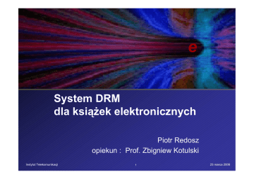 e System DRM dla książek elektronicznych Piotr Redosz opiekun : Prof. Zbigniew Kotulski Instytut Telekomunikacji 1 23 marca 2006 System DRM System DRM (Digital Right Management) to system zabezpieczeń mający za zadanie przeciwdziałać używaniu danych cyfrowych w sposób sprzeczny z zamiarem ich wydawcy i chronić prawa autorskie twórców. Wykorzystywany do ochrony: DVD - CSS (Content Scrambling System ) DTV - kody wbudowane w sygnał telewizji cyfrowej taśmy DAT - SCMS (Serial Copy Management System) EBOOK Instytut Telekomunikacji 2 23 marca 2006 System DRM Ebooki - Model marketingowy Czy dostarczono mi to za co zapłaciłem? Jak zabezpieczyć treść ? (autentyczną kopie) (kontrola dostępu) PRZEPŁYW INFORMACJI Ebook Opłata Instytut Telekomunikacji 3 23 marca 2006 System DRM Standaryzacja Open eBook Forum AAP Technology Group ONIX XrML User Group Open Ebook Standards Electronic Book Exchange OPIMA Int’l. DOI Foundation Open DRM Instytut Telekomunikacji Book Industry Study Group 4 23 marca 2006 System DRM Założenia dla systemu : Identyfikacja stron transakcji Bezpieczna dystrybucja książek elektronicznych Weryfikacja autentyczności treści Kontrolowany dostęp do treści Instytut Telekomunikacji 5 23 marca 2006 Cel pracy inżynierskiej Zaprojektowanie systemu DRM dla ebooków, tak aby spełniał założenia bezpieczeństwa Skupienie się na części kryptograficznej Implementacja systemu (platforma .NET) Instytut Telekomunikacji 6 23 marca 2006 Realizacja Aby zapewnić : identyfikację stron – wymiana certyfikatów X.509 bezpieczną dystrybucje książek – (TLS v.1 lub SSL v.3) autentyczność treści – podpis cyfrowy (ze wsparciem zewnętrznej biblioteki kryptograficznej SecureBlackBox v. 4.2.74) kontrolę dostępu do treści – mechanizm ewidencji sprzętu (WMI) Instytut Telekomunikacji 7 23 marca 2006 Realizacja Model systemu Serwer szyfruje i podpisuje ksiażkę dla klienta SSL/TLS Wymiana certyfikatów Klient Klient Serwer Serwer zamówienie The eBook by Scott Zakupiona książka jest ściśle powiązana z komputerem klienta Instytut Telekomunikacji Baza danych (XML) 8 23 marca 2006 Realizacja Model funkcjonalny Klient Serwer Secure PDF Secure PDF WMI WMI XMLDB DB XML Secure PDF Secure PDF UserBlock Block User ServerBlock Block Server SSL SSL SSL SSL WMI - Windows Management Instrumentation Instytut Telekomunikacji 9 23 marca 2006 Realizacja WMI - Windows Management Instrumentation Mechanizm ewidencji sprzętu (klient) Funkcje: 1. Pobranie numerów identyfikacyjnych (CPU, Płyty głównej,HDD,...) 2. Utworzenie skrótu jednoznacznie identyfikującego komputer Instytut Telekomunikacji 10 23 marca 2006 Realizacja WMI - Windows Management Instrumentation CIM - Common Information Model Providerzy są podpięci do CIMOM za pomocą interfejsów COM architektura Instytut Telekomunikacji 11 23 marca 2006 Realizacja Secure PDF Mechanizm zabezpieczenia książki (z wykorzystaniem biblioteki kryptograficznej SecureBlackBox v. 4.2.74) Funkcje: 1. 2. 3. 4. Szyfrowanie książki elektronicznej (serwer) Zabezpieczenie treści podpisem cyfrowym (serwer) Sprawdzenie zgodności sprzętu stacji roboczej (klient) Odszyfrowanie książki elektronicznej (klient) Instytut Telekomunikacji 12 23 marca 2006 Realizacja User Blok / Server Blok Mechanizmy obsługi transakcji Funkcje: 1. Rejestracja nowego użytkownika (serwer) 2. Edycja i dodawanie stacji roboczych (serwer) (jeden użytkownik i kilka komputerów) 3. Pobranie listy dostępnych książek (klient) 4. Zamawianie książek (klient) 5. Wyświetlanie książki (klient) Instytut Telekomunikacji 13 23 marca 2006 Realizacja Data Base (plik XML) Baza danych Przechowuje : 1. Profile użytkowników 2. Listy zakupionych książek 3. Dane potrzebne do rozliczania klienów Instytut Telekomunikacji 14 23 marca 2006 Realizacja SSL (Secure Socket Layer) Mechanizm bezpiecznej transmisji danych (z wykorzystaniem biblioteki kryptograficznej SecureBlackBox v. 4.2.74) Funkcje: 1. Uwierzytelnienie stron transakcji (wymiana certyfikatów) 2. Szyfrowanie połączenia Instytut Telekomunikacji 15 23 marca 2006 Pytania Instytut Telekomunikacji 16 23 marca 2006 Koniec Dziękuje za uwagę. Instytut Telekomunikacji 17 23 marca 2006