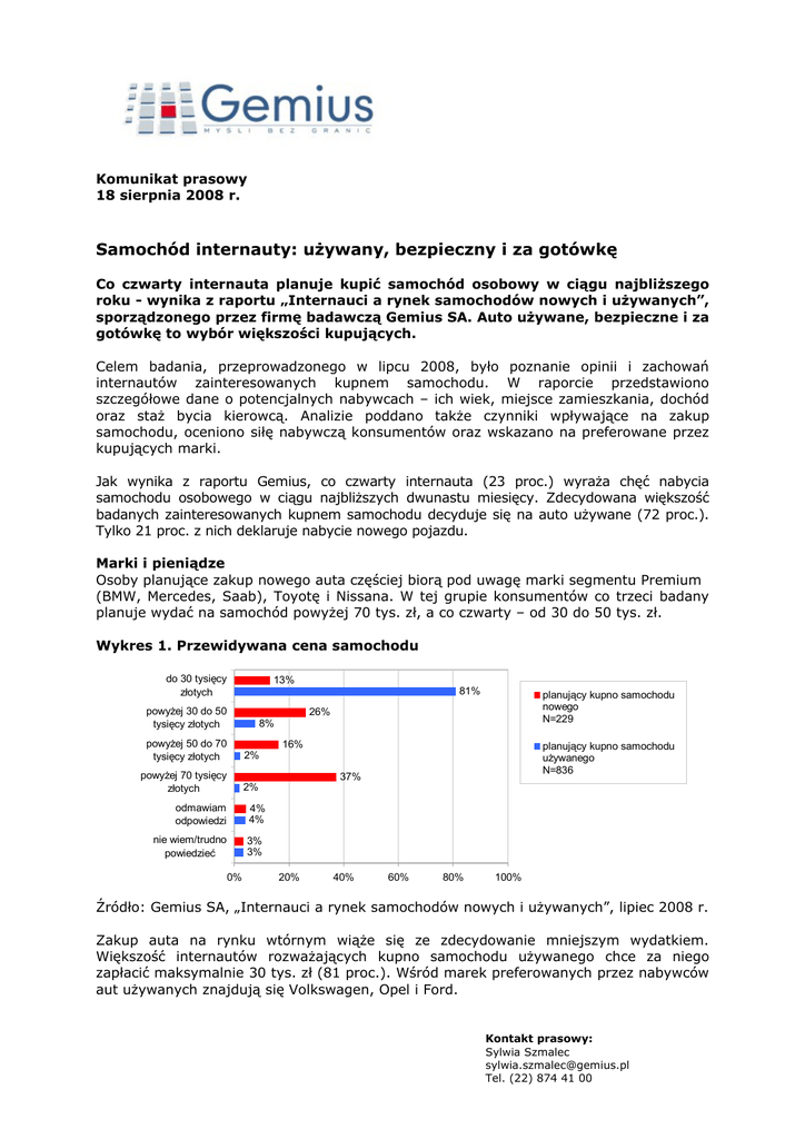 Komunikat prasowy 18 sierpnia 2008 r. Samochód internauty: używany, bezpieczny i za gotówkę Co czwarty internauta planuje kupić samochód osobowy w ciągu najbliższego roku - wynika z raportu „Internauci a rynek samochodów nowych i używanych”, sporządzonego przez firmę badawczą Gemius SA. Auto używane, bezpieczne i za gotówkę to wybór większości kupujących. Celem badania, przeprowadzonego w lipcu 2008, było poznanie opinii i zachowań internautów zainteresowanych kupnem samochodu. W raporcie przedstawiono szczegółowe dane o potencjalnych nabywcach – ich wiek, miejsce zamieszkania, dochód oraz staż bycia kierowcą. Analizie poddano także czynniki wpływające na zakup samochodu, oceniono siłę nabywczą konsumentów oraz wskazano na preferowane przez kupujących marki. Jak wynika z raportu Gemius, co czwarty internauta (23 proc.) wyraża chęć nabycia samochodu osobowego w ciągu najbliższych dwunastu miesięcy. Zdecydowana większość badanych zainteresowanych kupnem samochodu decyduje się na auto używane (72 proc.). Tylko 21 proc. z nich deklaruje nabycie nowego pojazdu. Marki i pieniądze Osoby planujące zakup nowego auta częściej biorą pod uwagę marki segmentu Premium (BMW, Mercedes, Saab), Toyotę i Nissana. W tej grupie konsumentów co trzeci badany planuje wydać na samochód powyżej 70 tys. zł, a co czwarty – od 30 do 50 tys. zł. Wykres 1. Przewidywana cena samochodu do 30 tysięcy złotych 13% powyżej 30 do 50 tysięcy złotych 2% powyżej 70 tysięcy złotych 2% odmawiam odpowiedzi planujący kupno samochodu nowego N=229 26% 8% powyżej 50 do 70 tysięcy złotych 81% 16% planujący kupno samochodu używanego N=836 37% 4% 4% nie wiem/trudno powiedzieć 3% 3% 0% 20% 40% 60% 80% 100% Źródło: Gemius SA, „Internauci a rynek samochodów nowych i używanych”, lipiec 2008 r. Zakup auta na rynku wtórnym wiąże się ze zdecydowanie mniejszym wydatkiem. Większość internautów rozważających kupno samochodu używanego chce za niego zapłacić maksymalnie 30 tys. zł (81 proc.). Wśród marek preferowanych przez nabywców aut używanych znajdują się Volkswagen, Opel i Ford. Kontakt prasowy: Sylwia Szmalec [email protected] Tel. (22) 874 41 00 Wymarzony samochód Przy wyborze odpowiedniego samochodu najwyższą wagę polscy internauci przykładają do bezpieczeństwa. Sprawia to, że poduszki powietrzne i ABS są najczęściej poszukiwanymi przez potencjalnych nabywców elementami wyposażenia. Badani planujący zakup auta mają na uwadze także wygodę. Klimatyzacja, wspomaganie kierownicy i centralny zamek – to czynniki ważne zarówno przy zakupie aut nowych, jak i używanych. Wybór przez internet W raporcie poddano analizie również źródła, z których ankietowani czerpią wiedzę na temat motoryzacji. Podstawowym narzędziem jest nieodzownie internet i właśnie to medium jest najczęściej wybierane przez użytkowników sieci planujących zakup samochodu. Wśród potencjalnych nabywców popularne są zarówno serwisy tematyczne, jak i fora internetowe. Ponadto uznaniem kupujących na rynku pierwotnym cieszą się oficjalne strony producentów bądź dealerów. Inaczej jak w przypadku nabywców aut używanych, którzy preferują nieoficjalne serwisy oraz kluby użytkowników samochodów danej marki. Wykres 2. Internetowe źródła informacji pomocne przy wyborze samochodu 54% serwisy motoryzacyjne 63% opinie na forach motoryzacyjnych 52% 62% oficjalna strona producenta/importera 50% 25% 46% strona dealera 15% serwisy (kluby) użytkowników danej marki planujący kupno samochodu nowego N=151 26% 35% nieoficjalne strony poświęcone danej marce inne 0% 22% planujący kupno samochodu używanego N=660 37% 3% 4% 10% 20% 30% 40% 50% 60% 70% 80% 90% 100% N – respondenci, którzy w ciągu roku zamierzają kupić samochód i poszukują w internecie informacji przydatnych przy wyborze auta. Źródło: Gemius SA, „Internauci a rynek samochodów nowych i używanych”, lipiec 2008 r. Niezależnie od tego, czy kupowany samochód ma być nowy czy używany, najpopularniejszą formą sfinansowania transakcji jest płatność gotówką (planujący zakup nowego samochodu – 56 proc., używanego – 62 proc.). Co ciekawe, większość polskich internautów, którzy noszą się z zamiarem kupna samochodu na rynku wtórnym, bierze pod uwagę sprowadzenie auta z zagranicy (70 proc.), głównie z krajów Europy Zachodniej. Kontakt prasowy: Sylwia Szmalec [email protected] Tel. (22) 874 41 00 O badaniu - Badanie zrealizowano za pomocą ankiet emitowanych na witrynach internetowych korzystających z bezpłatnej wersji systemu stat24 lub bezpłatnego audytu site-centric stat.pl/PBI. Ankiety były emitowane losowo w okresie od 2 do 22 lipca 2008 roku. Analizą objęto 5 006 internautów w wieku co najmniej 16 lat, którzy wypełnili ankietę do końca. Z grupy tej wyodrębniono 1 152 osób planujących w ciągu najbliższego roku dokonać zakupu samochodu. W analizach prezentujących świadomość marek, cechy badanych związane z motoryzacją oraz profil demograficzny badanych przedstawiono również dodatkowo wyniki dla ogółu badanych, w tym tych nieplanujących zakupu auta. Większość dalszych analiz obejmowała grupę zainteresowaną zakupem auta w ciągu roku od badania, w podziale na internautów planujących nabyć samochód nowy (N=229) oraz internautów planujących zakup używanego auta (N=836). Aby dane były reprezentatywne dla całej populacji internautów, odpowiedzi analizowano z wykorzystaniem wagi analitycznej, skonstruowanej na podstawie danych o płci i wieku internautów oraz o ich częstotliwości korzystania z internetu, pochodzących z badania Omnibus PBS (I-II 2008). Gemius SA – firma badawcza, lider i prekursor w dziedzinie badań internetu w Europie Środkowo-Wschodniej. Na rynku polskim istnieje od 1999 roku, oferując profesjonalne rozwiązania badawcze, usługi analityczne i doradcze dla wszystkich podmiot