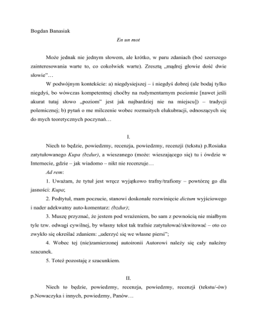 Bogdan Banasiak En un mot Może jednak nie jednym słowem, ale krótko, w paru zdaniach (boć szerszego zainteresowania warte to, co cokolwiek warte). Zresztą „mądrej głowie dość dwie słowie”… W podwójnym kontekście: a) niegdysiejszej – i niegdyś dobrej (ale bodaj tylko niegdyś, bo wówczas kompetentnej choćby na rudymentarnym poziomie [nawet jeśli akurat tutaj słowo „poziom” jest jak najbardziej nie na miejscu]) – tradycji polemicznej; b) pytań o me milczenie wobec rozmaitych elukubracji, odnoszących się do mych teoretycznych poczynań… I. Niech to będzie, powiedzmy, recenzja, powiedzmy, recenzji (tekstu) p.Rosiaka zatytułowanego Kupa (bzdur), a wieszanego (może: wieszającego się) tu i ówdzie w Internecie, gdzie – jak wiadomo – nikt nie recenzuje… Ad rem: 1. Uważam, że tytuł jest wręcz wyjątkowo trafny/trafiony – powtórzę go dla jasności: Kupa; 2. Podtytuł, mam poczucie, stanowi doskonałe rozwinięcie dictum wyjściowego i nader adekwatny auto-komentarz: (bzdur); 3. Muszę przyznać, że jestem pod wrażeniem, bo sam z pewnością nie miałbym tyle tzw. odwagi cywilnej, by własny tekst tak trafnie zatytułować/skwitować – oto co zwykło się określać zdaniem: „uderzyć się we własne piersi”; 4. Wobec tej (nie)zamierzonej autoironii Autorowi należy się cały należny szacunek. 5. Toteż pozostaję z szacunkiem. II. Niech to będzie, powiedzmy, recenzja, powiedzmy, recenzji (tekstu/-ów) p.Nowaczyka i innych, powiedzmy, Panów… En reponse: „Sokratesa nieraz spotykała czynna zniewaga w wyniku prowadzonej przez niego dysputy, lecz znosił to cierpliwie; kiedy pewnego razu ktoś go kopnął, przyjął to ze spokojem, a gdy ktoś się temu dziwił, rzekł: «A gdyby kopnął mnie osioł, czy pozwałbym go przed sąd?» (Diogenes Laertios, II, 21)”1. En conclusion: Jak wiadomo: „psy szczekają, a karawana idzie dalej”. [En marge 1: Mam nadzieję, że Towarzystwo Opieki nad Zwierzętami nie poczuje się dotknięte tym sformułowaniem – do czego zresztą miałoby ono pełne i niekwestionowane prawo. Toteż z góry najuprzejmiej przepraszam Towarzystwo Opieki nad Zwierzętami.] [En marge 2: Odkąd pamiętam, dwie rzeczy napawały mnie szczerym zdumieniem: nieskończoność wszechświata i nieskończoność ludzkiej głupoty; i tylko nie wiem, która z nich większym. A ressentiment po prostu pominę.] 1 A. Schopenhauer, W poszukiwaniu mądrości życia. Parerga i paralipomena, t. I, przeł. J. Garewicz, PWN, Warszawa 2002, s. 474.