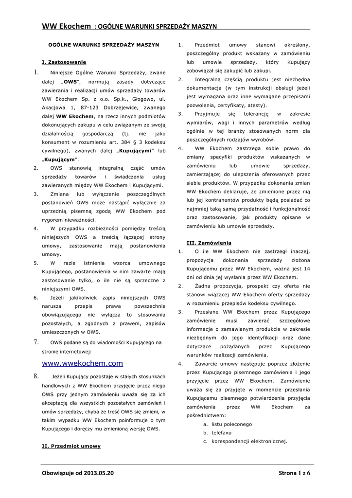 WW Ekochem : OGÓLNE WARUNKI SPRZEDAŻY MASZYN OGÓLNE WARUNKI SPRZEDAŻY MASZYN 1. Przedmiot umowy stanowi określony, poszczególny produkt wskazany w zamówieniu I. Zastosowanie 1. lub Niniejsze Ogólne Warunki Sprzedaży, zwane dalej „OWS”, normują zasady dotyczące 2. 87-123 Dobrzejewice, 3. gospodarczą (tj. nie 4. „Kupującym”. OWS stanowią sprzedaży integralną towarów i część umów świadczenia usług Zmiana lub wyłączenie a W treścią zastosowanie razie łączącej mają istnienia wzorca narusza przepis obowiązującego nie zapis niniejszych prawa 1. wyłącza to stosowania handlowych z WW Ekochem przyjęcie przez niego OWS przy jednym zamówieniu uważa się za ich akceptację dla wszystkich pozostałych zamówień i umów sprzedaży, chyba że treść OWS się zmieni, w takim wypadku WW Ekochem poinformuje o tym Kupującego i doręczy mu zmienioną wersję OWS. II. Przedmiot umowy Obowiązuje od 2013.05.20 produkty opisane w O ile WW Ekochem nie zastrzegł inaczej, dokonania sprzedaży złożona Żadna propozycja, prospekt czy oferta nie w rozumieniu przepisów kodeksu cywilnego. 3. Przesłane WW Ekochem przez Kupującego zamówienie musi zawierać szczegółowe informacje o zamawianym produkcie w zakresie OWS podane są do wiadomości Kupującego na Jeżeli Kupujący pozostaje w stałych stosunkach jak stanowi wiążącej WW Ekochem oferty sprzedaży stronie internetowej: 8. w sprzedaży, dni od dnia jej wysłania przez WW Ekochem. 2. umieszczonych w OWS. www.wwekochem.com wskazanych umowie Kupującemu przez WW Ekochem, ważna jest 14 pozostałych, a zgodnych z prawem, zapisów 7. zastosowanie, propozycja OWS powszechnie do III. Zamówienia umownego niniejszymi OWS. jakikolwiek produktów lub prawo zamówieniu lub umowie sprzedaży. strony postanowienia zastosowanie tylko, o ile nie są sprzeczne z Jeżeli specyfiki sobie najmniej taką samą przydatność i funkcjonalność Kupującego, postanowienia w nim zawarte mają 6. zmiany oraz umowy. 5. zastrzega lub jej kontrahentów produkty będą posiadać co W przypadku rozbieżności pomiędzy treścią OWS Ekochem WW Ekochem deklaruje, że zmienione przez nią poszczególnych rygorem nieważności. umowy, zakresie siebie produktów. W przypadku dokonania zmian uprzednią pisemną zgodą WW Ekochem pod niniejszych w zamierzającej do ulepszenia oferowanych przez postanowień OWS może nastąpić wyłącznie za 4. tolerancję WW zamówieniu zawieranych między WW Ekochem i Kupującymi. 3. się poszczególnych rodzajów wyrobów. konsument w rozumieniu art. 384 § 3 kodeksu 2. Przyjmuje ogólnie w tej branży stosowanych norm dla jako cywilnego), zwanych dalej „Kupującymi” lub Integralną częścią produktu jest niezbędna wymiarów, wagi i innych parametrów według dokonujących zakupu w celu związanym ze swoją działalnością Kupujący pozwolenia, certyfikaty, atesty). zwanego dalej WW Ekochem, na rzecz innych podmiotów który jest wymagana oraz inne wymagane przepisami WW Ekochem Sp. z o.o. Sp.k., Głogowo, ul. 1, sprzedaży, dokumentacja (w tym instrukcji obsługi jeżeli zawierania i realizacji umów sprzedaży towarów Akacjowa umowie zobowiązał się zakupić lub zakupi. niezbędnym do jego identyfikacji dotyczące pożądanych przez oraz dane Kupującego warunków realizacji zamówienia. 4. Zawarcie umowy następuje poprzez złożenie przez Kupującego pisemnego zamówienia i jego przyjęcie przez WW Ekochem. Zamówienie uważa się za przyjęte w momencie przesłania Kupującemu pisemnego potwierdzenia przyjęcia zamówienia przez WW Ekochem za pośrednictwem: a. listu poleconego b. telefaxu c. korespondencji elektronicznej. Strona 1 z 6 WW Ekochem : OGÓLNE WARUNKI SPRZEDAŻY MASZYN 5. lub nadmiernie utrudnione. O fakcie takim WW Samo złożenie zamówienia nie wiąże WW Ekochem poinformuje Kupującego. Ekochem, zaś brak jego odpowiedzi nie będzie 11. oznaczał milczącego przyjęcia zamówienia. 6. Składając zamówienie, Kupujący przedstawia W przypadku zamawiania przez Kupującego towarów niestandardowych (tj. produkowanych WW Ekochem swoje szczegółowe dane, a na lub specjalnie zamawianych na zamówienie żądanie Kupującego) wymagane jest wpłacenie przez WW Ekochem kopie następujących dokumentów: Kupującego ceny zamawianego towaru z góry, a. aktualnego odpisu przedsiębiorców z rejestru Krajowego chyba, że strony postanowią inaczej. Rejestru IV. Cena i warunki płatności Sądowego lub z ewidencji działalności gospodarczej, lub właściwego państwa dla odpowiednika w 1. lub wskazaną w umowie. Jeżeli nie ustalono zarejestrowany jest Kupującego, b. decyzji o nadaniu numeru REGON, inaczej podstawę ustalenia ceny stanowią ceny c. decyzji o nadaniu numeru NIP, towarów i usług WW Ekochem obowiązujące w d. formularzy F/01 oraz CIT-2 za ostatni dniu przyjęcia zamówienia lub podpisania umowy sprzedaży. okres obrachunkowy. 7. Kupujący zapłaci za towar cenę określoną przez WW Ekochem w potwierdzeniu zamówienia którym Obowiązek dotyczący przedstawienia 2. Jeżeli strony nie postanowiły inaczej dokumentów wymienionych w ust. 4 nie dotyczy wszystkie ceny podawane przez WW Ekochem są zamówień składanych przez Kupujących, którzy cenami netto, przez co rozumieć należy wartość pozostają ze WW Ekochem w stałych stosunkach bez podatku od towarów i usług, a także innych gospodarczych. opłat publicznoprawnych, o ile są należne. 8. WW Ekochem zastrzega sobie możliwość 3. Jeśli ceny wyrażono w walucie innej niż polski żądania od Kupującego - przed przystąpieniem złoty do realizacji zamówienia - ustanowienia - na równowartością w polskich złotych danej dewizy rzecz wg kursu jej sprzedaży ogłoszonego przez NBP z WW Ekochem – nieodwołalnych 4. a. gwarancji bankowej, na fakturze będzie Zapłata zostanie dokonana w terminie wskazanym c. polisy ubezpieczeniowej, bankowy WW Ekochem, przy czym dniem zapłaty e. weksla własnego będzi