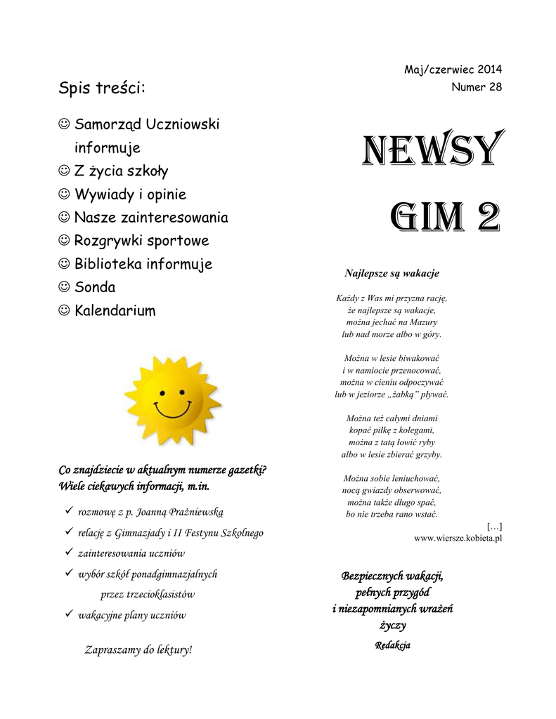 Spis treści: Samorząd Uczniowski informuje Z życia szkoły Wywiady i opinie Nasze zainteresowania Rozgrywki sportowe Biblioteka informuje Sonda Kalendarium Maj/czerwiec 2014 Numer 28 Newsy Gim 2 Najlepsze są wakacje Każdy z Was mi przyzna rację, że najlepsze są wakacje, można jechać na Mazury lub nad morze albo w góry. Można w lesie biwakować i w namiocie przenocować, można w cieniu odpoczywać lub w jeziorze „żabką” pływać. Można też całymi dniami kopać piłkę z kolegami, można z tatą łowić ryby albo w lesie zbierać grzyby. Co znajdziecie w aktualnym numerze gazetki? Wiele ciekawych informacji, m.in. rozmowę z p. Joanną Prażniewską Można sobie leniuchować, nocą gwiazdy obserwować, można także długo spać, bo nie trzeba rano wstać. […] www.wiersze.kobieta.pl relację z Gimnazjady i II Festynu Szkolnego zainteresowania uczniów wybór szkół ponadgimnazjalnych przez trzecioklasistów wakacyjne plany uczniów Zapraszamy do lektury! Bezpiecznych wakacji, pełnych przygód i niezapomnianych wrażeń życzy Redakcja Samorząd Uczniowski informuje Drzwi Otwarte We wtorek, 29 kwietnia, można było zobaczyć Gimnazjum nr 2 od kuchni, ponieważ tego dnia odbywały się Drzwi Otwarte. Rodzice szóstoklasistów wraz ze swoimi dziećmi mogli wejść do naszego budynku i dowiedzieć się, jakie klasy proponujemy w przyszłym roku szkolnym. Tego dnia w murach gimnazjum pojawili się też absolwenci. Chyba miło wspominają naukę w naszej szkole ;-)) Akademia 3 Maja 30 kwietnia 2014 r. w szkole odbyła się akademia z okazji rocznicy uchwalenia Konstytucji 3 Maja. Uroczysty apel odbył się w sali gimnastycznej, gdzie datę 3 maja 1791 roku przybliżyło nam przedstawienie przygotowane przez klasę Ib i Kasię z Ia pod opieką pani Urszuli Myszkorowskiej. Po uroczystości uczniowie wrócili na lekcję. Natalia Z życia szkoły Konkurs biologiczny 17 maja odbyła się IV edycja Wojewódzkiego Konkursu Ścieżki Fizyczno – Ekologiczne, w którym, spośród 12 trzyosobowych drużyn z gimnazjów z całego województwa kujawsko-pomorskiego, udział wzięła również nasza szkoła. Tegoroczna edycja została przeprowadzona pod patronatem Marszałka Województwa KujawskoPomorskiego, Kujawsko-Pomorskiego Kuratora Oświaty oraz Wydziału Fizyki, Astronomii i Informatyki Stosowanej na Uniwersytecie Mikołaja Kopernika w Toruniu. Cały turniej składał się z trzech etapów. Naszą szkołę reprezentowała drużyna w składzie: Kinga Sijka, Kinga Szychulec i Jagoda Czaster. Dzięki dziewczynom nasze gimnazjum zajęło doskonałe drugie miejsce! Gratulujemy! Natalia Wycieczka w Tatry W nocy z 19 na 20 maja wyruszyliśmy na prawie tygodniową wycieczkę do Zakopanego. W drodze odwiedziliśmy m.in. Sanktuarium Matki Boskiej Częstochowskiej na Jasnej Górze. Kilka godzin później byliśmy na miejscu – wykończeni, ale szczęśliwi pomaszerowaliśmy jeszcze na Wielką Krokiew. W czasie wycieczki szczególnie cieszyła nas przejażdżka bryczkami po Zakopanem. Odwiedziliśmy również Kopalnię Soli w Wieliczce, gdzie zeszliśmy 120 metrów pod ziemię. Byliśmy też na basenie i zachwycaliśmy się przepięknym jacuzzi, zjeżdżalniami, rurami, basenem zewnętrznym, a ci, którzy nie pływali, grali w kręgle i też byli zadowoleni. W czasie naszej wyprawy 2 wędrowaliśmy również po Jaskini Mroźnej, zjeżdżaliśmy kolejką szynową z Butorowego Wierchu na Gubałówkę (skąd były przepiękne widoki na cudowne góry), byliśmy na Krupówkach – tam kupowaliśmy różne rzeczy i degustowaliśmy oscypki. Śpiewaliśmy, śmialiśmy się, opowiadaliśmy różne historie, zajadaliśmy się przepysznymi kiełbaskami i góralskim chlebem pieczonym przy ognisku. W świetnym humorze w drodze powrotnej odwiedziliśmy jeszcze Kraków. Szczęśliwi i zachęceni do kolejnych wycieczek, wróciliśmy do Torunia. Natalia Ż. II Festyn Szkolny 7 czerwca br. w naszym gimnazjum odbył się II Festyn Szkolny. Wczesnym rankiem na boisku zaczęły się przygotowania. Rozstawialiśmy namioty, szykowaliśmy grilla oraz przynieśliśmy ze szkoły wszystkie potrzebne rzeczy. Uroczyste rozpoczęcie nastąpiło o godz. 10:00. Pan dyr. D. Rogulski przywitał gości – rodziców i dzieci, a także nauczycieli, pracowników szkoły oraz uczniów. Później p. J. Mikołajczak opowiedziała, co możemy robić w czasie festynu – szczegółowo omówiła przygotowane atrakcje. W tym roku mieliśmy do wyboru następujące stanowiska: Z fizyką za pan brat Mały chemik Kram z ortografią Pierwsza pomoc Kolorowa buzia Gry planszowe Zrób sobie zdjęcie Malowanie na ścianie Gra edukacyjna Znaj znak Ciasto Kiełbaski oraz napoje Fanty Przy stanowiskach można było zobaczyć widowiskowe doświadczenia, popisać się wiedzą oraz siłą, zrobić makijaż lub posilić się. Każdy na pewno znalazł coś dla siebie, a nasi uczniowie dzielnie pomagali nauczycielom. Przez cały czas w wyznaczonym miejscu przeprowadzane były również konkurencje sportowe. W trakcie festynu odbył się także pokaz mody klasy 3b, a z okazji Dnia Dziecka został przeprowadzony konkurs, który miał sprawdzić, jak dobrze dzieci znają swoich rodziców. Wystąpili również uczniowie naszej szkoły, którzy pokazali swój talent aktorski i wokalny, w tym także umiejętności beatboxu. Na zakończenie imprezy, ok. godz. 13:00, zostały wręczone nagrody za konkurencje sportowe oraz rozlosowaliśmy upominki za tak zwane „obiegówki”. Gdy uprzątnęliśmy boisko i wszystko wróciło na swoje miejsce, z uśmiechem na buziach rozeszliśmy się do domów. Mamy nadzieję, że w przyszłym roku III Festyn Szkolny wypadnie równie wspaniale, jak tym razem. Kasia i Przemek 3 Gimnazjada 2 czerwca w naszej szkole po raz szesnasty odbyła się Gimnazjada. Jest to dzień sportu, który uczniowie spędzają wspólnie z nauczycielami. Pogoda niestety nam nie sprzyjała, było zimno i kropił deszcz, dlatego wszystkie konkuren