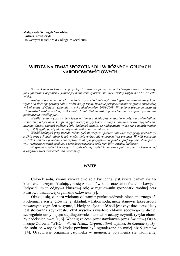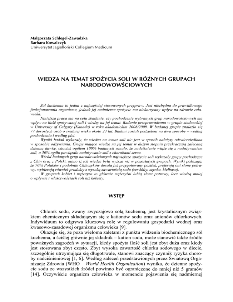 Małgorzata Schlegel-Zawadzka Barbara Kowalczyk Uniwersytet Jagielloński Collegium Medicum WIEDZA NA TEMAT SPOŻYCIA SOLI W RÓŻNYCH GRUPACH NARODOWOWŚCIOWYCH Sól kuchenna to jedna z najczęściej stosowanych przypraw. Jest niezbędna do prawidłowego funkcjonowania organizmu, jednak jej nadmierne spożycie ma niekorzystny wpływ na zdrowie człowieka. Niniejsza praca ma na celu zbadanie, czy pochodzenie wybranych grup narodowościowych ma wpływ na ilość spożywanej soli i wiedzy na jej temat. Badanie przeprowadzono w grupie studenckiej w University of Calgary (Kanada) w roku akademickim 2008/2009. W badanej grupie znalazło się 77 dorosłych osób o średniej wieku około 23 lat. Badani zostali podzieleni na dwa sposoby – według pochodzenia i według płci. Wyniki badań wykazały, że wiedza na temat soli nie jest w sposób należyty odzwierciedlona w sposobie odżywiania. Grupy mające wiedzę na jej temat w dużym stopniu przekraczają zalecaną dzienną dawkę, chociaż ogółem 100% badanych uznało, że nadciśnienie wiąże się z nadużywaniem soli, a 50% ogółu powiązało nadużywanie soli z chorobami serca. Wśród badanych grup narodowościowych największe spożycie soli wykazały grupy pochodzące z Chin oraz z Polski, mimo iż ich wiedza była wyższa niż w pozostałych grupach. Wyniki pokazują, że 70% Polaków i podobnie Chińczyków dosala już przygotowany posiłek, preferują oni słone potrawy, wybierają również produkty z wysoką zawartością sodu (ser żółty, szynka, kiełbasa). W grupach kobiet i mężczyzn to głównie mężczyźni lubią słone potrawy, lecz wiedzą mniej o wpływie i właściwościach soli niż kobiety. WSTĘP Chlorek sodu, zwany zwyczajowo solą kuchenną, jest krystalicznym związkiem chemicznym składającym się z kationów sodu oraz anionów chlorkowych. Indywiduum to odgrywa kluczową rolę w regulowaniu gospodarki wodnej oraz kwasowo-zasadowej organizmu człowieka [9]. Okazuje się, że poza wieloma zaletami z punktu widzenia biochemicznego sól kuchenna, a ściślej głównie jej składnik – kation sodu, może stanowić także źródło poważnych zagrożeń w sytuacji, kiedy spożyta ilość soli jest zbyt duża oraz kiedy jest stosowana zbyt często. Zbyt wysoka zawartość chlorku sodowego w diecie, szczególnie utrzymująca się długotrwale, stanowi znaczący czynnik ryzyka choroby nadciśnieniowej [1, 6]. Według zaleceń przedstawionych przez Światową Organizację Zdrowia (WHO – World Health Organization) wynika, że dzienne spożycie sodu ze wszystkich źródeł powinno być ograniczone do mniej niż 5 gramów [14]. Oczywiście organizm człowieka w momencie pojawienia się nadmiernej 40 ZESZYTY NAUKOWE AKADEMII MORSKIEJ W GDYNI, nr 65, grudzień 2010 ilości sodu uruchamia mechanizmy obronne mające na celu redukcję poziomu soli w organizmie – każdy nadmiar spożywanej soli jest wydalany przez nerki. Jednakże jeśli nerki nie są w stanie wyeliminować sodu, gromadzi się on we krwi, zatrzymując wodę w organizmie – implikuje to, że objętość roztworu krwi wzrasta, co z kolei zwiększa nacisk na serce i zarazem powoduje zwiększenie ciśnienia tętniczego [3, 10]. Współczesne grupy społeczne, które opisano w niniejszym artykule (Kanadyjczycy, Polacy, Chińczycy, Meksykanie) wytworzyły styl, który charakteryzuje się dużym spożyciem sodu, chociaż w państwach ojczystych badanych narodów nasilona jest kampania przedstawiająca zagrożenia związane z nadużywaniem soli. Kanada jako pierwsza sformuowała główne tezy na temat konieczności promowania zdrowia – tzw. karta ottawska (1986 r.) [13]. Z kolei w Chinach przeprowadzono eksperyment „The China Salt Substitute Study” nagłośniony w całym kraju, dotyczący badania ciśnienia krwi ludzi spożywających sól oraz ludzi spożywających substytut soli zawierający niski poziom sodu, a wysoki poziom potasu [12]. Wyniki rocznych badań pokazały, że u osób stosujących substytut soli ciśnienie krwi zmniejszyło się o 5,4 mmHg. Polacy natomiast przodują w Europie pod względem spożywania soli. Aktualny poziom spożycia soli w Polsce jest trzykrotnie wyższy niż zalecany, jak wynika z raportu WHO [14]. Przyczyną jest m.in. dodawanie soli w dużych ilościach podczas przemysłowej produkcji żywności, np. konserw, wędlin, serów, kiszonek, wędzonek, marynat, a także zup w proszku i niektórych przypraw [5, 7]. Wszystkie następstwa nadciśnienia są najpowszechniejszą przyczyną zgonów w Polsce, zwiększonej zachorowalności i inwalidztwa, a to niesie ze sobą z kolei następstwa ekonomiczne, zarówno w skali indywidualnej, jak i społecznej [4, 8]. Ponadto organizacja WHO szacuje, że zmniejszenie spożycia soli o 50 mmol/dobę może doprowadzić do 16-procentowego zmniejszenia liczby zgonów spowodowanego chorobą wieńcową [14]. Polacy jako Europejczycy wykazują jednak wysoki poziom świadomości na temat chorób i sposobów ich leczenia [11]. Jest to w dużej mierze związane z głównymi problemami zdrowotnymi Europejczyków, którymi są nadciśnienie tętnicze oraz nadwaga – powoduje to nasilony stopień promowania zdrowia na szeroką skalę [2, 11]. Powyższe dane pokazują, że wiedza na temat soli kuchennej, ilości chlorku sodu w rozmaitych produktach stosowanych na co dzień oraz racjonalne jej stosowanie mają kluczowe znaczenie dla życia człowieka. Z tego względu w niniejszym opracowaniu scharakteryzowano rozmaite grupy narodowościowe pochodzące z Europy, Azji oraz Ameryki w kontekście ich wiedzy na temat chlorku sodu oraz w aspekcie jego stosowania w życiu codziennym. 1. CELE PRACY Celem pracy jest ocena wpływu pochodzenia wybranych grup narodowościowych (Polaków, Kanadyjczyków, Meksykanów i Chińczyków) na spożycie soli i jej znaczenie dla badanych osób. M. Schlegel-Zawadzka, B. Kowalczyk, Wiedza na temat spożycia soli... • • • 41 W artykule przedstawiono: charakterystykę 