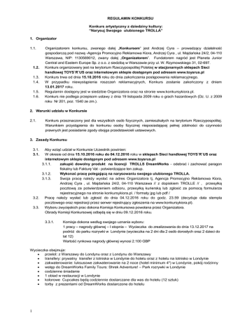 REGULAMIN KONKURSU Konkurs artystyczny z dziedziny kultury: “Narysuj Swojego ulubionego TROLLA” 1. Organizator 1.1. 1.2. 1.3. 1.4. 1.5. 1.6. Organizatorem konkursu, zwanego dalej „Konkursem” jest Andrzej Cyra – prowadzący działalność gospodarczą pod nazwą -Agencja Promocyjno Reklamowa Kiora, Andrzej Cyra , ul. Majdańska 24/2, 04-110 Warszawa, NIP: 1130569012, zwany dalej „Organizatorem”. Fundatorem nagród jest Planeta Junior Central and Eastern Europe Sp. z o.o. z siedzibą w Warszawie przy ul. W. Rzymowskiego 31, 02-697. Konkurs organizowany jest na terytorium Rzeczypospolitej Polskiej w stacjonarnych sklepach Sieci handlowej TOYS`R`US oraz internetowym sklepie dostępnym pod adresem www.toysrus.pl Konkurs trwa od dnia 15.10.2016 roku do dnia zakończenia postępowania reklamacyjnego. W przypadku niewystąpienia roszczeń reklamacyjnych, Konkurs zostanie zakończony z dniem 13.01.2017 roku. Regulamin dostępny jest w siedzibie Organizatora oraz na stronie www.konkursykiora.pl. Konkurs nie podlega przepisom ustawy z dnia 19 listopada 2009 roku o grach hazardowych (Dz. U. z 2009 roku Nr 201, poz. 1540 ze zm.). 2. Warunki udziału w Konkursie 2.1. Konkurs przeznaczony jest dla wszystkich osób fizycznych, zamieszkałych na terytorium Rzeczypospolitej. Warunkiem przystąpienia do konkursu osoby fizycznej nieposiadającej pełnej zdolności do czynności prawnych jest posiadanie zgody obojga przedstawicieli ustawowych. 3. Zasady Konkursu Aby wziąć udział w Konkursie Uczestnik powinien: W okresie od dnia 15.10.2016 roku do 04.12.2016 roku w sklepach Sieci handlowej TOYS`R`US oraz internetowym sklepie dostępnym pod adresem www.toysrus.pl 3.1.1. zakupić dowolny produkt na licencji TROLLS DreamWorks - odebrać i zachować paragon fiskalny lub Fakturę Vat - potwierdzające ten zakup. 3.1.2. Wykonać pracę polegającą na narysowaniu swojego ulubionego TROLLA. 3.1.3. Swoja pracę należy wysłać na adres Organizatora tj, Agencja Promocyjno Reklamowa Kiora, Andrzej Cyra , ul. Majdańska 24/2, 04-110 Warszawa // z dopiskiem TROLLE // , przesyłką pocztową za potwierdzeniem odbioru, przesyłką kurierską lub zgłosić za pomocą formularza rejestracyjnego na stronie konkursykiora.pl. / formaty jpg lub pdf / 3.2. Pracę należy wysłać lub zgłosić do dnia 04.12.2016 roku do godz. 23.59 (decyduje data stempla pocztowego oraz rejestracji przez serwer rejestrujący zgłoszenia na www.konkursykiora.pl). 3.3. Wyboru zwycięskich prac dokona Komisja Konkursowa powołana przez Organizatora. Obrady Komisji Konkursowej odbędą się w dniu 09.12.2016 roku. 3.1. 3.1. 3.3.1. Komisja dokona według swojego uznania wyboru: 1 pracy – nagrody głównej – I stopnia – Wycieczka do zrealizowania do dnia 13.12.2017 na podróż do parku rozrywki w Londynie (wycieczka na 2 dni dla 2 osób dorosłych oraz 2 dzieci do lat 12) Wartość rynkowa nagrody głównej wynosi 2.100 GBP Wycieczka obejmuje: przelot: z Warszawy do Londynu oraz z Londynu do Warszawy transfery: prywatny transfer z lotniska w Londynie do hotelu oraz z hotelu na lotnisko w Londynie zakwaterowanie: luksusowe zakwaterowanie na 2 noce (hotel minimum 4*) w Londynie, pokój rodzinny wstęp do DreamWorks Family Tours: Shrek Adventure! – Park rozrywki w Londynie codzienne śniadanie 1 obiad w restauracji w Londynie kolorowe Cupcakes będą codziennie dostarczane dla was do hotelu (12 sztuk) torby z prezentami od DreamWorks dostarczone do hotelu 1 oraz nagrody dodatkowe 5 prac – nagrody 2 stopnia – TROLLS Mega zestaw (4 pluszowe breloczki 22 cm.) o wartości rynkowej brutto 261,81złotych / 1 szt. 18 prac – nagrody 3 stopnia - TROLLS ŚPIEWAJĄCA POPPY o wartości rynkowej brutto 215,95 złotych / 1 szt. 5 prac – nagrody 4 stopnia - TROLLS Zestaw 4 plastikowych breloczków o wartości rynkowej brutto 121,24 złotych / 1 szt. 18 prac – nagrody 5 stopnia - TROLLS ZESTAW KORONACYJNY o wartości rynkowej brutto 116,52 złotych / 1 szt. 15 prac – nagrody 6 stopnia - TROLLS STUDIO STYLIZACJI o wartości rynkowej brutto 92,42 złotych / 1 szt. 10 prac – nagrody 7 stopnia - TROLLS Pluszowy Breloczek 22 cm o wartości rynkowej brutto 68,53 złotych / 1 szt. 20 prac – nagrody 8 stopnia - TROLLS Plastikowa Figurka Breloczek 10,5 cm o wartości rynkowej brutto 42,17 złotych / 1 szt. 72 prace – nagrody 9 stopnia - TROLLS FIGURKA PODSTAWOWA o wartości rynkowej brutto 21,75 złotych / 1 szt. 37 prac – nagrody 10 stopnia - TROLLS TOREBKI NIESPODZIANKI o wartości rynkowej brutto 10,41 złotych / 1 szt. 3.3.2. 3.3.3. 3.3.4. Kryterium wyboru zwycięskich prac to – oryginalność pomysłu, staranność wykonania pracy, trud włożony w wykonanie pracy oraz walory artystyczne w odniesieniu do wieku autora. Każdy z autorów zwycięskich prac, otrzyma nagrodę, pod warunkiem, że spełni wymagania określone niniejszym Regulaminem. Praca konkursowa może być nagrodzona tylko jedną nagrodą. Obrady Komisji Konkursowej będą niejawne. 4. Opodatkowanie nagród 4.1. 4.2. Do każdej nagrody zostanie dodana nagroda pieniężna stanowiąca 11,11% wartości tejże nagrody. Przed wydaniem nagród Organizator, jako płatnik potrąci część pieniężną od i odprowadzi ją do stosownego urzędu skarbowego na poczet 10% zryczałtowanego podatku dochodowego od osób fizycznych zgodnie z art. 30 ust. 1 pkt 2 ustawy o podatku dochodowym od osób fizycznych (t. j. z 2012 r., poz. 361). 5. Ochrona danych osobowych 5.1. 5.2. 5.3. 5.4. 2 Administratorem danych osobowych zgromadzonych w związku z organizacją Programu jest Organizator, tj. Andrzej Cyra działający pod nazwą Agencja Promocyjno Reklamowa KIORA z siedzibą w Warszawie przy ul. Majdańskiej 24 lok. 2. Dane, o których mowa będą przetwarzane wyłącznie w celach przedmiotowo związanych z przeprowadzeniem Konkursu, w szczególności na potrzeby umożliwienia Uczestnikowi udziału w Konkursie, wydania nagród zwycięzcom i rozpatrywania ewentualnych reklamacji. (t.j