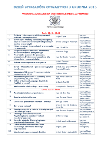 PAŃSTWOWA WYŻSZA SZKOŁA WSCHODNIOEUROPEJSKA W PRZEMYŚLU Harmonogram zajęć 1. 2. 3. 4. 5. 6. 7. 8. 9. 10. 11. Godz. 09:15 – 10:05 Dzikość i Literatura – o kilku pisarzach dr Jan Zięba polskich i amerykańskich Ewolucyjne metody sztucznej inteligencji czyli mechanizmy ewolucji biologicznej w dr inż. Grzegorz Kasprzyk służbie informatyki Hałas – metody jego redukcji w przemyśle mgr Michał Fac i transporcie Jak przekonywać słusznie? Warsztaty dr Paweł Ścigaj z zakresu wpływu politycznego Nekropolie jako źródło poznania przeszłości. Praktyczne wskazówki dla mgr Bartłomiej Marczyk historyków i przewodników dr inż. Grzegorz Paliwa alternatywne w transporcie Dzieniszewski Świat i Wszechświat – jak może wyglądać jego koniec Warsztaty 3D (grupy 15 osobowe, zajęcia trwają do godz: 10:30) Warsztaty rysunkowe – zakazany owoc (zajęcia trwają do godz: 10:50) What a Curious Language English is (wykład w j. ang.) Wolontariat dla każdego - warsztaty dr hab. inż. prof. PWSW Krzysztof Knapik dr Piotr Kisiel Mgr Anna Kałamarz Kucz dr Jacek Rachfał dr Agnieszka Pieniążek Instytut Filologiczny Instytut Nauk Technicznych Instytut Nauk Technicznych Instytut Nauk Społecznych Instytut Nauk Humanistycznych Instytut Nauk Technicznych Instytut Nauk Technicznych, Rektor PWSW Instytut Sztuk Projektowych Instytut Sztuk Projektowych Instytut Nauk Humanistycznych Instytut Nauk Społecznych Godz. 10:15 – 11:00 12. 13. 14. 15. 16. 17. 18. 19. 20. Analiza jakościowa w próbówce mgr inż. Ewa Ilba Brud w dziejach Europy mgr Tomasz Filozof Cmentarz przestrzeń wierzeń i praktyk dr Olga Solarz Czy wiesz co jesz? prof. dr hab. inż. Grażyna Jaworska Gród przemyski w świetle źródeł pisanych i archeologicznych Dlaczego nie lubimy obcych? Psychologiczne podstawy relacji międzygrupowych Kosmici atakują. Obcy w kulturze popularnej (literatura i film) Od Golema do smartfona – idea sztucznego człowieka dawniej i współcześnie Wodociągi na przestrzeni dziejów mgr Andrzej Koperski dr Paweł Ścigaj dr hab. Andrzej Juszczyk dr Jan Zięba dr inż. Robert Wierzbicki Instytut Nauk Technicznych Instytut Nauk Społecznych Instytut Nauk Humanistycznych Instytut Nauk Technicznych Instytut Nauk Humanistycznych Instytut Nauk Społecznych Instytut Filologiczny Instytut Filologiczny Instytut Nauk Technicznych 21. 22. 23. 24. 25. 26. 27. 28. 29. 30. 31. 32. 33. 34. 35. 36. 37. 38. 39. 40. 41. Wodooszczędne technologie innowacyjne dr inż. Zsuzana Iwanicka Godz. 10:50 – 12:20 Warsztaty 3D (grupy 15 osobowe, zajęcia dr Piotr Kisiel trwają do godz: 10:30) Warsztaty rysunkowe – zakazany owoc Mgr Anna Kałamarz (zajęcia trwają do godz: 10:50) Kucz Godz 11:10 – 11:55 Demokracja elektroniczna (e-demokracja) – produkt fantastyki naukowej czy dr Dominik Sieklucki rzeczywisty kierunek zmian? Katastrofy Kanalizacyjne dr inż. Urszula Polak Nowe technologie w wytwarzaniu produktów spożywczych Nowoczesne technologie w oszczędzaniu wody prof. dr hab. inż. Krzysztof Surówka Pisarze i pieniądze dr Jan Zięba Psychospołeczne podstawy terroryzmu dr Paweł Ścigaj Straty i marnotrastwo żywności dr inż. Karol Krajewski Super żywność prof. dr hab. inż. Grażyna Jaworska dr inż. Zsuzana Iwanicka Tortury w służbie Boga. Dzieje Świętej mgr Tomasz Filozof Inkwizycji (Hiszpańskiej) Zanieczyszczenia żywności i ich wpływ na dr inż. Adam Sidor zdrowie Godz 12:05 – 12:50 Jak bezpiecznie badać materiał Kwiaty i owoce w jadłospisie Patrycja Napora Mikrofalowe ogrzewanie żywności Prof. dr hab. inż. Krzysztof Surówka Pokolenie Y – budowanie zespołu biznesowego dr Małgorzata Kuźbida Powodzie w Polsce na przestrzeni wieków dr inż. Włodzimierz Banach Programowanie mikrokontrolerów Daniel Tompalski Sztuka zadawania śmierci – rzemiosło katowskie w cywilizacji europejskiej Współczesne płyny eksploatacyjne i metody ich diagnozowania mgr Tomasz Filozof dr inż. Adam Woś W programie również: - zwiedzania laboratoriów - liczne konkursy z nagrodami Zgłoszenia proszę kierować pod nr 16 73 55 202, 16 73 55 203 lub: [email protected] Instytut Nauk Technicznych Instytut Sztuk Projektowych Instytut Sztuk Projektowych Instytut Nauk Społecznych Instytut Nauk Technicznych Instytut Nauk Technicznych Instytut Nauk Technicznych Instytut Filologiczny Instytut Nauk Społecznych Instytut Nauk Technicznych Instytut Nauk Technicznych Instytut Nauk Społecznych Instytut Nauk Technicznych CKZiU nr 1 Instytut Nauk Technicznych Instytut Nauk Technicznych Instytut Nauk Społecznych Instytut Nauk Technicznych Instytut Nauk Technicznych Instytut Nauk Społecznych Instytut Nauk Technicznych