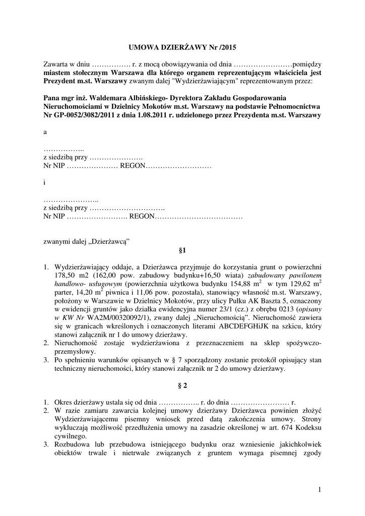UMOWA DZIERŻAWY Nr /2015 Zawarta w dniu ……………. r. z mocą obowiązywania od dnia ……………………pomiędzy miastem stołecznym Warszawa dla którego organem reprezentującym właściciela jest Prezydent m.st. Warszawy zwanym dalej "Wydzierżawiającym" reprezentowanym przez: Pana mgr inż. Waldemara Albińskiego- Dyrektora Zakładu Gospodarowania Nieruchomościami w Dzielnicy Mokotów m.st. Warszawy na podstawie Pełnomocnictwa Nr GP-0052/3082/2011 z dnia 1.08.2011 r. udzielonego przez Prezydenta m.st. Warszawy a …………….. z siedzibą przy …………………. Nr NIP ………………… REGON……………………… i ………………….. z siedzibą przy …………………………. Nr NIP ……………………. REGON……………………………… zwanymi dalej „Dzierżawcą” §1 1. Wydzierżawiający oddaje, a Dzierżawca przyjmuje do korzystania grunt o powierzchni 178,50 m2 (162,00 pow. zabudowy budynku+16,50 wiata) zabudowany pawilonem handlowo- usługowym (powierzchnia użytkowa budynku 154,88 m2 w tym 129,62 m2 parter, 14,20 m2 piwnica i 11,06 pow. pozostała), stanowiący własność m.st. Warszawy, położony w Warszawie w Dzielnicy Mokotów, przy ulicy Pułku AK Baszta 5, oznaczony w ewidencji gruntów jako działka ewidencyjna numer 23/1 (cz.) z obrębu 0213 (opisany w KW Nr WA2M/00320092/1), zwany dalej „Nieruchomością”. Nieruchomość zawiera się w granicach wkreślonych i oznaczonych literami ABCDEFGHiJK na szkicu, który stanowi załącznik nr 1 do umowy dzierżawy. 2. Nieruchomość zostaje wydzierżawiona z przeznaczeniem na sklep spożywczoprzemysłowy. 3. Po spełnieniu warunków opisanych w § 7 sporządzony zostanie protokół opisujący stan techniczny nieruchomości, który stanowi załącznik nr 2 do umowy dzierżawy. §2 1. Okres dzierżawy ustala się od dnia …………….. r. do dnia …………………… r. 2. W razie zamiaru zawarcia kolejnej umowy dzierżawy Dzierżawca powinien złożyć Wydzierżawiającemu pisemny wniosek przed datą zakończenia umowy. Strony wykluczają możliwość przedłużenia umowy na zasadzie określonej w art. 674 Kodeksu cywilnego. 3. Rozbudowa lub przebudowa istniejącego budynku oraz wzniesienie jakichkolwiek obiektów trwale i nietrwale związanych z gruntem wymaga pisemnej zgody 1 Wydzierżawiającego. Zgoda Wydzierżawiającego nie zwalnia Dzierżawcy z obowiązku uzyskania wymaganych prawem zgód, pozwoleń, zezwoleń i uzgodnień. Wysokość ani charakter nakładów poniesionych na zagospodarowanie terenu nie będzie stanowić podstawy do domagania się zawarcia kolejnej umowy dzierżawy, jak również do zgłaszania przez Dzierżawcę jakichkolwiek innych roszczeń wobec Wydzierżawiającego po wygaśnięciu umowy. §3 1. Strony ustalają miesięczny czynsz dzierżawny w kwocie netto ……………….. zł (słownie ……………..), co odpowiada stawce netto ……………… zł (słownie: …………………) za 1m² pow. zabudowy budynku i ………….. za pow. wiaty. Kwota czynszu będzie każdorazowo powiększona o podatek VAT, ustalony według obowiązującej stawki, która w dniu zawarcia umowy wynosi 23%. Kwota miesięcznego czynszu wraz z podatkiem VAT wynosi ……………… zł (słownie: ………………..), w tym VAT …………. zł (słownie: ……………………………). 2. Wpłat z tytułu czynszu należy dokonywać z góry przelewem na konto Wydzierżawiającego: ……………………. w terminie do dnia 21-tego każdego miesiąca, (niezależnie od terminu doręczenia faktury. ) 3. Przy dokonywaniu wpłat należy podać numer umowy dzierżawy. 4. Dzierżawca oświadcza, że posiada NIP nr …………………. §4 1. W przypadku opóźnienia w zapłacie czynszu Wydzierżawiający naliczy odsetki ustawowe. Dokonane przez Dzierżawcę wpłaty Wydzierżawiający ma prawo zaliczyć w pierwszej kolejności na odsetki ustawowe z tytułu opóźnienia, następnie na czynsz i opłaty zaległe, a dopiero w ostatniej kolejności na czynsz i opłaty bieżące. 2. Dwumiesięczne opóźnienie w zapłacie czynszu, w tym odmowa zapłaty czynszu, którego wysokość została zaktualizowana lub podwyższona zgodnie z § 5 oraz §13 ust. 5 stanowić będzie podstawę do rozwiązania umowy bez zachowania okresu wypowiedzenia, jeżeli Dzierżawca, po udzieleniu mu w formie pisemnej dodatkowego miesięcznego terminu, nie dokona zapłaty zaległego czynszu wraz z odsetkami. 3. W przypadku korzystania z nieruchomości bez tytułu prawnego, Dzierżawca zobowiązuje się do zapłaty Wydzierżawiającemu wynagrodzenia za bezumowne korzystanie z nieruchomości w wysokości 200% czynszu brutto miesięcznie, naliczanego zgodnie z dotychczasową umową (kwota netto + VAT), w okresie od dnia zakończenia umowy do dnia wydania nieruchomości. 4. W razie złożenia przez Dzierżawcę wniosku o zawarcie kolejnej umowy dzierżawy, zgodnie z § 2 ust. 2 niniejszej umowy i nie poinformowania przez Wydzierżawiającego o odmowie zawarcia kolejnej umowy, wynagrodzenie za bezumowne korzystanie z nieruchomości do czasu zawarcia nowej umowy, równe będzie kwocie czynszu brutto naliczanego zgodnie z dotychczasową umową (kwota netto + VAT). Strony zgodnie oświadczają, że korzystanie przez Dzierżawcę z nieruchomości w powyższym okresie nie oznacza przedłużenia umowy na podstawie art. 674 Kodeksu cywilnego. 5. Dzierżawca nie jest uprawniony do dokonywania potrąceń z czynszu dzierżawnego żadnych sum z tytułu roszczeń wobec m.st. Warszawy. 2 §5 1. Wydzierżawiający ma prawo aktualizować wysokość czynszu jeden raz w roku, w IV kwartale roku, z mocą obowiązującą od 1 stycznia następnego roku - wg wskaźnika wzrostu cen towarów i usług konsumpcyjnych za trzy kwartały w stosunku do analogicznego okresu roku poprzedniego, ogłoszonego przez Prezesa Głównego Urzędu Statystycznego na dzień 30 września danego roku. O nowej stawce czy