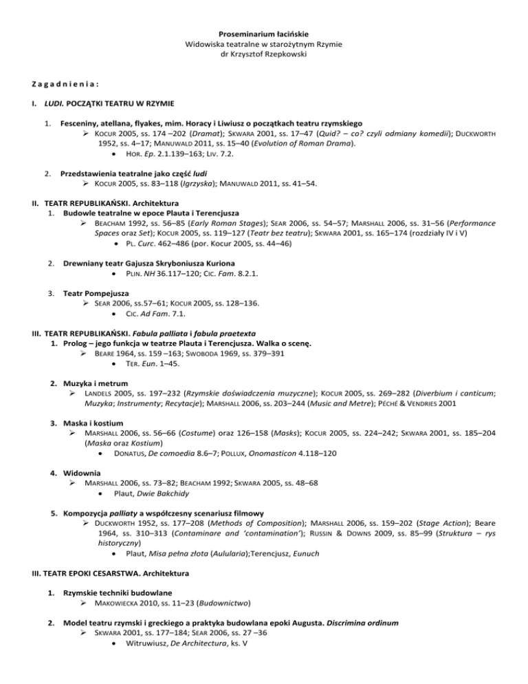 Proseminarium łacioskie Widowiska teatralne w starożytnym Rzymie dr Krzysztof Rzepkowski Zagadnienia: I. LUDI. POCZĄTKI TEATRU W RZYMIE 1. Fesceniny, atellana, flyakes, mim. Horacy i Liwiusz o początkach teatru rzymskiego KOCUR 2005, ss. 174 –202 (Dramat); SKWARA 2001, ss. 17–47 (Quid? – co? czyli odmiany komedii); DUCKWORTH 1952, ss. 4–17; MANUWALD 2011, ss. 15–40 (Evolution of Roman Drama). HOR. Ep. 2.1.139–163; LIV. 7.2. 2. Przedstawienia teatralne jako część ludi KOCUR 2005, ss. 83–118 (Igrzyska); MANUWALD 2011, ss. 41–54. II. TEATR REPUBLIKAŃSKI. Architektura 1. Budowle teatralne w epoce Plauta i Terencjusza BEACHAM 1992, ss. 56–85 (Early Roman Stages); SEAR 2006, ss. 54–57; MARSHALL 2006, ss. 31–56 (Performance Spaces oraz Set); KOCUR 2005, ss. 119–127 (Teatr bez teatru); SKWARA 2001, ss. 165–174 (rozdziały IV i V) PL. Curc. 462–486 (por. Kocur 2005, ss. 44–46) 2. Drewniany teatr Gajusza Skryboniusza Kuriona PLIN. NH 36.117–120; CIC. Fam. 8.2.1. 3. Teatr Pompejusza SEAR 2006, ss.57–61; KOCUR 2005, ss. 128–136. CIC. Ad Fam. 7.1. III. TEATR REPUBLIKAŃSKI. Fabula palliata i fabula praetexta 1. Prolog – jego funkcja w teatrze Plauta i Terencjusza. Walka o scenę. BEARE 1964, ss. 159 –163; SWOBODA 1969, ss. 379–391 TER. Eun. 1–45. 2. Muzyka i metrum LANDELS 2005, ss. 197–232 (Rzymskie doświadczenia muzyczne); KOCUR 2005, ss. 269–282 (Diverbium i canticum; Muzyka; Instrumenty; Recytacje); MARSHALL 2006, ss. 203–244 (Music and Metre); PÉCHÉ & VENDRIES 2001 3. Maska i kostium MARSHALL 2006, ss. 56–66 (Costume) oraz 126–158 (Masks); KOCUR 2005, ss. 224–242; SKWARA 2001, ss. 185–204 (Maska oraz Kostium) DONATUS, De comoedia 8.6–7; POLLUX, Onomasticon 4.118–120 4. Widownia MARSHALL 2006, ss. 73–82; BEACHAM 1992; SKWARA 2005, ss. 48–68 Plaut, Dwie Bakchidy 5. Kompozycja palliaty a współczesny scenariusz filmowy DUCKWORTH 1952, ss. 177–208 (Methods of Composition); MARSHALL 2006, ss. 159–202 (Stage Action); Beare 1964, ss. 310–313 (Contaminare and ‘contamination’); RUSSIN & DOWNS 2009, ss. 85–99 (Struktura – rys historyczny) Plaut, Misa pełna złota (Aulularia);Terencjusz, Eunuch III. TEATR EPOKI CESARSTWA. Architektura 1. Rzymskie techniki budowlane MAKOWIECKA 2010, ss. 11–23 (Budownictwo) 2. Model teatru rzymski i greckiego a praktyka budowlana epoki Augusta. Discrimina ordinum SKWARA 2001, ss. 177–184; SEAR 2006, ss. 27 –36 Witruwiusz, De Architectura, ks. V 3. Teatry kamienne. Teatr na planie miasta rzymskiego MAKOWIECKA 2010, ss. 52–57; SEAR 2006, ss. 61–67; KOCUR 2005, ss. 136–144. III. TEATR EPOKI CESARSTWA. Mim i pantomima LADA-RICHARDS 2007, ss. 12–37; MANUWALD 2006, ss. 178 –186; HALL & R. WYLES 2008, ss. 1–42. Lukian z Samosate, Dialog o taocu BIBLIOGRAFIA Literatura podstawowa: 1. R.C. BEACHAM, The Roman Theatre and Its Audience, Harvard 1992. 2. G. MANUWALD, Roman Republican Theatre, Cambridge 2011. 3. J.G. LANDELS, Muzyka starożytnej Grecji i Rzymu, Kraków 2005 (rozdział Rzymskie doświadczenia muzyczne). 4. M. KOCUR, We władzy teatru. Aktorzy i widzowie w antycznym Rzymie, Wrocław 2005. 5. E. MAKOWIECKA, Sztuka Rzymu. Od Augusta do Konstantyna, Warszawa 2010 (rozdział Budownictwo oraz podrozdziały Amfiteatr i Teatr) 6. C.W. MARSHALL, The Stagecraft and Performance of Roman Comedy, Cambridge 2006. 7. E. SKWARA, Historia komedii rzymskiej, Warszawa 2001. Literatura uzupełniająca: 3 1. W. BEARE, The Roman Stage, London 1964 . 2. C.R. DODWELL, Anglo-saxon Gestures and the Roman Stage, Cambridge 2000. 3. G.E. DUCKWORTH, The Nature of Roman Comedy, Princeton 1952. 4. F. DUPONT, Le théâtre latin, Paris 1999. 5. F. DUPONT, L’Acteur-roi. Le théâtre dans la Rome antique, Paris 2003. 6. E. HALL & R. WYLES, New Directions In Ancient Pantomime, Oxford 2008. 7. E. KARAKASIS, Terence and the Language of Roman Comedy, Cambridge 2005. 8. I. LADA-RICHARDS, Silence Eloquence: Lucian and Pantomime Dancing, London 2007. 9. H.N. PARKER, ‘Plautus vs. Terence: Audience and Popularity Re-Examined’, The American Journal of Philology 117 (1996), ss. 585–617. 10. V. PÉCHÉ et CH. VENDRIES, Musique et spectacles dans la Rome antique, Paris 2001. 11. R.U. RUSSIN & W.M. DOWNS, Jak napisać scenariusz filmowy, Warszawa 2009. 12. F. SEAR, Roman Theatres. An Architectural Study, Oxford 2006. 13. E. SEGAL, Roman Laughter. The Comedy of Plautus, Oxford 1987. 14. E. SKWARA, ‘Widz w teatrze Plauta. Charakterystyka rzymskiego odbiorcy na podstawie komedii Bacchides’, Meander 1 (2005), ss. 48–68. 15. M. SWOBODA, ‘Spór Luscjusza Lanuwinusa z Terencjuszem’, Meander 24 (1969), ss. 379–391.