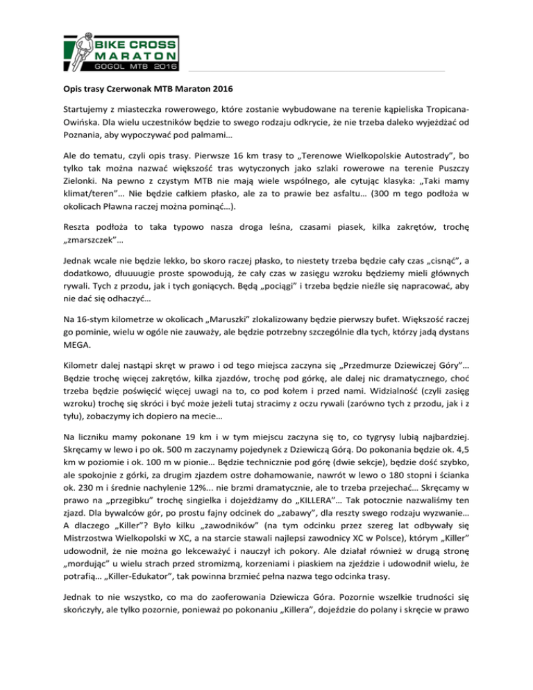 Opis trasy Czerwonak MTB Maraton 2016 Startujemy z miasteczka rowerowego, które zostanie wybudowane na terenie kąpieliska TropicanaOwińska. Dla wielu uczestników będzie to swego rodzaju odkrycie, że nie trzeba daleko wyjeżdżać od Poznania, aby wypoczywać pod palmami… Ale do tematu, czyli opis trasy. Pierwsze 16 km trasy to „Terenowe Wielkopolskie Autostrady”, bo tylko tak można nazwać większość tras wytyczonych jako szlaki rowerowe na terenie Puszczy Zielonki. Na pewno z czystym MTB nie mają wiele wspólnego, ale cytując klasyka: „Taki mamy klimat/teren”… Nie będzie całkiem płasko, ale za to prawie bez asfaltu… (300 m tego podłoża w okolicach Pławna raczej można pominąć…). Reszta podłoża to taka typowo nasza droga leśna, czasami piasek, kilka zakrętów, trochę „zmarszczek”… Jednak wcale nie będzie lekko, bo skoro raczej płasko, to niestety trzeba będzie cały czas „cisnąć”, a dodatkowo, dłuuuugie proste spowodują, że cały czas w zasięgu wzroku będziemy mieli głównych rywali. Tych z przodu, jak i tych goniących. Będą „pociągi” i trzeba będzie nieźle się napracować, aby nie dać się odhaczyć… Na 16-stym kilometrze w okolicach „Maruszki” zlokalizowany będzie pierwszy bufet. Większość raczej go pominie, wielu w ogóle nie zauważy, ale będzie potrzebny szczególnie dla tych, którzy jadą dystans MEGA. Kilometr dalej nastąpi skręt w prawo i od tego miejsca zaczyna się „Przedmurze Dziewiczej Góry”… Będzie trochę więcej zakrętów, kilka zjazdów, trochę pod górkę, ale dalej nic dramatycznego, choć trzeba będzie poświęcić więcej uwagi na to, co pod kołem i przed nami. Widzialność (czyli zasięg wzroku) trochę się skróci i być może jeżeli tutaj stracimy z oczu rywali (zarówno tych z przodu, jak i z tyłu), zobaczymy ich dopiero na mecie… Na liczniku mamy pokonane 19 km i w tym miejscu zaczyna się to, co tygrysy lubią najbardziej. Skręcamy w lewo i po ok. 500 m zaczynamy pojedynek z Dziewiczą Górą. Do pokonania będzie ok. 4,5 km w poziomie i ok. 100 m w pionie… Będzie technicznie pod górę (dwie sekcje), będzie dość szybko, ale spokojnie z górki, za drugim zjazdem ostre dohamowanie, nawrót w lewo o 180 stopni i ścianka ok. 230 m i średnie nachylenie 12%... nie brzmi dramatycznie, ale to trzeba przejechać… Skręcamy w prawo na „przegibku” trochę singielka i dojeżdżamy do „KILLERA”… Tak potocznie nazwaliśmy ten zjazd. Dla bywalców gór, po prostu fajny odcinek do „zabawy”, dla reszty swego rodzaju wyzwanie… A dlaczego „Killer”? Było kilku „zawodników” (na tym odcinku przez szereg lat odbywały się Mistrzostwa Wielkopolski w XC, a na starcie stawali najlepsi zawodnicy XC w Polsce), którym „Killer” udowodnił, że nie można go lekceważyć i nauczył ich pokory. Ale działał również w drugą stronę „mordując” u wielu strach przed stromizmą, korzeniami i piaskiem na zjeździe i udowodnił wielu, że potrafią… „Killer-Edukator”, tak powinna brzmieć pełna nazwa tego odcinka trasy. Jednak to nie wszystko, co ma do zaoferowania Dziewicza Góra. Pozornie wszelkie trudności się skończyły, ale tylko pozornie, ponieważ po pokonaniu „Killera”, dojeździe do polany i skręcie w prawo zacznie się kolejny podjazd pod Dziewiczą Górę. Nie będzie tak stromo, jak poprzednio, ale wejdzie w nogi… Jeżeli ktoś myśli, że to koniec, to jest w błędzie. Co prawda Dziewicza już za nami, ale po zjeździe do leśniczówki ostry nawrót w prawo i jedziemy znowu pod górkę. Nudy nie będzie aż do mety. Ostatnie 10 km do mety z pominięciem odcinka Szlaku Cysterskiego, nie będzie przypominało pierwszych kilometrów imprezy. W okolicach miasteczka będzie zlokalizowany rozjazd na poszczególne dystanse, MINI w lewo do mety, (200 m na finisz…), MEGA w prawo na następną rundę (33 km do mety). Zawodnicy z dystansu MINI będą komentować w miasteczku, co się działo na trasie, natomiast „Megowcy” po pokonaniu najbliższych 16 kilometrów skorzystają z bufetu w okolicach „Muraszki” nabierając sił przed ostateczną rozgrywką z rywalami (i rywalkami) w okolicach Dziewiczej Góry. Potem jak zwykle komentarze, dyskusje, dekoracje i oczekiwanie na dalsze edycje (a tych pozostanie już tylko dwie, Stęszew i finał w Łopuchowie…) Zapraszamy!
