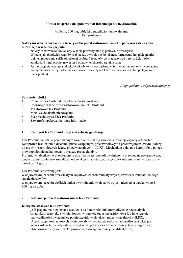 Ulotka dołączona do opakowania: informacja dla użytkownika Profenid, 200 mg, tabletki o przedłużonym uwalnianiu Ketoprofenum Należy uważnie zapoznać się z treścią ulotki przed zastosowaniem leku, ponieważ zawiera ona informacje ważne dla pacjenta. Należy zachować tę ulotkę, aby w razie potrzeby móc ją ponownie przeczytać. W razie jakichkolwiek wątpliwości należy zwrócić się do lekarza, farmaceuty lub pielęgniarki. Lek ten przepisano ściśle określonej osobie. Nie należy go przekazywać innym. Lek może zaszkodzić innej osobie, nawet jeśli objawy jej choroby są takie same. Jeśli u pacjenta wystąpią jakiekolwiek objawy niepożądane, w tym wszelkie objawy niepożądane niewymienione w tej ulotce, należy powiedzieć o tym lekarzowi, farmaceucie lub pielęgniarce. Patrz punkt 4. ((logo podmiotu odpowiedzialnego)) Spis treści ulotki 1. Co to jest lek Profenid i w jakim celu się go stosuje 2. Informacje ważne przed zastosowaniem leku Profenid 3. Jak stosować lek Profenid 4. Możliwe działania niepożądane 5. Jak przechowywać lek Profenid 6. Zawartość opakowania i inne informacje 1. Co to jest lek Profenid i w jakim celu się go stosuje Lek Profenid tabletki o przedłużonym uwalnianiu 200 mg zawiera substancję czynną ketoprofen. Ketoprofen jest lekiem o działaniu przeciwzapalnym, przeciwbólowym i przeciwgorączkowym (należy do grupy niesteroidowych leków przeciwzapalnych – NLPZ). Mechanizm działania ketoprofenu polega prawdopodobnie na hamowaniu syntezy prostaglandyn. Profenid w tabletkach o przedłużonym uwalnianiu jest powoli uwalniany w przewodzie pokarmowym, dzięki czemu działa znacznie dłużej od zwykłych tabletek; po zażyciu lek utrzymuje się w organizmie nawet do 24 godzin. Lek Profenid stosowany jest: w objawowym leczeniu przewlekłych zapalnych chorób reumatycznych, zwłaszcza reumatoidalnego zapalenia stawów; w objawowym leczeniu ciężkich zmian zwyrodnieniowych stawów, jeśli niezbędna dawka wynosi 200 mg na dobę. 2. Informacje przed zastosowaniem leku Profenid Kiedy nie stosować leku Profenid jeśli pacjent ma rozpoznane uczulenie na ketoprofen lub którykolwiek z pozostałych składników tego leku (wymienionych w punkcie 6), astmę aspirynową lub inne reakcje nadwrażliwości występujące po niesteroidowych lekach przeciwzapalnych (NLPZ). U tych pacjentów, u których występowały w wywiadzie reakcje nadwrażliwości takie jak: skurcz oskrzeli, napady astmy, nieżyt nosa, pokrzywka lub inne reakcje typu alergicznego obserwowano ciężkie, rzadko prowadzące do zgonu reakcje anafilaktyczne, - jeśli pacjent ma czynną chorobę wrzodową żołądka i (lub) dwunastnicy, lub występowały kiedykolwiek krwawienia z przewodu pokarmowego, owrzodzenia lub perforacje, jeśli pacjent ma ciężką niewydolność wątroby lub nerek, jeśli pacjent ma ciężką niewydolność serca, jeśli pacjent ma skazę krwotoczną, jeśli pacjentka jest w III trymestrze ciąży. Ostrzeżenia i środki ostrożności Przed rozpoczęciem stosowania leku Profenid należy omówić z lekarzem występowanie: astmy oskrzelowej, przewlekłego nieżytu nosa, przewlekłego zapalenia zatok, polipów nosa. Podanie ketoprofenu może wywołać napad astmy, skurcz oskrzeli, szczególnie u osób z nadwrażliwością na kwas acetylosalicylowy lub niesteroidowe leki przeciwzapalne; owrzodzenia lub krwawienia przy jednoczesnym przyjmowaniu doustnych kortykosteroidów, leków przeciwzakrzepowych (antykoagulantów) takich jak warfaryna, selektywnych inhibitorów wychwytu zwrotnego serotoniny lub leków hamujących agregację płytek krwi takich jak aspiryna. Stosowanie leku Profenid może zwiększać ryzyko owrzodzenia lub krwawienia z przewodu pokarmowego u tych pacjentów; chorób przewodu pokarmowego w wywiadzie (przebytej w przeszłości choroby wrzodowej żołądka i (lub) dwunastnicy, wrzodziejącym zapaleniu okrężnicy, chorobie Crohna), ze względu na możliwość nasilenia choroby; nadwrażliwości na światło słoneczne lub promieniowanie UV; chorób serca (niewydolność serca), wątroby (zaburzenia czynności wątroby) lub nerek (przewlekłe zaburzenia czynności nerek) oraz zaburzeń gospodarki wodnej (np. odwodnienie w wyniku stosowania leków moczopędnych lub po przebytym ostatnio zabiegu chirurgicznym). Stosowanie leku Profenid może zmniejszyć przepływ nerkowy prowadząc do wystąpienia zaburzeń czynności nerek, zwłaszcza u pacjentów w podeszłym wieku. Na początku leczenia u tych pacjentów należy dokładnie monitorować czynność nerek. U pacjentów z zaburzeniami czynności wątroby lekarz rozważy zmniejszenie dawki leku. Odnotowano bardzo rzadkie przypadki żółtaczki i zapalenia wątroby podczas leczenia ketoprofenem. Lekarz może zalecić przeprowadzenie odpowiednich badań. Stosowanie ketoprofenu, zwłaszcza w dużych dawkach, może być związane z wyższym ryzykiem wystąpienia poważnej toksyczności ze strony przewodu pokarmowego, w porównaniu do pozostałych NLPZ. Ketoprofen podobnie jak inne NLPZ, ze względu na właściwości przeciwzapalne, przeciwbólowe i przeciwgorączkowe może maskować objawy rozwijającego się zakażenia, takiego jak gorączka. U kobiet przyjmujących długotrwale ketoprofen może wystąpić wtórna niepłodność bez jajeczkowania. Ketoprofen, tak jak inne leki NLPZ może utrudniać zajście w ciążę. Jeżeli pacjentka planuje zajście w ciążę lub ma problemy z zajściem w ciążę, powinna o tym poinformować lekarza. Przyjmowanie takich leków, jak Profenid może być związane z niewielkim zwiększeniem ryzyka ataku serca (zawał serca) lub udaru. Ryzyko to zwiększa długotrwałe przyjmowanie dużych dawek leku. Nie należy stosować większych dawek i dłuższego czasu leczenia niż zalecane. W przypadku kłopotów z sercem, przebytego udaru, lub podejrzewania, że występuje ryzyko tych zaburzeń (np. podwyższone ciśnienie krwi, cukrzyca, zwiększone stężenie cholester