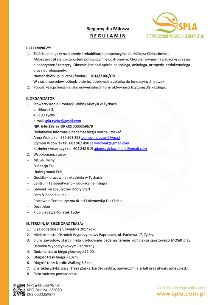 Biegamy dla Miłosza REGULAMIN I. CEL IMPREZY: 1. Zbiórka pieniędzy na leczenie i rehabilitacje pooperacyjna dla Miłosza Kleinschmidt. Miłosz urodził się z przerostem połowiczym lewostronnym. Choruje również na padaczkę oraz na niedoczynność tarczycy. Obecnie jest pod opieka neurologa, onkologa, ortopedy, endokrynologa oraz neurologopedy. Numer zbiórki publicznej fundacji : 2014/2106/OR W czasie zawodów odbędzie sie też dobrowolna zbiórka do fundacyjnych puszek. 2. Popularyzacja biegania jako uniwersalnych form aktywności fizycznej dla każdego. II. ORGANIZATOR 1. Stowarzyszenie Promocji Lekkiej Atletyki w Tychach ul. Sikorek 2, 43-100 Tychy e-mail [email protected] NIP: 646-288-98-09 KRS 0000359679 Dodatkowe Informacje na temat biegu można uzyskać Anna Wolna tel. 669 503 298 [email protected] Szymon Wdowiak tel. 883 902 490 [email protected] Kazimierz Adamczyk tel. 604 848 919 [email protected] 2. Współorganizatorzy: MOSiR Tychy Fundacja Tak Underground Pub Qusidla – pracownia rękodzieła w Tychach Centrum Terapeutyczno – Edukacyjne Integra Gabinet Terapeutyczny Dobry Start Foto & Repo Klaudia Pracownia Terapeutyczna dzieci i niemowląt Dla Ciebie Decathlon Klub biegacza 40-latek Tychy III. TERMIN, MIEJSCE ORAZ TRASA: 1. Bieg odbędzie się 9 kwietnia 2017 roku. 2. Miejsce startu: Ośrodek Wypoczynkowy Paprocany, ul. Parkowa 17, Tychy. 3. Biuro zawodów, start i meta usytuowane będą na terenie kompleksu sportowego MOSiR przy Ośrodku Wypoczynkowym Paprocany. 4. Godzina startu biegu głównego 11.00. 5. Długość trasy biegu – 10km 6. Długość trasy Nordic Walking 6,5km. 7. Charakterystyka trasy: Trasa płaska, bardzo szybka, nawierzchnia asfalt oraz utwardzone ścieżki. 8. Elektroniczny pomiar czasu. IV. UCZESTNICTWO 1. W biegu głównym mogą uczestniczyć osoby, które ukończyły 16 lat do dnia zawodów. 2. W marszu Nordic Walking dopuszcza się uczestnictwo dzieci poniżej 16 lat, pod warunkiem wspólnego marszu z opiekunem prawnym i złożenia pisemnej odpowiedzialności opiekuna za dziecko. 3. Uczestnicy biegu oraz marszu, dokonując rejestracji oświadczają, że nie mają żadnych przeciwskazań zdrowotnych oraz startują na własna odpowiedzialność. 4. Rejestracja oraz wniesienie opłaty startowej traktowane jest jako przyjęcie warunków niniejszego regulaminu. 5. Minimalna opłata startowa za uczestnictwo w biegu i marszu wynosi: 20,00 zł (opłata minimalna oznacza, że biegacz wpłaca wymaganą kwotę, może również wpłacić większą) Cały dochód z imprezy przeznaczony jest na leczenie i rehabilitację Miłosza 6. Opłaty przyjmowane będą na rachunek konta SPLA: Nr konta: BGŻ Tychy 24 2030 0045 1110 0000 0239 8580 , oraz w biurze zawodów nie później niż na 15 minut przed startem. Jako tytuł wpłaty proszę podać: Biegamy dla Miłosza, imię i nazwisko 7. Uczestnik zostaje umieszczony na liście startowej po zaksięgowaniu opłaty startowej. V. ZGŁOSZENIA 1. Zgłoszenia do zawodów przyjmowane są za pomocą formularza zgłoszeniowego znajdującego się na stronie internetowej: www.zapisy.spla.com.pl , oraz w dniu 9 kwietnia 2017 w biurze zawodów w godzinach 9.00 – 10.45 2. Odbiór numerów startowych będzie możliwy w dniu startu, w biurze zawodów w godzinach 9.00 – 10.45. VI. PROGRAM ZAWODÓW 9.00 - 10.45 Biuro zawodów, 11.00 – Start biegu głównego oraz marszu Nordic Walking, 12.30 - poczęstunek, podsumowanie zawodów i zakończenie. VII. POSTANOWEINA KOŃCOWE 1. Uczestników biegu obowiązują przepisy niniejszego regulaminu. 2. Organizator zapewnia opiekę medyczną podczas zawodów. 3. Nierespektowanie regulaminu może być powodem dyskwalifikacji zawodnika. 4. Numer startowy zawodnika winien być przypięty na klatce piersiowej pod groźbą dyskwalifikacji. 5. Organizatorzy zastrzegają sobie prawo do zmiany regulaminu oraz jego ostatecznej interpretacji. 6. Uczestnik dokonując rejestracji oświadcza, że wyraża zgodę na przetwarzanie jego danych osobowych, zgodnie z ustawą z dnia 29.08.1997 r. o ochronie danych osobowych (t.j. Dz. U. z 2014 r. poz. 1182 z późn. zm.), do celów związanych z realizacją zadania oraz celów statutowych SPLA Tychy i MOSiR w Tychach. Zgadza się także, aby jego dane (imię, nazwisko, miasto, klub) pojawiły się na liście zawodników publikowanej w intrenecie, mediach i zdjęciach z wyżej wymienionej imprezy.