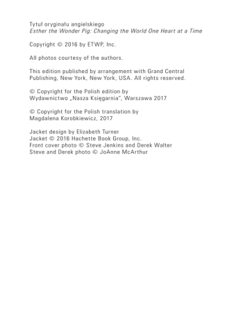 Tytuł oryginału angielskiego Esther the Wonder Pig: Changing the World One Heart at a Time Copyright © 2016 by ET WP, Inc. All photos courtesy of the authors. This edition published by arrangement with Grand Central Publishing, New York, New York, USA. All rights reserved. © Copyright for the Polish edition by Wydawnictwo „Nasza Księgarnia”, Warszawa 2017 © Copyright for the Polish translation by Magdalena Korobkiewicz, 2017 Jacket design by Elizabeth Turner Jacket © 2016 Hachette Book Group, Inc. Front cover photo © Steve Jenkins and Derek Walter Steve and Derek photo © JoAnne McArthur STEVE JENKINS i DEREK WALTER z CAPRICE CRANE C Z Y L I JAK DWÓCH FACE TÓW P OKOCH AŁO ŚW INIĘ Prawdziwa historia najsłynniejszej świnki na świecie Przełożyła Magdalena Korobkiewicz Nasza Księgarnia S T E V E J E N K I N S I D E R E K WA LT E R Od początku wiedziałem, że Derek pokocha Esther. Ma gadane, ale tak naprawdę mięczak z niego. No i dajcie spokój, kto by nie pokochał Esther? Takiej kilogramowej kruszyny o wspaniałej osobowości? Całe szczęście, że była świnką miniaturką i nie mogła urosnąć. Przynajmniej tak nam się zdawało. Rany, ale byliśmy naiwni. Dobra, j a byłem naiwny. W sumie jednak to lepiej, że nie zdawaliśmy sobie z niczego sprawy. Raczej byśmy nie zatrzymali Esther, gdybyśmy wiedzieli, co nas czeka. Poza wszystkim: podjęliśmy się opieki nad prosiątkiem, chociaż nie mieliśmy o tym zielonego pojęcia. Raczej nie traficie w lokalnej księgarni na poradnik Domowy chów trzody chlewnej dla opornych, bo nic takiego nie istnieje. Co zrozumiałe. Trzymanie świnki to niełatwa sprawa – nie sposób tego porównać z doglądaniem innego zwierzaka czy nawet dziecka. Nie zdawaliśmy sobie sprawy, jak trudno jest zabezpieczyć dom przed prosiakiem (świnie są dużo sprytniejsze, niż wam się wydaje) albo znaleźć opiekunkę na czas wyjazdu. Zwykle łatwo daje się kogoś namówić, by zaglądał do kota, a psa można zostawić w hotelu dla zwierząt. Nie ma jednak godnych pole- 34 E S T H E R T H E WO N D E R P I G cenia placówek dla świnek. No a o osobowości świń i ich huśtawce nastrojów mógłbym opowiadać godzinami (nie mówiąc już o świńskim zespole napięcia przedmiesiączkowego!). Gdyby więc ktoś mnie uprzedził, jak poważne zmiany nas czekają, pewnie stanowczo bym odparł: „Mowy nie ma!”. Ale Esther nas oczarowała. Każdego dnia kochaliśmy ją bardziej, kiedy więc pojawiały się problemy, po prostu szukaliśmy rozwiązania (lub usprawiedliwienia dla rzeczy, których nie dawało się zmienić) i żyliśmy dalej. Świnka stała się członkiem rodziny. Zabawne, jak zapadła ta decyzja. Któregoś wieczoru jedliśmy kolację i nagle Derek zaczął wybiegać w przyszłość dużo dalej niż zwykle: „Gdzie będzie się załatwiać? Czy powinniśmy jej zbudować chlewik?”. To wyglądało na poważne zobowiązanie. Ludzie nie budują chlewika dla zwierzaka, którego zamierzają się wkrótce pozbyć. Byłem przeszczęśliwy. Już wiedziałem, że Derek zmiękł. – Więc ją zatrzymamy? – zapytałem z głupawym uśmiechem, choć przecież znałem odpowiedź. Byłem w siódmym niebie. *** 35 S T E V E J E N K I N S I D E R E K WA LT E R Nawet kiedy jeszcze myśleliśmy, że Esther jest miniaturką, nasi bliscy byli zupełnie zdezorientowani. Rodzice Dereka z pewnym trudem przyjęli do wiadomości nasz związek, a teraz rodzina myśliwych i rolników miałaby się pogodzić z tym, że mieszkamy ze świnią? Jako domowym zwierzątkiem? Myśleli, że oszaleliśmy. Świnie się jada! Świnie są brudne! (Tak naprawdę Esther wcale nie jest brudna, przeciwnie. Ślicznie pachnie!). Próbowali uszanować naszą decyzję, ale kiepsko im to wychodziło. Mówili rzeczy w stylu: „Babcia wciąż nie wierzy, że masz świnię” albo: „Trzymasz świnię w domu? Dziadek przewraca się w grobie!”. Przyznaję, na początku było mi trochę przykro. Życie jest dostatecznie skomplikowane i bez ciągłego zamartwiania się tym, czy rodzina akceptuje nasze poczynania. Ze wszystkich sił szukałem akceptacji rodziców Dereka, bo wiedziałem, że ich opinia wiele dla niego znaczy, cokolwiek by na ten temat mówił. Mnóstwo razy miałem ochotę z nim porozmawiać, zmusić go, by stanął w obronie naszego stylu życia i naszych decyzji. Ale tego nie zrobiłem. Rodzina Dereka przeszła bardzo długą drogę i pogodziła się już z wieloma rzeczami – na przykład z tym, że De- 36 E S T H E R T H E WO N D E R P I G rek jest gejem – więc po prostu przyjąłem, że teraz będzie potrzebować trochę więcej czasu. Poza tym to nie było wcale takie trudne – wziąć nas za nieszkodliwych wariatów. Pozwoliliśmy im mówić, co zechcą. Wiedzieliśmy, że kiedyś nas zrozumieją. Rodzice Dereka byli (oczywiście) oszołomieni, tymczasem moja mama podeszła do sprawy na luzie. Całymi latami patrzyła, jak jej syn zakochuje się w każdym napotkanym zwierzątku, i prawie wcale się nie zdziwiła, że któregoś dnia wróciłem do domu ze świnką. 37 S T E V E J E N K I N S I D E R E K WA LT E R Mniej więcej w tym okresie Esther wreszcie poczuła się u nas jak w domu. Chciała się bawić i przytulać, turlać psie zabawki. A my nie widzieliśmy po za nią świata. Jeśli nigdy nie mieliście świnki – a tak zapewne może powiedzieć większość z was – raczej tego nie rozumiecie. Te zwierzęta po prostu są bardzo uczuciowe, przyjazne i kochane, całkiem jak psy czy ko ty. (Szczerze mówiąc, bardziej niż niektóre koty). Nigdy nie spotkałem człowieka, którego nie rozczuliłoby małe zwierzątko. U mnie ten syndrom jest jeszcze mocniejszy. Zawsze wyobrażałem sobie, że kiedyś będę miał dom pełen zwierząt – po dwa zwierzaki każdego gatunku. Chciałem je poznawać, głaskać, przebywać wśród nich. Ale nie zamierzam kłamać – Esther zafascynowała mnie szczególnie. Kiedy ją wzięliśmy, świnki r