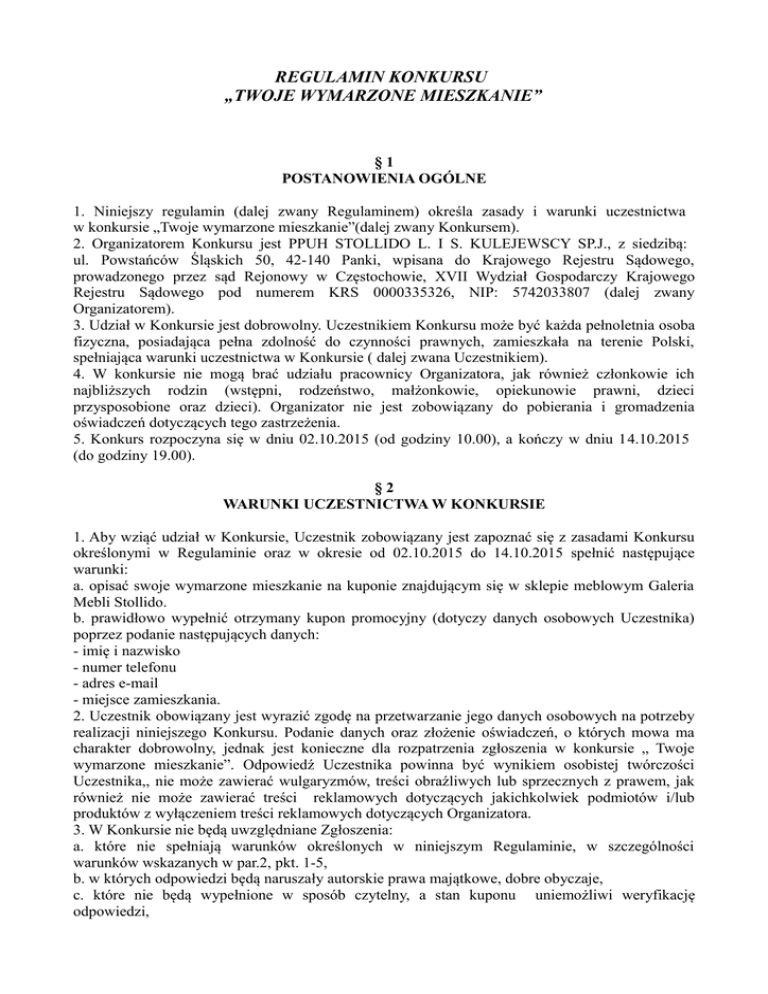 REGULAMIN KONKURSU „TWOJE WYMARZONE MIESZKANIE” §1 POSTANOWIENIA OGÓLNE 1. Niniejszy regulamin (dalej zwany Regulaminem) określa zasady i warunki uczestnictwa w konkursie „Twoje wymarzone mieszkanie”(dalej zwany Konkursem). 2. Organizatorem Konkursu jest PPUH STOLLIDO L. I S. KULEJEWSCY SP.J., z siedzibą: ul. Powstańców Śląskich 50, 42-140 Panki, wpisana do Krajowego Rejestru Sądowego, prowadzonego przez sąd Rejonowy w Częstochowie, XVII Wydział Gospodarczy Krajowego Rejestru Sądowego pod numerem KRS 0000335326, NIP: 5742033807 (dalej zwany Organizatorem). 3. Udział w Konkursie jest dobrowolny. Uczestnikiem Konkursu może być każda pełnoletnia osoba fizyczna, posiadająca pełna zdolność do czynności prawnych, zamieszkała na terenie Polski, spełniająca warunki uczestnictwa w Konkursie ( dalej zwana Uczestnikiem). 4. W konkursie nie mogą brać udziału pracownicy Organizatora, jak również członkowie ich najbliższych rodzin (wstępni, rodzeństwo, małżonkowie, opiekunowie prawni, dzieci przysposobione oraz dzieci). Organizator nie jest zobowiązany do pobierania i gromadzenia oświadczeń dotyczących tego zastrzeżenia. 5. Konkurs rozpoczyna się w dniu 02.10.2015 (od godziny 10.00), a kończy w dniu 14.10.2015 (do godziny 19.00). §2 WARUNKI UCZESTNICTWA W KONKURSIE 1. Aby wziąć udział w Konkursie, Uczestnik zobowiązany jest zapoznać się z zasadami Konkursu określonymi w Regulaminie oraz w okresie od 02.10.2015 do 14.10.2015 spełnić następujące warunki: a. opisać swoje wymarzone mieszkanie na kuponie znajdującym się w sklepie meblowym Galeria Mebli Stollido. b. prawidłowo wypełnić otrzymany kupon promocyjny (dotyczy danych osobowych Uczestnika) poprzez podanie następujących danych: - imię i nazwisko - numer telefonu - adres e-mail - miejsce zamieszkania. 2. Uczestnik obowiązany jest wyrazić zgodę na przetwarzanie jego danych osobowych na potrzeby realizacji niniejszego Konkursu. Podanie danych oraz złożenie oświadczeń, o których mowa ma charakter dobrowolny, jednak jest konieczne dla rozpatrzenia zgłoszenia w konkursie „ Twoje wymarzone mieszkanie”. Odpowiedź Uczestnika powinna być wynikiem osobistej twórczości Uczestnika,, nie może zawierać wulgaryzmów, treści obraźliwych lub sprzecznych z prawem, jak również nie może zawierać treści reklamowych dotyczących jakichkolwiek podmiotów i/lub produktów z wyłączeniem treści reklamowych dotyczących Organizatora. 3. W Konkursie nie będą uwzględniane Zgłoszenia: a. które nie spełniają warunków określonych w niniejszym Regulaminie, w szczególności warunków wskazanych w par.2, pkt. 1-5, b. w których odpowiedzi będą naruszały autorskie prawa majątkowe, dobre obyczaje, c. które nie będą wypełnione w sposób czytelny, a stan kuponu uniemożliwi weryfikację odpowiedzi, d. w których odpowiedzi będą zawierały wulgaryzmy, treści obraźliwe. 4. Uczestnik może udzielić dowolnej liczby odpowiedzi konkursowych, jednak każda z nich powinna zostać opisana na osobnym kuponie konkursowym. 5. W przypadku udzielenia więcej niż jednej odpowiedzi konkursowej, Uczestnik każdorazowo powinien podać te same dane osobowe. Zgłoszenie się do Konkursu przez tę samą osobę z wykorzystaniem różnych danych osobowych traktowane będzie jako rażące naruszenie niniejszego Regulaminu i może skutkować dyskwalifikacją przesłanych odpowiedzi, jak również wykluczeniem danego Uczestnika z Konkursu. 6. W przypadku udzielenia więcej niż jednej odpowiedzi konkursowej. Uczestnik jest uprawiony do otrzymania tylko jednej nagrody za najlepszą z udzielonych odpowiedzi. 7. Kupony konkursowe wypełnione w sposób niekompletny, nieczytelny lub niespełniające warunków określonych w par. 2 pkt 1-5 zostaną uznane za zdyskwalifikowane i tym samym nie będą uprawniały do udziału w Konkursie. 8. Uczestnik, który został zdyskwalifikowany z powodu łamania Regulaminu nie może ponownie brać udziału w Konkursie. 9. O odmowie przyjęcia odpowiedzi konkursowej do udziału w Konkursie, Uczestnik zostanie poinformowany za pośrednictwem wiadomości e-mail wysłanej na adres wskazany w kuponie konkursowym, wraz ze zwięzłym uzasadnieniem podjętej decyzji. 10. Uczestnik przystępując do Konkursu wyraża zgodę na warunki określone w niniejszym Regulaminie. §3 NAGRODY 1. Nagrodami w Konkursie są: a. Nagroda główna: bon podarunkowy o wartości 2000 zł brutto(słownie: dwa tysiące złotych, 00/100) wraz z dodatkową nagrodą pieniężną na pokrycie zryczałtowanego podatku dochodowego od osób fizycznych w wysokości 222 zł (słownie: dwieście dwadzieścia dwa złote 00/100). Łączna wartość nagrody głównej wynosi 2222 zł brutto (dwa tysiące dwieście dwadzieścia dwa złote 00/100), b. Nagrody II stopnia: 2 bony podarunkowe o wartości 500 zł brutto (pięćset złotych 00/100) wraz z dodatkową nagrodą pieniężną na pokrycie zryczałtowanego podatku dochodowego od osób fizycznych w wysokości 56 zł (pięćdziesiąt sześć złotych 00/100). Łączna wartość jednej nagrody II stopnia wynosi 556 zł brutto (pięćset pięćdziesiąt sześć złotych 00/100), c. Nagroda III stopnia: 10 bonów podarunkowych o wartości 200 zł brutto (dwieście złotych 00/100) wraz z dodatkową nagrodą pieniężną na pokrycie zryczałtowanego podatku dochodowego od osób fizycznych w wysokości 22 zł (dwadzieścia dwa złote 00/100). Łączna wartość jednej nagrody III stopnia wynosi 222 zł brutto (dwieście dwadzieścia dwa złote 00/100), d. Nagrody IV stopnia: - materac o wartości 500 zł brutto (pięćset złotych 00/100) wraz z dodatkową nagrodą pieniężną na pokrycie zryczałtowanego podatku dochodowego od osób fizycznych w wysokości 56 zł (pięćdziesiąt sześć złotych, 00/100). Łączna wartość nagrody wynosi 556 zł brutto(pięćset pięćdziesiąt sześć złotych, 00/100). - 2 szt poduszek termoeleastycznych o wartości 10