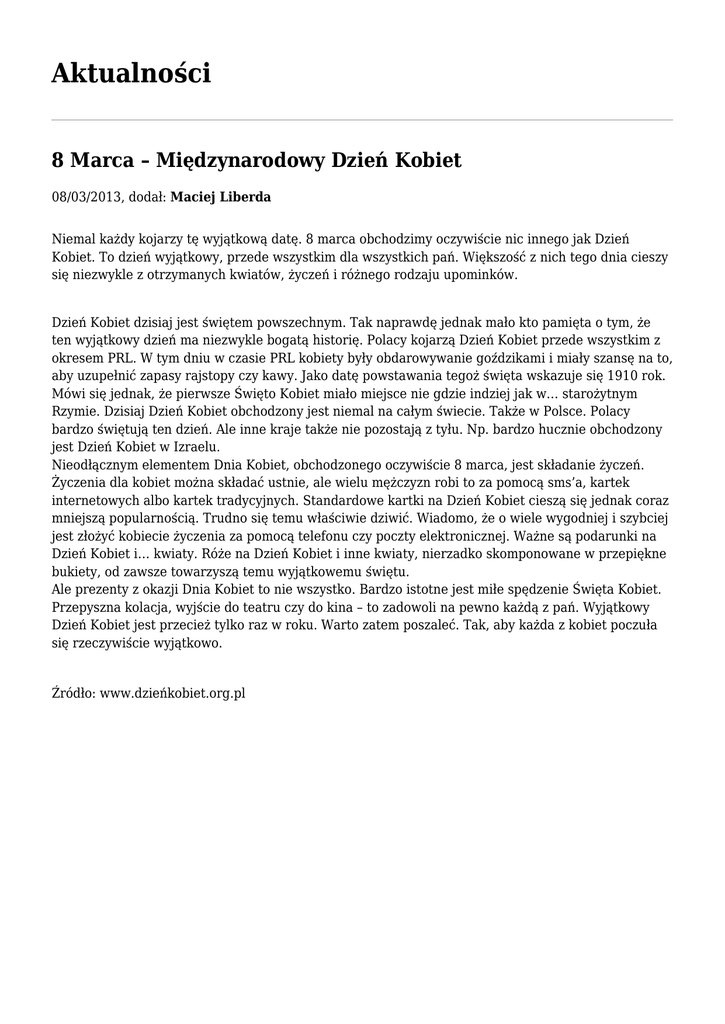 Aktualności 8 Marca – Międzynarodowy Dzień Kobiet 08/03/2013, dodał: Maciej Liberda Niemal każdy kojarzy tę wyjątkową datę. 8 marca obchodzimy oczywiście nic innego jak Dzień Kobiet. To dzień wyjątkowy, przede wszystkim dla wszystkich pań. Większość z nich tego dnia cieszy się niezwykle z otrzymanych kwiatów, życzeń i różnego rodzaju upominków. Dzień Kobiet dzisiaj jest świętem powszechnym. Tak naprawdę jednak mało kto pamięta o tym, że ten wyjątkowy dzień ma niezwykle bogatą historię. Polacy kojarzą Dzień Kobiet przede wszystkim z okresem PRL. W tym dniu w czasie PRL kobiety były obdarowywanie goździkami i miały szansę na to, aby uzupełnić zapasy rajstopy czy kawy. Jako datę powstawania tegoż święta wskazuje się 1910 rok. Mówi się jednak, że pierwsze Święto Kobiet miało miejsce nie gdzie indziej jak w… starożytnym Rzymie. Dzisiaj Dzień Kobiet obchodzony jest niemal na całym świecie. Także w Polsce. Polacy bardzo świętują ten dzień. Ale inne kraje także nie pozostają z tyłu. Np. bardzo hucznie obchodzony jest Dzień Kobiet w Izraelu. Nieodłącznym elementem Dnia Kobiet, obchodzonego oczywiście 8 marca, jest składanie życzeń. Życzenia dla kobiet można składać ustnie, ale wielu mężczyzn robi to za pomocą sms’a, kartek internetowych albo kartek tradycyjnych. Standardowe kartki na Dzień Kobiet cieszą się jednak coraz mniejszą popularnością. Trudno się temu właściwie dziwić. Wiadomo, że o wiele wygodniej i szybciej jest złożyć kobiecie życzenia za pomocą telefonu czy poczty elektronicznej. Ważne są podarunki na Dzień Kobiet i… kwiaty. Róże na Dzień Kobiet i inne kwiaty, nierzadko skomponowane w przepiękne bukiety, od zawsze towarzyszą temu wyjątkowemu świętu. Ale prezenty z okazji Dnia Kobiet to nie wszystko. Bardzo istotne jest miłe spędzenie Święta Kobiet. Przepyszna kolacja, wyjście do teatru czy do kina – to zadowoli na pewno każdą z pań. Wyjątkowy Dzień Kobiet jest przecież tylko raz w roku. Warto zatem poszaleć. Tak, aby każda z kobiet poczuła się rzeczywiście wyjątkowo. Źródło: www.dzieńkobiet.org.pl