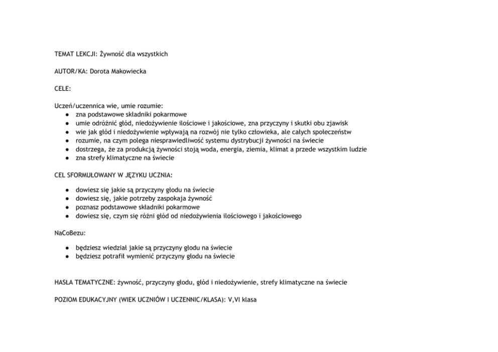 TEMAT LEKCJI: Żywność dla wszystkich AUTOR/KA: Dorota Makowiecka CELE: Uczeń/uczennica wie, umie rozumie: ● zna podstawowe składniki pokarmowe ● umie odróżnić głód, niedożywienie ilościowe i jakościowe, zna przyczyny i skutki obu zjawisk ● wie jak głód i niedożywienie wpływają na rozwój nie tylko człowieka, ale całych społeczeństw ● rozumie, na czym polega niesprawiedliwość systemu dystrybucji żywności na świecie ● dostrzega, że za produkcją żywności stoją woda, energia, ziemia, klimat a przede wszystkim ludzie ● zna strefy klimatyczne na świecie CEL SFORMUŁOWANY W JĘZYKU UCZNIA: ● ● ● ● dowiesz się jakie są przyczyny głodu na świecie dowiesz się, jakie potrzeby zaspokaja żywność poznasz podstawowe składniki pokarmowe dowiesz się, czym się różni głód od niedożywienia ilościowego i jakościowego NaCoBezu: ● ● będziesz wiedział jakie są przyczyny głodu na świecie będziesz potrafił wymienić przyczyny głodu na świecie HASŁA TEMATYCZNE: żywność, przyczyny głodu, głód i niedożywienie, strefy klimatyczne na świecie POZIOM EDUKACYJNY (WIEK UCZNIÓW I UCZENNIC/KLASA): V,VI klasa PRZEDMIOT: godzina wychowawcza, przyroda, etyka ODWOŁANIA DO PODSTAWY PROGRAMOWEJ: Uczeń: ● ● ● ● ● ● wyjaśnia znaczenie odżywiania się w prawidłowym funkcjonowaniu organizmu wymienia zasady zdrowego stylu życia i uzasadnia konieczność ich stosowania podaje przykłady współzależności między składnikami krajobrazu, zwłaszcza między klimatem (temperatura powietrza, opady atmosferyczne) a rozmieszczeniem roślin umie pracować w grupie dostrzega różnorodność postaw i zachowania ludzi rozpoznaje podstawowe wartości i dokonuje właściwej ich hierarchizacji CO TRZEBA PRZYGOTOWAĆ PRZED ROZPOCZĘCIEM LEKCJI? ● ● ● ● ● karty pracy, puzzle ze zdjęć, pocięte infografiki atlas przyrodniczy tablica multimedialna filmy klej Czas Cel metody 5 min 20 min Opis metody ● ● Wprowadzenie do tematu Potrzebne materiały (np. flipczart, link do filmu, załącznik nr…) Powitanie, sprawy organizacyjne Podanie celu i tematu lekcji Nauczyciel/ka informuje uczniów i uczennice, Cel lekcji zapisany jest na że na zajęciach zostanie poruszony dostęp do tablicy, tak aby był widoczny żywności na całym świecie, jakie są przyczyny przez całe zajęcia. głodu na świecie i czy można ten problem w jakiś sposób rozwiązać. Nauczyciel/ka dzieli klasę na 5 grup: uczniowie Załącznik nr 1 losują grupę za pomocą obrazków przedstawiających podstawowe składniki pokarmowe(mleko->białko, masło->tłuszcze, słodycze->cukry, jabłko –>witaminy, kropla wody –>sole mineralne). Każda grupa otrzymuje arkusz szarego papieru z Szary papier, kolorowe napisanym na środku słowem ŻYWNOŚĆ. flamastry, magnesy lub taśma Zadaniem uczniów i uczennic jest utworzenie klejąca mapy mentalnej (burza mózgów), dot skojarzeń z żywnością. Pytanie: Z czym kojarzy Wam się żywność? Uczniowie i uczennice wypisują wszystkie swoje skojarzenia (produkty, owoce warzywa, uprawa, Uwagi i warianty ćwiczenia Na co należy zwrócić uwagę? przetwarzanie, słońce, deszcz, ulubione potrawy, wspólne posiłki itd, porządkują według klucza, który sami wymyślają). Po skończonym zadaniu uczniowie i uczennice wieszają plakaty w sali i prezentują jeodczytują swoją mapę mentalną. Przechodzimy do podsumowania zadania. 15 min Przypomnienie podstawowych składników pokarmowych. Nawiązanie do podziału na grupy – uczniowie dochodzą do wniosku, że zostali podzieleni według podstawowych składników pokarmowych. Nauczyciel pokazuje uczestnikom i uczestniczkom lekcji cykl zdjęć, i prosi o zastanowienie się nad odpowiedzią na poniższe pytania: Jakie są podstawowe składniki potrzebne do życia (czyli białko, tłuszcze, cukry, witaminy, woda) ? – utrwalamy informacje z poprzednich lekcji Artykuł: Hungry Planet: What the World Eats Link do strony: http://time.com/8515/what-theworld-eats-hungry-planet/ Pod zdjęciem w prawnym dolnym rogu znajdują się strzałki, które należy używać chcąc pokazać zdjęcia. Pytania można powiesić w widocznym miejscu w klasie. Jakie składniki i produkty nie są potrzebne do życia? Jakie znaczenie ma ilość spożywanej żywności? Czy fakt, że żywność jest urozmaicona ma znaczenie? 5 min Podsumowanie zajęć Pytanie kluczowe: Żyjemy po to aby jeść, czy jemy po to aby żyć? To jest propozycja pytania, może być inne, dotyczące najciekawszych dla uczniów kwestii. 5 min Wprowadzenie pojęcia głodu i niedożywienia Krótka pogadanka co to jest głód, nauczyciel wprowadza pojęcia: niedożywienie jakościowe(czy jedzenie jest urozmaicone, czy są wszystkie składniki odżywcze) i ilościowe(czy jest odpowiednia ilość). Nawiązanie do poprzedniej godziny 10 min Poznanie niektórych czynników, które mają wpływ na niedożywienie. Uczniowie pozostają dalej w 5 grupach z poprzedniej lekcji. Otrzymują kolejne zadanie. Dodatkowe materiały dla nauczycieli zaczerpnięte z publikacji PAH-Prawo do żywności – część I(przyczyny głodu na świecie) Każda grupa dostaje zestaw, który zawiera puzzle ze zdjęć. Po ułożeniu puzzli odwracając na drugą stronę (tył - tam gdzie nie ma obrazka) uczniowie i uczennice otrzymują hasła – czynniki, które wpływają na głód i niedożywienie na świecie. Hasła które powinny być zapisane na odwrocie zdjęć: 1. Zmiany Klimatu 2. Rywalizacja o dostęp do ziemi: Biopaliwa i pasze dla zwierząt 3. Brak środków na produkcję żywności 4. Konflikty Zbrojne 5. Marnowanie żywności Zapytaj uczniów jak sądzą, w jaki sposób przedstawione na zdjęciach zjawiska Załącznik nr 2 Zdjęcia pochodzą z publikacji PAH-Prawo do żywności. Link do materiałów: http://www.pah.org.pl/naszedzialania/53/wyszukiwarka_m aterialow Zdjęcie pochodzi ze strony CSR.PL http://csr.pl/article/126/ Zdjęcie pochodzi 