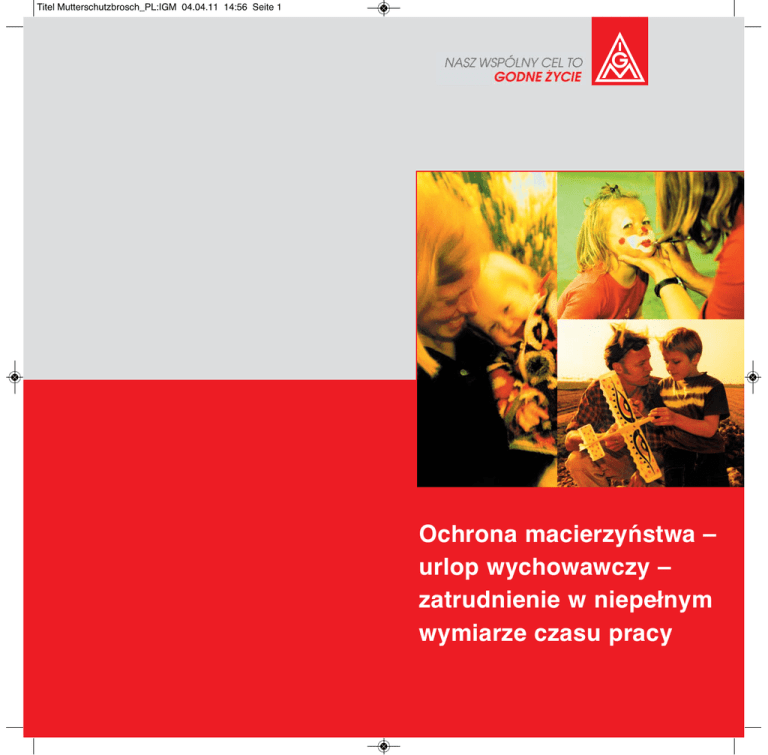 Titel Mutterschutzbrosch_PL:IGM 04.04.11 14:56 Seite 1 Ochrona macierzyństwa – urlop wychowawczy – zatrudnienie w niepełnym wymiarze czasu pracy Mutterschutzbro_2011_PL.qxp 04.04.2011 15:19 Uhr Seite 1 Spis treści 1. Ochrona macierzyństwa 2. Zasiłek wychowawczy i ustawa o urlopie wychowawczym (informacje ogólne) a) Urlop wychowawczy b) Zasiłek wychowawczy c) Zatrudnienie w niepełnym wymiarze czasu pracy w okresie urlopu wychowawczego 2 11 12 20 27 3. Roszczenie zatrudnienia w niepełnym wymiarze czasu pracy w myśl ustawy (Teilzeit- und Befristungsgesetz) 34 4. „Utrzymywanie kontaktu z zakładem pracy“ Doskonalenie zawodowe w okresie urlopu wychowawczego 40 5. Broszury i ulotki 43 Mutterschutzbro_2011_PL.qxp 04.04.2011 15:19 Uhr Seite 2 1. Ochrona macierzyństwa Ochrona macierzyństwa jest ochroną zdrowia pracujących kobiet. Polega ona na kompleksowej i wcześnie rozpoczynającej się profilaktyce zdrowotnej matki i dziecka oraz finansowym zabezpieczeniu egzystencji matki w okresie ciąży i w pierwszych tygodniach po urodzeniu dziecka. Wiadomość Celem zalecanego powiadomienia o ciąży: pracodawcy jest stworzenie możliwości powiadomienie prawomocnego zastosowania w pracodawcy interesie matki i dziecka przepisów opieki zdrowotnej i ochrony społecznej przewidzianych ustawą o ochronie macierzyństwa. Podany w zaświadczeniu lekarskim lub w zaświadczeniu położnej przypuszczalny termin porodu stanowi podstawę wyliczenia sześciotygodniowego terminu ustawowej ochrony. Okres ochrony Okres ochrony macierzyństwa macierzyństwa rozpoczyna się sześć tygodni przed narodzeniem i kończy osiem tygodni po narodzinach dziecka (12 tygodni w przypadku porodu przedwczesnego i porodu mnogiego). 2 Mutterschutzbro_2011_PL.qxp 04.04.2011 15:19 Uhr Przez ostatnich sześć tygodni przed narodzinami dziecka obowiązuje ogólny zakaz wykonywania pracy zawodowej przez przyszłe matki. Mogą one dalej pracować tylko wtedy, jeśli same zdecydowanie wyrażą na to gotowość. W każdej chwili mogą się z tego wycofać. Po narodzinach dziecka kobiety nie mogą wykonywać pracy zawodowej aż do upływu ósmego tygodnia (lub dwunastego w przypadku porodu przedwczesnego i porodu mnogiego). Chodzi tutaj o absolutny zakaz wykonywania pracy zawodowej. W okresie ochrony macierzyństwa kobiety pracujące, ubezpieczone ustawowo, otrzymują zasiłek macierzyński w wysokości 13 euro na dzień, tzn. 364 euro lub 403 euro w zależności od długości miesiąca. Kobiety pracujące, ubezpieczone prywatnie, nie otrzymują zasiłku macierzyńskiego liczonego w kwotach dziennych, lecz w kwocie jednorazowej za cały okres w wysokości 210 euro. 3 Zasiłek macierzyński Seite 3 Mutterschutzbro_2011_PL.qxp 04.04.2011 15:19 Uhr Seite 4 Dodatek Pracodawca płaci „dodatek“ do zasiłku pracodawcy macierzyńskiego. Jego wysokość nie do zasiłku jest uzależniona od członkowstwa w macierzyńskiego ustawowej kasie chorych i odpowiada całkowitej różnicy między 13 euro i przeciętnym wynagrodzeniem za pracę netto, przeliczanym na dzień kalendarzowy. Przeciętne wynagrodzenie za pracę netto, przeliczane na dzień kalendarzowy, zależy od zarobków z ostatnich trzech rozliczonych miesięcy kalendarzowych przed rozpoczęciem okresu ochrony macierzyństwa. Całkowity dochód netto z ostatnich trzech miesięcy dzieli się przez 90. Kobiety Kobiety pracujące w ramach „Minipracujące Job“ mają w myśl prawa pracy takie zawodowo same prawa jak ich koleżanki w ramach zatrudnione w pełnym wymiarze zatrudnienia czasu pracy. Prawa przysługujące w tzw. kobietom pracującym w ramach „Mini„Mini-Jobs“ Job“ i przewidziane prawem pracy a ochrona ustawowo lub wynikające ze macierzyństwa zbiorowego układu pracy są przed nimi jednak niejednokrotnie zatajane. 4 Mutterschutzbro_2011_PL.qxp 04.04.2011 Kobiety pracujące w ramach „MiniJob“ w większości przypadków same nie są członkami ustawowej kasy chorych, lecz są ubezpieczone przez małżonka. Dlatego też otrzymują tak jak kobiety ubezpieczone prywatnie - zasiłek macierzyński od Federalnego Urzędu Ubezpieczeń. Zasiłek ten wynosi maksymalnie 210 euro za okres ochrony i wypłacany jest tylko wtedy, jeśli spełniony jest jeden z następujących warunków: • kobieta zatrudniona była na początku okresu ochrony (zalicza się do tego jednoznacznie także stosunek pracy w wymiarze ograniczonym, czyli „Mini-Job“), • stosunek pracy został w trakcie trwania ciąży w sposób dozwolony rozwiązany przez pracodawcę. Jest to możliwe tylko za zgodą odpowiedzialnego organu kraju związkowego, np. urzędu nadzoru nad działalnością gospodarczą. 5 15:19 Uhr Seite 5 Mutterschutzbro_2011_PL.qxp 04.04.2011 15:19 Uhr Seite 6 Wniosek o zasiłek macierzyński można złożyć w Federalnym Urzędzie Ubezpieczeń: Bundesversicherungsamt, Friedrich-Ebert-Allee 38, 53113 Bonn. Kobiety pracujące, ubezpieczone prywatnie, oraz takie, które same nie są ubezpieczone ustawowo mogą otrzymać od momentu narodzin dziecka zasiłek wychowawczy w pełnej wysokości, który – nie tak, jak w przypadku kobiet ubezpieczonych ustawowo – nie jest przeliczany z zasiłkiem macierzyńskim. Stosunki Także kobiety zatrudnione w tzw. zatrudnienia w „Gleitzone“ otrzymują - tak jak tzw. „Gleitzone“ wszystkie kobiety pracujące i (wynagrodzenia ubezpieczone ustawowo - podczas między 400,01 okresu ochrony macierzyństwa zasiłek i 800,00 euro) macierzyński od swojej kasy chorych, który pracodawca wyrównuje do wysokości wynagrodzenia netto. Wniosek o Kobiety pracujące, ubezpieczone zasiłek ustawowo, składają wniosek o macierzyński i zasiłek macierzyński w swojej kasie dodatek chorych. Kobiety, które ubezpieczone pracodawcy są prywatnie lub same nie są 6 Mutterschutzbro_2011_PL.qxp 04.04.2011 15:19 Uhr członkiem ustawowej kasy chorych otrzymują zasiłek macierzyński na wniosek od Federalnego Urzędu Ubezpieczeń - Bundesversicherungsa
