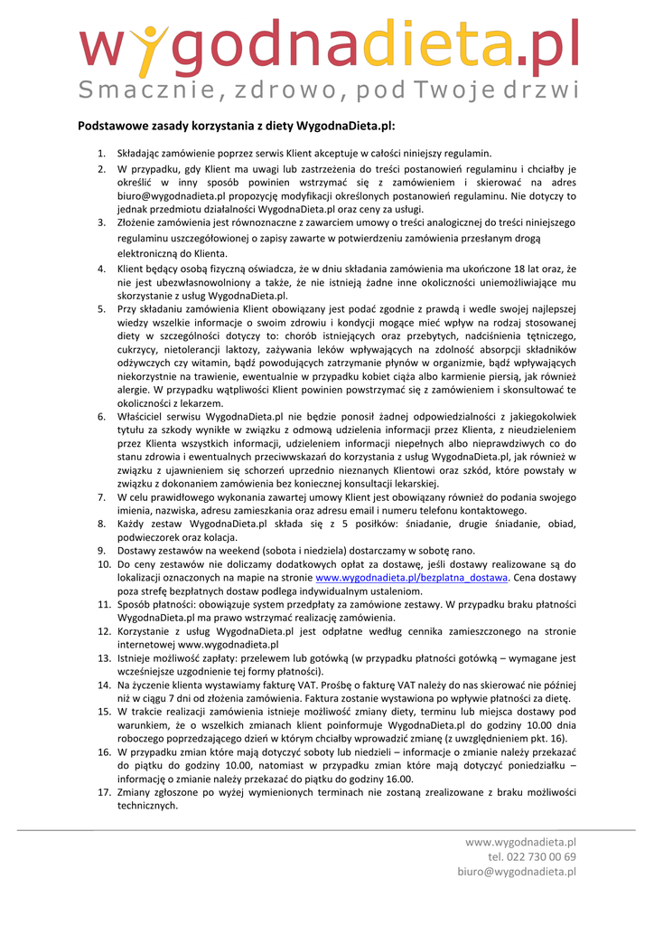 Podstawowe zasady korzystania z diety WygodnaDieta.pl: 1. 2. 3. 4. 5. 6. 7. 8. 9. 10. 11. 12. 13. 14. 15. 16. 17. Składając zamówienie poprzez serwis Klient akceptuje w całości niniejszy regulamin. W przypadku, gdy Klient ma uwagi lub zastrzeżenia do treści postanowień regulaminu i chciałby je określić w inny sposób powinien wstrzymać się z zamówieniem i skierować na adres [email protected] propozycję modyfikacji określonych postanowień regulaminu. Nie dotyczy to jednak przedmiotu działalności WygodnaDieta.pl oraz ceny za usługi. Złożenie zamówienia jest równoznaczne z zawarciem umowy o treści analogicznej do treści niniejszego regulaminu uszczegółowionej o zapisy zawarte w potwierdzeniu zamówienia przesłanym drogą elektroniczną do Klienta. Klient będący osobą fizyczną oświadcza, że w dniu składania zamówienia ma ukończone 18 lat oraz, że nie jest ubezwłasnowolniony a także, że nie istnieją żadne inne okoliczności uniemożliwiające mu skorzystanie z usług WygodnaDieta.pl. Przy składaniu zamówienia Klient obowiązany jest podać zgodnie z prawdą i wedle swojej najlepszej wiedzy wszelkie informacje o swoim zdrowiu i kondycji mogące mieć wpływ na rodzaj stosowanej diety w szczególności dotyczy to: chorób istniejących oraz przebytych, nadciśnienia tętniczego, cukrzycy, nietolerancji laktozy, zażywania leków wpływających na zdolność absorpcji składników odżywczych czy witamin, bądź powodujących zatrzymanie płynów w organizmie, bądź wpływających niekorzystnie na trawienie, ewentualnie w przypadku kobiet ciąża albo karmienie piersią, jak również alergie. W przypadku wątpliwości Klient powinien powstrzymać się z zamówieniem i skonsultować te okoliczności z lekarzem. Właściciel serwisu WygodnaDieta.pl nie będzie ponosił żadnej odpowiedzialności z jakiegokolwiek tytułu za szkody wynikłe w związku z odmową udzielenia informacji przez Klienta, z nieudzieleniem przez Klienta wszystkich informacji, udzieleniem informacji niepełnych albo nieprawdziwych co do stanu zdrowia i ewentualnych przeciwwskazań do korzystania z usług WygodnaDieta.pl, jak również w związku z ujawnieniem się schorzeń uprzednio nieznanych Klientowi oraz szkód, które powstały w związku z dokonaniem zamówienia bez koniecznej konsultacji lekarskiej. W celu prawidłowego wykonania zawartej umowy Klient jest obowiązany również do podania swojego imienia, nazwiska, adresu zamieszkania oraz adresu email i numeru telefonu kontaktowego. Każdy zestaw WygodnaDieta.pl składa się z 5 posiłków: śniadanie, drugie śniadanie, obiad, podwieczorek oraz kolacja. Dostawy zestawów na weekend (sobota i niedziela) dostarczamy w sobotę rano. Do ceny zestawów nie doliczamy dodatkowych opłat za dostawę, jeśli dostawy realizowane są do lokalizacji oznaczonych na mapie na stronie www.wygodnadieta.pl/bezplatna_dostawa. Cena dostawy poza strefę bezpłatnych dostaw podlega indywidualnym ustaleniom. Sposób płatności: obowiązuje system przedpłaty za zamówione zestawy. W przypadku braku płatności WygodnaDieta.pl ma prawo wstrzymać realizację zamówienia. Korzystanie z usług WygodnaDieta.pl jest odpłatne według cennika zamieszczonego na stronie internetowej www.wygodnadieta.pl Istnieje możliwość zapłaty: przelewem lub gotówką (w przypadku płatności gotówką – wymagane jest wcześniejsze uzgodnienie tej formy płatności). Na życzenie klienta wystawiamy fakturę VAT. Prośbę o fakturę VAT należy do nas skierować nie później niż w ciągu 7 dni od złożenia zamówienia. Faktura zostanie wystawiona po wpływie płatności za dietę. W trakcie realizacji zamówienia istnieje możliwość zmiany diety, terminu lub miejsca dostawy pod warunkiem, że o wszelkich zmianach klient poinformuje WygodnaDieta.pl do godziny 10.00 dnia roboczego poprzedzającego dzień w którym chciałby wprowadzić zmianę (z uwzględnieniem pkt. 16). W przypadku zmian które mają dotyczyć soboty lub niedzieli – informacje o zmianie należy przekazać do piątku do godziny 10.00, natomiast w przypadku zmian które mają dotyczyć poniedziałku – informację o zmianie należy przekazać do piątku do godziny 16.00. Zmiany zgłoszone po wyżej wymienionych terminach nie zostaną zrealizowane z braku możliwości technicznych. www.wygodnadieta.pl tel. 022 730 00 69 [email protected] 18. Wszelkie zmiany WygodnaDieta.pl potwierdza poprzez wysłanie mail’a na adres wskazany przez klienta. 19. W przypadku dokonania zmiany w postaci np.: zmiany miejsca dostaw (np. na miejsce poza strefą bezpłatnych dostaw), zmiany rodzaju diety (na dietę której cena jest wyższa), czy też w przypadku rezygnacji z diety w trakcie jej trwania (co spowoduje utratę uprawnień do uzyskania zniżki), klient jest zobligowany do uregulowania należności która powstała z tytuły zmiany. 20. W przypadku gdy dokonane przez klienta zmiany powodują „nadpłatę” w stosunku do pierwotnego zamówienia – klient ma do wyboru: możliwość zwrotu powstałej nadpłaty lub możliwość rozliczenia nadpłaty przy następnym zamówieniu. W przypadku zwrotu środków – niezbędne jest pisemne oświadczenie klienta z prośbą o zwrot z numerem rachunku bankowego do zwrotu. 21. Bez względu na okoliczności zawsze staramy się dostarczyć zestawy do klienta, jednak w przypadku nieodebrania zestawu z winy klienta (np. brak klienta lub osoby upoważnionej do odbioru zestawu w ustalonym miejscu dostawy, w ustalonym przedziale czasowym) – WygodnaDieta.pl nie zwróci należności za nieodebrane przez klienta zestawy. 22. W przypadku niedostarczenia zestawów z winy WygodnaDieta.pl, WygodnaDieta.pl zobowiązuje się: dostarczyć zestawy pod inny wskazany przez klienta adres (jeżeli leży to w możliwościach technicznych WygodnaDieta.pl) lub zrealizować te zestawy w innym uzgodnionym z klientem terminie. Wybór spośród powyższych opcji jest uzgadniany każd