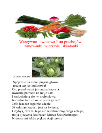 Warzywno- owocowa lista przebojówrymowanki, wierszyki, składanki „Cudna kapusta” Spójrzcie na mnie, piękna głowa, reszta też jest odlotowa! Oto przed wami ja- cudna kapusta uważnie patrzcie na moje usta i wsłuchajcie się w moje słowa, bo żadna tam ze mnie pusta głowa! Jeśli jeszcze tego nie wiecie, 38 odmian kapust jest na świecie. Gdybyś jeszcze tego nie wiedział mój drogi kolego, moją ojczyzną jest basen Morza Śródziemnego! Nieobce mi także piękne Azji tereny nie wierzysz, mówię jak jest- bez żadnej ściemy! Moje piękne imię z łaciny pochodzi, czego „Słownik języka polskiego” dowodzi. Znali mnie już starożytni Rzymianie, wiedzieli, że zdrowe jest mnie spożywanie. Zawieram mnóstwo witamin i moc minerałów leczę różne choroby, ograniczam ilość zawałów. Boją się mnie choroby płuc i żołądka wrzody, pomagam stawom, przynoszę ulgę dla wątroby! Do Polski z królową Bona przywędrowałam, swój pierwszy dom na Wawelu miałam. Najpierw niechętnie na mnie tu zerkano, później ze smakiem mną się zajadano. Na Śląsku moja siostra modra króluje tam z kluskami najlepiej smakuje. W Niemczech to mnie dopiero kochają nawet mam swój dzień, który świętem nazywają. W dawnych czasach oddawano mi cześć, a teraz ty masz mnie po prostu jeść! Pod każdą postacią i w każdym stanie jedz mnie na obiad, kolację, śniadanie! Jestem także najlepsza na świecie, dla tych co dbają o linię i są na diecie. Mało mam kalorii, mnóstwo witaminek dla wszystkich mądrych chłopców i dziewczynek! klasa V c PAPRYKA Czerwona, pomarańczowa, żółta i zielona, Oto kolory super warzywnego balona. Balona, który niczym witaminowa bomba tyka, Wiesz jakie to warzywo? - To papryka! Inne warzywa niech się lepiej schowają, Bo tyle witamin co ona ma w sobie nie mają. Przy tym chrupiąca, soczysta i kolorowa, Papryka jest po prostu wystrzałowa! Jedz ją zawsze kiedy się da, A Twój organizm zatańczy lambada. Niech nam żyje 100 lat nasza dama Przepyszna PA-PRY-KA ukochana!!! Autor: Zuzanna Różańska, kl. IV b PAPRYKA Nie każdy ją lubi chyba, Choć zdrowa jest- jak ryba. Jakie są jej kolory? Czerwony, żółty i zielony. Kolory te mogą być różne, ale nigdy niepróżne. Jedz paprykę , będziesz zdrów, i na zawsze kochaj ruch. Autor: Zuzanna Machała , kl. IV b Jedz paprykę ! To jest to ! Jest przepyszna ,że ho, ho ! Czy skosztujesz ? Czy żałujesz ? Bo papryka fajna sprawa no i śmieszna jest zabawa. Czy czerwona czy zielona zawsze moja ulubiona ! Czy wy wiecie że w kotlecie zjesz paprykę nawet w lecie Jedz paprykę i smacznego, koleżanko i kolego ! Czekoladki lubi Grześ, ja paprykę wolę zjeść. Każdy przecież co innego może mieć ulubionego. Chipsy, frytki lubi Jaś. Ja paprykę wolę zaś. Autor: Klara Niksińska, klasa IV b PAPRYKA O czym tu napisać wiersz? Może o pietruszce i gruszce albo o kalafiorku i szczypiorku? Nie już wiem. To będzie wiersz o PAPRYCE. Posłuchajcie. Była sobie czarownica straszna była z niej psotnica. Kiedyś słonecznego ranka przez okienko zobaczyła ,że na krzaczku paprykowym rośnie sobie czerwoniutka i malutka papryka. Już przed domek wyleciała, już do krzaczka podleciała. Kiedy nagle się zdziwiła: Co to?- mówi zawiedziona. Co się z mą papryką stało? Nagle nasza ta papryka ciut się w boczek przechyliła. Co to czarownica widzi? A papryka uśmiechnięta na nią swoim okiem zerka. Nagle zeskoczyła z krzaczka i już biegnie do jej domku. Czarownica za nią leci i potyka się o śmieci. I tak w domku czarownicy zamieszkała papryka. PAPRYCZKA Dwie malutkie siostry Dory, Lubią zjadać pomidory, Zaś córeczka Ewki uwielbia marchewki. Wszyscy ci, co skaczą z tyczką, zajadają się papryczką. Bo w papryczce, każdy wie, Są witaminy: C, A i E. Kiedy papryczka w daniu jest, zdamy najtrudniejszy test. Jest kolorowa- żółta, czerwona, czasem zielona, A gdy jury miałoby ocenić jej smak, Każdy by powiedział: tak, tak. I ja Wam mówię: jeśli spróbujecie , to nigdy się jej nie oprzecie. Autor: Klaudia Parczewska, IV b Od witamin z pomarańczy, cała szkoła tańczy, Fika, pląsa i wiruje, Bo się dobrze czuje. Klasa V b „Pomidory” Mogą być mniejsze i większe, Ale wszystkie są zdrowe, Znamy je tez jako koktajlowe. Są one pełne potasu i witamin, Rośnie na gałązce, a drugi za nim. Te pyszne pomidory wspomagają nasz układ nerwowy I robi się z nich wyśmienity sos pomidorowy. Te warzywa jemy często, niech w szklarniach rosną gęsto. Okrągłe, czerwone, dojrzałe pomidory, Wszyscy je zjadamy, chętniej niż pory. Nie tylko jako warzywa surowe, Ale też jako jedzenie obiadowe. Bo zupa pomidorowa taką jest, Chętnie ją zjadamy też. A kiedy frytki polejemy ketchupem, to wtedy łykamy je susem. Na pomidora rano tez mamy chęć, By na kanapce z ogórkiem zjeść. Tak oto pomidora wychwalam Bo to pychota, co nie miara. Klasa V d W całym rok w różnych porach, Znajdę czas na pomidora. Kolacja, obiad czy śniadanie, na niego czas znajdę. Jest czerwony, w nim witaminy, Jest dobry dla chłopaka i dziewczyny. Sosik, przecier czy w całości, Na moim stole pomidor niech gości. Natalia Gutkowska, V d Cebula, cebula, tańcować chciała, ale nikogo nie znała. Sukienka czerwona, zielony kubraczek, soczek z tej panienki, przepyszny ma smaczek. Przez rurkę czy smoczek- marchwiowy pij soczek! Chłopak pije z marchwi soczek, dziewczyna go kocha, Ale gdy go rzuci, on łzami z marchwi szlocha. Dziadek pije soczek, babcia soczek pije, Bo dzięki marchewce, dłużej się pożyje! Klasa IV d HISTORIA ZIEMNIACZKA Był sobie raz ziemniaczek, taki warzywny naiwniaczek. Czekał całe tygodnie, dnie, godziny, żeby wyrosły z niego wreszcie rośliny. Niestety, gdy go wyrwano, głośnym tonem uznano: -To nie jest ziemniak! To kapusta! I wpakowano go w czyjeś usta ! PYSZNY ZIEMNIACZEK Pewnego razu był sobie ziemniaczek mały, Który żył tylko dla ziemniaczanej chwały. Rzuci
