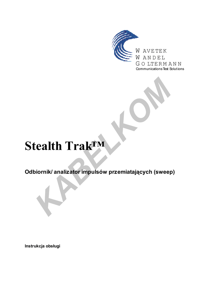W AV E TE K W A N D EL G O LTE R M A N N K O M Communications Test Solut ions EL Stealth Trak™ K A B Odbiornik/ analizator impulsów przemiatających (sweep) Instrukcja obsługi WAVETEK Instrukcja obsługi M Model SSA-1000 StealthTrak O Przeznaczony do analizy impulsów przemiatających, kanału zwrotnego i sygnałów cyfrowych. B EL K Dokument ten zawiera informacje będące własnością firmy Wavetek. Informacje zawarte w tym dokumencie nie mogą zostać użyte ani powielone w żaden sposób bez uprzedniego uzyskania na to zgody na piśmie od firmy Wavetek. A Tłumaczył: mgr inż. M arek Nalewajko, KABELKOM Sp. z o.o. http://www.kabelkom.pl [email protected] K Wavetek Oddział CATV 5808 Churchman Bypass Indianapolis, IN 46203-6109 (800)851-1198 (317)788-9351 Fax: (317)782-4607 E-mail: [email protected] www.wavetek.com 7/98 Rev.A M anual Part No. 6510-00-0433 2 Rozdział 1 1.1. Wprowadzenie M iernik StealthTrak SSA-1000 jest: wielostronnym narzędziem do odbioru i nadawania impulsów przemiatających (sweep) w paśmie kanału dosyłowego jak i zwrotnego zaawansowanym analizatorem widma, którym można mierzyć impulsy wnikające i zakłócenia szumowe o czasie trwania już od 5 µs narzędziem do analizy sygnałów cyfrowych umożliwiającym wyświetlanie charakterystyk jakościowych sygnałów TDM A M M iernik StealthTrak jest kompatybilny z dotychczas istniejącymi wersjami oprogramowania mierników serii STEALTH, poczynając od wersji 9.3 lub wyższej. EL K O Prowadzenie wyczerpującego poszukiwania przyczyn usterek oraz pomiarów planowo-zapobiegawczych jest łatwe i dokładne przy wykorzystaniu systemu StealthTrak firmy Wavetek. Łatwo i szybko wykonuje się pomiary odpowiedzi częstotliwościowej, mierzy i zapamiętuje parametry i poziom sygnału, przydźwięku sieci, stosunku sygnał-szum (C/N), głębokość modulacji oraz inne charakterystyczne parametry sieci kablowej. System Stealth umożliwia prowadzenie pomiarów nie zakłócających obsługę abonentów. System Stealth wraz z miernikiem StealthTrak pomaga pracownikom technicznym precyzyjnie rozwijać możliwości systemu kablowego oraz szybko diagnozować i eliminować powstające problemy. Tym samym pomaga w prawidłowej obsłudze wyposażenia sieci CATV. W zwartej , łatwo przenośnej obudowie wbudowany jest wielostronny asystent pomagający w rozwiązywaniu problemów B 1.2 Miernik S tealthTrak w ramach typoszeregu mierników S tealthS weep A System StealthTrak składa się z dwóch głównych składników – z nadajnika sygnałów Stealth zlokalizowanego w stacji czołowej ( typu 3SR lub 3HRV) oraz z przenośnego odbiornika StealthTrak. K Nadajniki sygnałów S weep do stacji czołowej 3S T/3HRV Aby skontrolować odpowiedź częstotliwościową Waszego systemu, zlokalizowany w stacji czołowej nadajnik 3ST nadaje sygnały o niskim poziomie w zakresie częstotliwości kanału dosyłowego, umieszczając je w miejscach nie zajętych przez sygnały użyteczne. M iernik 3ST monitoruje także ciągle poziom nośnych w wykorzystywanym zakresie częstotliwości w celu ich wykorzystania w metodzie tzw. Sweepless®sweep, która wykorzystuje częstotliwości nośne jako sygnały przemiatające. W uzupełnieniu generowanych sygnałów oraz wykorzystywanych nośnych miernik 3ST wysyła odczytane w stacji czołowej poziomy tych sygnałów odbierane następnie przez mierniki StealthTrak i 3SRx. Ta technika umożliwia odbiornikom kompensować zmiany w poziomie sygnału, zapewniając przez to maksymalną dokładność 3 pomiarów. M iernik 3HRV posiada wszystkie możliwości mierników 3ST za wyjątkiem nadawania impulsów przemiatających z zakresu kanału dosyłowego, ale dopuszcza pracę wielu odbiorników StealthTrak, 3SR i 3SRV z jednym przyrządem w stacji czołowej. M ierniki 3SR i 3HRV mogą być stosowane jednocześnie pod warunkiem właściwego wybrania częstotliwości telemetrycznych. S tealthTrak oraz przenośne odbiorniki impulsów „sweep” 3S R K O M M ierniki StealthTrak, 3SR oraz 3SRV są odbiornikami impulsów „sweep” (nadawanych przez mierniki serii 3ST) wyposażonymi dodatkowo w potężny zestaw opcji służących do pomiarów poziomu sygnału, w tym możliwość przeszukiwania całego pasma częstotliwości aż do 1 GHz. Zastosowana w tych miernikach technika pomiarowa oparta na cyfrowej obróbce sygnałów umożliwia pomiary przydźwięku sieci i stosunku nośna-szum na zmodulowanym sygnale. M ierniki StealthTrak i 3SRx są poręcznymi przyrządami ważącymi niewiele ponad 2,5 kg. Podświetlany ekran LCD o rozdzielczości 320x240 punktów służy do przedstawienia wyników pomiarów w formacie analogowym i/ lub cyfrowym. Nowe akumulatory o powiększonej pojemności ( umożliwiające pracę przez 4-5 godzin) są w standardowym wyposażeniu miernika StealthTrak. Te nowe akumulatory można również stosować w dotychczasowych miernikach serii 3SRx. Również dotychczasowe akumulatory od mierników serii 3SRx można używać w mierniku StealthTrak. EL 1.3 Nowe możliwości i korzystne cechy miernika S tealthTrak K A B Przyjazny w użyciu i zbliżony do dotychczasowych mierników 3SR i 3SRV, miernik StealthTrak jest ich szybszą, dokładniejszą wersją, zastępującą miernik 3SRV. Firma Wavetek udostępnia zestawy części do przeprowadzenia modernizacji dotychczasowych mierników 3SR, 3SRV i 3SRT do standardu StealthTrak. Konstrukcja miernika StealthTrak jest oparta o nową płytę główną, czego rezultatem są poprawione właściwości w następujących obszarach: szybsze skanowanie i analiza widma dla wykrywania wnikania i szumów ( wychwytuje impulsy zakłócające o czasie trwania od 5 µsek.) analiza sygnałów cyfrowych TDM A pod kątem pożądany / niepożądany, co umożliwia technikom kontrolę jakości działania modemów kablowych oraz cyfrowych set-top boxów w paśmie kanału zwrotnego nowo opracowany sposób obsługi z użyciem menu Navigator wbudowany przedwzmacniacz dla pomiarów i an