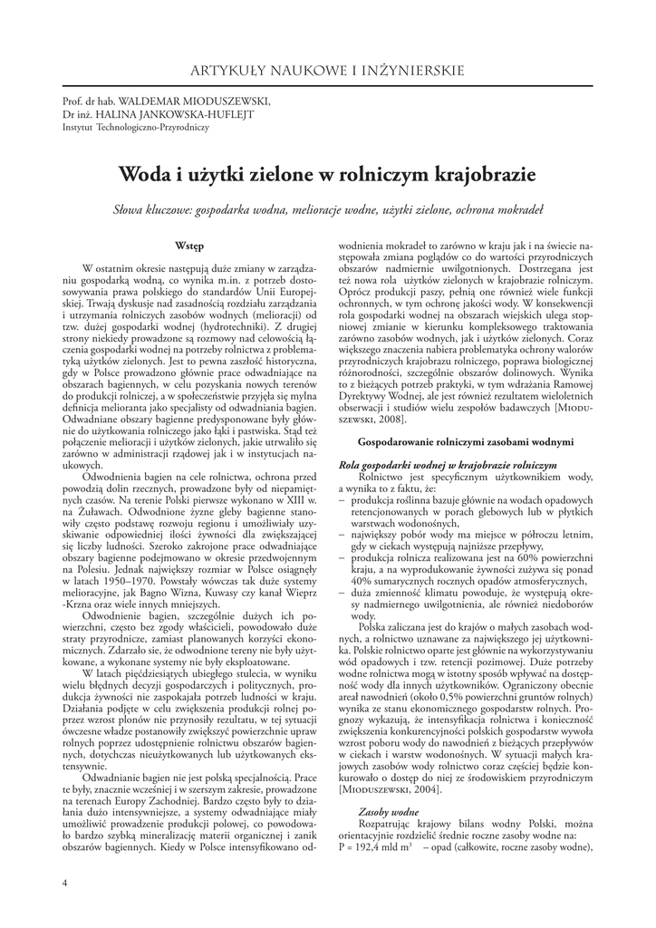 Artykuły naukowe i inżynierskie Prof. dr hab. WALDEMAR MIODUSZEWSKI, Dr inż. HALINA JANKOWSKA-HUFLEJT Instytut Technologiczno-Przyrodniczy Woda i użytki zielone w rolniczym krajobrazie Słowa kluczowe: gospodarka wodna, melioracje wodne, użytki zielone, ochrona mokradeł Wstęp W ostatnim okresie następują duże zmiany w zarządzaniu gospodarką wodną, co wynika m.in. z potrzeb dostosowywania prawa polskiego do standardów Unii Europejskiej. Trwają dyskusje nad zasadnością rozdziału zarządzania i utrzymania rolniczych zasobów wodnych (melioracji) od tzw. dużej gospodarki wodnej (hydrotechniki). Z drugiej strony niekiedy prowadzone są rozmowy nad celowością łączenia gospodarki wodnej na potrzeby rolnictwa z problematyką użytków zielonych. Jest to pewna zaszłość historyczna, gdy w Polsce prowadzono głównie prace odwadniające na obszarach bagiennych, w celu pozyskania nowych terenów do produkcji rolniczej, a w społeczeństwie przyjęła się mylna definicja melioranta jako specjalisty od odwadniania bagien. Odwadniane obszary bagienne predysponowane były głównie do użytkowania rolniczego jako łąki i pastwiska. Stąd też połączenie melioracji i użytków zielonych, jakie utrwaliło się zarówno w administracji rządowej jak i w instytucjach naukowych. Odwodnienia bagien na cele rolnictwa, ochrona przed powodzią dolin rzecznych, prowadzone były od niepamiętnych czasów. Na terenie Polski pierwsze wykonano w XIII w. na Żuławach. Odwodnione żyzne gleby bagienne stanowiły często podstawę rozwoju regionu i umożliwiały uzyskiwanie odpowiedniej ilości żywności dla zwiększającej się liczby ludności. Szeroko zakrojone prace odwadniające obszary bagienne podejmowano w okresie przedwojennym na Polesiu. Jednak największy rozmiar w Polsce osiągnęły w latach 1950–1970. Powstały wówczas tak duże systemy melioracyjne, jak Bagno Wizna, Kuwasy czy kanał Wieprz -Krzna oraz wiele innych mniejszych. Odwodnienie bagien, szczególnie dużych ich powierzchni, często bez zgody właścicieli, powodowało duże straty przyrodnicze, zamiast planowanych korzyści ekonomicznych. Zdarzało sie, że odwodnione tereny nie były użytkowane, a wykonane systemy nie były eksploatowane. W latach pięćdziesiątych ubiegłego stulecia, w wyniku wielu błędnych decyzji gospodarczych i politycznych, produkcja żywności nie zaspokajała potrzeb ludności w kraju. Działania podjęte w celu zwiększenia produkcji rolnej poprzez wzrost plonów nie przynosiły rezultatu, w tej sytuacji ówczesne władze postanowiły zwiększyć powierzchnie upraw rolnych poprzez udostępnienie rolnictwu obszarów bagiennych, dotychczas nieużytkowanych lub użytkowanych ekstensywnie. Odwadnianie bagien nie jest polską specjalnością. Prace te były, znacznie wcześniej i w szerszym zakresie, prowadzone na terenach Europy Zachodniej. Bardzo często były to działania dużo intensywniejsze, a systemy odwadniające miały umożliwić prowadzenie produkcji polowej, co powodowało bardzo szybką mineralizację materii organicznej i zanik obszarów bagiennych. Kiedy w Polsce intensyfikowano od4 wodnienia mokradeł to zarówno w kraju jak i na świecie następowała zmiana poglądów co do wartości przyrodniczych obszarów nadmiernie uwilgotnionych. Dostrzegana jest też nowa rola użytków zielonych w krajobrazie rolniczym. Oprócz produkcji paszy, pełnią one również wiele funkcji ochronnych, w tym ochronę jakości wody. W konsekwencji rola gospodarki wodnej na obszarach wiejskich ulega stopniowej zmianie w kierunku kompleksowego traktowania zarówno zasobów wodnych, jak i użytków zielonych. Coraz większego znaczenia nabiera problematyka ochrony walorów przyrodniczych krajobrazu rolniczego, poprawa biologicznej różnorodności, szczególnie obszarów dolinowych. Wynika to z bieżących potrzeb praktyki, w tym wdrażania Ramowej Dyrektywy Wodnej, ale jest również rezultatem wieloletnich obserwacji i studiów wielu zespołów badawczych [Mioduszewski, 2008]. Gospodarowanie rolniczymi zasobami wodnymi Rola gospodarki wodnej w krajobrazie rolniczym Rolnictwo jest specyficznym użytkownikiem wody, a wynika to z faktu, że: − produkcja roślinna bazuje głównie na wodach opadowych retencjonowanych w porach glebowych lub w płytkich warstwach wodonośnych, − największy pobór wody ma miejsce w półroczu letnim, gdy w ciekach występują najniższe przepływy, − produkcja rolnicza realizowana jest na 60% powierzchni kraju, a na wyprodukowanie żywności zużywa się ponad 40% sumarycznych rocznych opadów atmosferycznych, − duża zmienność klimatu powoduje, że występują okresy nadmiernego uwilgotnienia, ale również niedoborów wody. Polska zaliczana jest do krajów o małych zasobach wodnych, a rolnictwo uznawane za największego jej użytkownika. Polskie rolnictwo oparte jest głównie na wykorzystywaniu wód opadowych i tzw. retencji pozimowej. Duże potrzeby wodne rolnictwa mogą w istotny sposób wpływać na dostępność wody dla innych użytkowników. Ograniczony obecnie areał nawodnień (około 0,5% powierzchni gruntów rolnych) wynika ze stanu ekonomicznego gospodarstw rolnych. Prognozy wykazują, że intensyfikacja rolnictwa i konieczność zwiększenia konkurencyjności polskich gospodarstw wywoła wzrost poboru wody do nawodnień z bieżących przepływów w ciekach i warstw wodonośnych. W sytuacji małych krajowych zasobów wody rolnictwo coraz częściej będzie konkurowało o dostęp do niej ze środowiskiem przyrodniczym [Mioduszewski, 2004]. Zasoby wodne Rozpatrując krajowy bilans wodny Polski, można orientacyjnie rozdzielić średnie roczne zasoby wodne na: P = 192,4 mld m3 – opad (całkowite, roczne zasoby wodne), Artykuły naukowe i inżynierskie O = 58,6 mld m3 – odpływ rzeczny, H = 133,8 mld m3 – ewapotranspiracja. Pobór wód powierzchniowych i podziemnych wynosi obecnie około 12 mld m3 rocznie, ale jedynie 1,7 mld m3 to tz