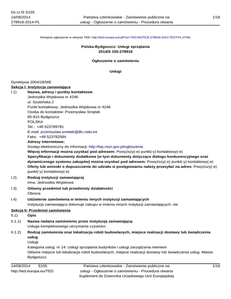 Dz.U./S S155 14/08/2014 278918-2014-PL Państwa członkowskie - Zamówienie publiczne na usługi - Ogłoszenie o zamówieniu - Procedura otwarta 1/18 Niniejsze ogłoszenie w witrynie TED: http://ted.europa.eu/udl?uri=TED:NOTICE:278918-2014:TEXT:PL:HTML Polska-Bydgoszcz: Usługi sprzątania 2014/S 155-278918 Ogłoszenie o zamówieniu Usługi Dyrektywa 2004/18/WE Sekcja I: Instytucja zamawiająca I.1) Nazwa, adresy i punkty kontaktowe Jednostka Wojskowa nr 4246 ul. Szubińska 2 Punkt kontaktowy: Jednostka Wojskowa nr 4246 Osoba do kontaktów: Przemysław Smętek 85-915 Bydgoszcz POLSKA Tel.: +48 523789781 E-mail: [email protected] Faks: +48 523782584 Adresy internetowe: Dostęp elektroniczny do informacji: http://bip.mon.gov.pl/ogloszenia Więcej informacji można uzyskać pod adresem: Powyższy(-e) punkt(-y) kontaktowy(-e) Specyfikacje i dokumenty dodatkowe (w tym dokumenty dotyczące dialogu konkurencyjnego oraz dynamicznego systemu zakupów) można uzyskać pod adresem: Powyższy(-e) punkt(-y) kontaktowy(-e) Oferty lub wnioski o dopuszczenie do udziału w postępowaniu należy przesyłać na adres: Powyższy(-e) punkt(-y) kontaktowy(-e) I.2) Rodzaj instytucji zamawiającej Inna: Jednostka Wojskowa I.3) Główny przedmiot lub przedmioty działalności Obrona I.4) Udzielenie zamówienia w imieniu innych instytucji zamawiających Instytucja zamawiająca dokonuje zakupu w imieniu innych instytucji zamawiających: nie Sekcja II: Przedmiot zamówienia II.1) Opis II.1.1) Nazwa nadana zamówieniu przez instytucję zamawiającą: Usługa kompleksowego utrzymania czystości. II.1.2) Rodzaj zamówienia oraz lokalizacja robót budowlanych, miejsce realizacji dostawy lub świadczenia usług Usługi Kategoria usług: nr 14: Usługi sprzątania budynków i usługi zarządzania mieniem Główne miejsce lub lokalizacja robót budowlanych, miejsce realizacji dostawy lub świadczenia usług: Miasto Bydgoszcz. 14/08/2014 S155 http://ted.europa.eu/TED Państwa członkowskie - Zamówienie publiczne na usługi - Ogłoszenie o zamówieniu - Procedura otwarta Suplement do Dziennika Urzędowego Unii Europejskiej 1/18 Dz.U./S S155 14/08/2014 278918-2014-PL Państwa członkowskie - Zamówienie publiczne na usługi - Ogłoszenie o zamówieniu - Procedura otwarta 2/18 Kod NUTS PL613 II.1.3) Informacje na temat zamówienia publicznego, umowy ramowej lub dynamicznego systemu zakupów (DSZ) Ogłoszenie dotyczy zamówienia publicznego II.1.4) Informacje na temat umowy ramowej II.1.5) Krótki opis zamówienia lub zakupu Przedmiotem zamówienia jest usługa kompleksowego utrzymania czystości na terenie kompleksów przy ulicy Szubińskiej 2, ul. Szubińskiej 105 w Bydgoszczy, polegająca w szczególności na sprzątaniu budynków, sprzątaniu oraz odśnieżaniu chodników, placów, dróg i ulic, sprzątaniu i utrzymaniu terenów zielonych, w zakresie i na zasadach szczegółowo określonych w SIWZ oraz zgodnie z obowiązującymi przepisami. II.1.6) Wspólny Słownik Zamówień (CPV) 90910000, 90911200, 90911300, 90914000, 90610000, 90620000, 90630000, 77300000, 77310000, 75251120, 77320000, 50800000 II.1.7) Informacje na temat Porozumienia w sprawie zamówień rządowych (GPA) Zamówienie jest objęte Porozumieniem w sprawie zamówień rządowych (GPA): nie II.1.8) Części To zamówienie podzielone jest na części: tak Oferty można składać w odniesieniu do jednej lub więcej części II.1.9) Informacje o ofertach wariantowych Dopuszcza się składanie ofert wariantowych: nie II.2) Wielkość lub zakres zamówienia II.2.1) Całkowita wielkość lub zakres: Przedmiot zamówienia podzielony jest na 4 zadania: Zadanie nr 1 usługa kompleksowego utrzymania czystości na terenie kompleksu przy ulicy Szubińskiej 2 w Bydgoszczy - budynki nr 1, 2, 3, 4, 5 i 6, Zadanie nr 2 usługa kompleksowego utrzymania czystości na terenie kompleksu przy ulicy Szubińskiej 2 w Bydgoszczy - tereny zewnętrzne, Zadanie nr 3 usługa kompleksowego utrzymania czystości na terenie kompleksu przy ulicy Szubińskiej 105 w Bydgoszczy - budynki nr 2, 4, 19 i 140, Zadanie nr 4 usługa kompleksowego utrzymania czystości na terenie kompleksu przy ulicy Szubińskiej 105 w Bydgoszczy - budynki i tereny zewnętrzne. Opis przedmiotu zamówienia – określenie zakresów: a. Zadanie nr 1 a) Zakres A1 – sprzątanie w budynkach nr 2 (z wyłączeniami), 4, 5 i 6 – w dniach roboczych (powierzchnia 8 827 m2), b) Zakres A2 – sprzątanie w budynkach nr 1, 2 (z wyłączeniami) i 3 – w dniach roboczych (powierzchnia 4 187 m2), c) Zakres B1 – sprzątanie w budynkach nr 2, 5, 6 – w dniach roboczych (powierzchnia szacunkowa 3 700 m2), d) Zakres B2 – sprzątanie w budynkach nr 2, 5, 6 – w soboty, niedziele i święta (powierzchnia szacunkowa 4 700 m2), e) Zakres B3 – sprzątanie innych obiektów (np. namiotu) – w dniach roboczych (powierzchnia szacunkowa 700 m2), f) Zakres B4 – sprzątanie innych obiektów (np. namiotu) – w soboty, niedziele 14/08/2014 S155 http://ted.europa.eu/TED Państwa członkowskie - Zamówienie publiczne na usługi - Ogłoszenie o zamówieniu - Procedura otwarta Suplement do Dziennika Urzędowego Unii Europejskiej 2/18 Dz.U./S S155 14/08/2014 278918-2014-PL Państwa członkowskie - Zamówienie publiczne na usługi - Ogłoszenie o zamówieniu - Procedura otwarta 3/18 i święta (powierzchnia szacunkowa 700 m2), g) Zakres B5 – prace dodatkowe (szacunkowa ilość roboczogodzin - 100). Zadanie nr 2 a) Zakres C1 – sprzątanie i utrzymanie terenów zewnętrznych przyległych do budynków nr 2, 4, 5 i 6 – usługa świadczona w okresie od 1 kwietnia do 31 października (powierzchnia 30 380 m2), b) Zakres C2 – sprzątanie i utrzymanie terenów zewnętrznych przyległych do budynków nr 1, 3 i 10 – usługa świadczona w okresie od 1 kwietnia do 31 października (powierzchnia 5 843 m2), c) Zakres C3 – sprzątanie i utrzymanie terenów zewnętrznych przyległych do budynków nr 2, 4, 5 i 6 – usługa świadczona w okr