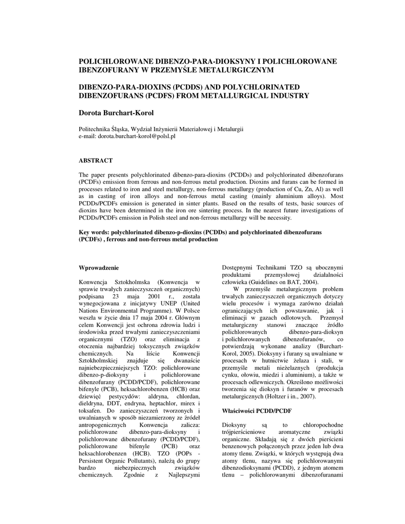 POLICHLOROWANE DIBENZO-PARA-DIOKSYNY I POLICHLOROWANE IBENZOFURANY W PRZEMYŚLE METALURGICZNYM DIBENZO-PARA-DIOXINS (PCDDS) AND POLYCHLORINATED DIBENZOFURANS (PCDFS) FROM METALLURGICAL INDUSTRY Dorota Burchart-Korol Politechnika Śląska, Wydział Inżynierii Materiałowej i Metalurgii e-mail: [email protected] ABSTRACT The paper presents polychlorinated dibenzo-para-dioxins (PCDDs) and polychlorinated dibenzofurans (PCDFs) emission from ferrous and non-ferrous metal production. Dioxins and furans can be formed in processes related to iron and steel metallurgy, non-ferrous metallurgy (production of Cu, Zn, Al) as well as in casting of iron alloys and non-ferrous metal casting (mainly aluminium alloys). Most PCDDs/PCDFs emission is generated in sinter plants. Based on the results of tests, basic sources of dioxins have been determined in the iron ore sintering process. In the nearest future investigations of PCDDs/PCDFs emission in Polish steel and non-ferrous metallurgy will be necessity. Key words: polychlorinated dibenzo-p-dioxins (PCDDs) and polychlorinated dibenzofurans (PCDFs) , ferrous and non-ferrous metal production Wprowadzenie Konwencja Sztokholmska (Konwencja w sprawie trwałych zanieczyszczeń organicznych) podpisana 23 maja 2001 r., została wynegocjowana z inicjatywy UNEP (United Nations Environmental Programme). W Polsce weszła w życie dnia 17 maja 2004 r. Głównym celem Konwencji jest ochrona zdrowia ludzi i środowiska przed trwałymi zanieczyszczeniami organicznymi (TZO) oraz eliminacja z otoczenia najbardziej toksycznych związków chemicznych. Na liście Konwencji Sztokholmskiej znajduje się dwanaście najniebezpieczniejszych TZO: polichlorowane dibenzo-p-dioksyny i polichlorowane dibenzofurany (PCDD/PCDF), polichlorowane bifenyle (PCB), heksachlorobenzen (HCB) oraz dziewięć pestycydów: aldryna, chlordan, dieldryna, DDT, endryna, heptachlor, mirex i toksafen. Do zanieczyszczeń tworzonych i uwalnianych w sposób niezamierzony ze źródeł antropogenicznych Konwencja zalicza: polichlorowane dibenzo-para-dioksyny i polichlorowane dibenzofurany (PCDD/PCDF), polichlorowane bifenyle (PCB) oraz heksachlorobenzen (HCB). TZO (POPs Persistent Organic Pollutants), należą do grupy bardzo niebezpiecznych związków chemicznych. Zgodnie z Najlepszymi Dostępnymi Technikami TZO są ubocznymi produktami przemysłowej działalności człowieka (Guidelines on BAT, 2004). W przemyśle metalurgicznym problem trwałych zanieczyszczeń organicznych dotyczy wielu procesów i wymaga zarówno działań ograniczających ich powstawanie, jak i eliminacji w gazach odlotowych. Przemysł metalurgiczny stanowi znaczące źródło polichlorowanych dibenzo-para-dioksyn i polichlorowanych dibenzofuranów, co potwierdzają wykonane analizy (BurchartKorol, 2005). Dioksyny i furany są uwalniane w procesach w hutnictwie żelaza i stali, w przemyśle metali nieżelaznych (produkcja cynku, ołowiu, miedzi i aluminium), a także w procesach odlewniczych. Określono możliwości tworzenia się dioksyn i furanów w procesach metalurgicznych (Holtzer i in., 2007). Właściwości PCDD/PCDF Dioksyny są to chloropochodne trójpierścieniowe aromatyczne związki organiczne. Składają się z dwóch pierścieni benzenowych połączonych przez jeden lub dwa atomy tlenu. Związki, w których występują dwa atomy tlenu, nazywa się polichlorowanymi dibenzodioksynami (PCDD), z jednym atomem tlenu – polichlorowanymi dibenzofuranami 50 (PCDF). Toksyczność dioksyn ściśle zależy od ich budowy. Największą toksycznością charakteryzuje się 2,3,7,8 tetrachlorodibenzodioksyna (2,3,7,8 TCDD). Polichlorowane dibenzodioksyny (PCDD) oraz polichlorowane dibenzofurany (PCDF), co zostało już udowodnione w wielu badaniach toksykologicznych i farmakologicznych, należą do silnie toksycznych związków chemicznych, które zostały sztucznie wytworzone przez człowieka. Zarówno PCDD, jak i PCDF są substancjami, które nigdy nie były i nie są wytwarzane celowo, ponieważ nie znajdują żadnego zastosowania technicznego (Makles i in., 2001). Polichlorowane dibenzo-para-dioksyny, polichlorowane dibenzofurany, tworzą się w sposób niezamierzony z procesów termicznych z udziałem substancji organicznych i chloru w wyniku niepełnego spalania lub reakcji chemicznych (Żurek, 2002). Do źródeł przemysłowych mogących powodować wysoki poziom powstawania i uwalniania tych substancji chemicznych do środowiska zalicza się: • spalarnie odpadów, w tym spalarnie współspalające odpady komunalne, niebezpieczne lub medyczne, albo osady ściekowe; • piece cementowe spalające odpady niebezpieczne; • • produkcja masy papierniczej z zastosowaniem chloru pierwiastkowego lub substancji chemicznych wytwarzających chlor pierwiastkowy jako wybielacza; następujące procesy termiczne w hutnictwie: o wtórna produkcja miedzi; o spiekalnie w hutnictwie żelaza i stali; o wtórna produkcja aluminium; o wtórna produkcja cynku. PCDD/PCDF w przemyśle metalurgicznym Przemysł metalurgiczny jest obecnie jednym z głównych źródeł PCDD/PCDF w wielu krajach europejskich. Według wytycznych pt. „Standardowy zestaw narzędzi do identyfikacji i szacowania emisji PCDD/F” opracowanymi przez UNEP Chemicals Toolkit (UNEP, 2005) wyróżnia się główne źródła dioksyn i furanów w przemyśle metalurgicznym – hutnictwie żelaza i stali oraz produkcji metali nieżelaznych (tabela 1). W tabela 2 zestawiono wyniki badań emisji dioksyn i furanów przeprowadzonych w Polsce w podziale na dwie, główne grupy źródeł emisji, tj.: produkcja żelaza i stali oraz produkcja metali nieżelaznych (Grochowalski i in., 2007). Najwyższe stężenie dioksyn wystąpiło w przypadku spiekania rudy żelaza. Względne, wysokie stężenie dioksyn wykazano również w przypadku przetapiania złomu aluminium Tabela 1. Główne źródła dioksyn i furanów w przemyśle metalurgicznym. Powietrze Woda Ziemia Wyrób Odpady Spiekanie rud żel