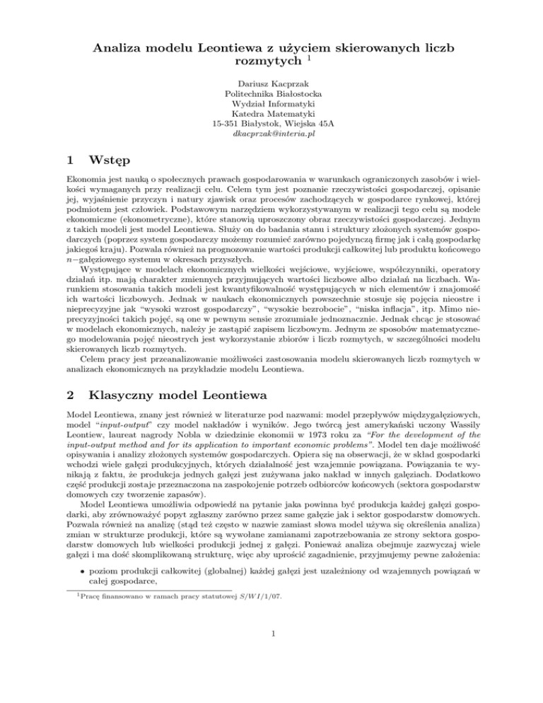 Analiza modelu Leontiewa z użyciem skierowanych liczb rozmytych 1 Dariusz Kacprzak Politechnika Białostocka Wydział Informatyki Katedra Matematyki 15-351 Białystok, Wiejska 45A [email protected] 1 Wstęp Ekonomia jest nauką o społecznych prawach gospodarowania w warunkach ograniczonych zasobów i wielkości wymaganych przy realizacji celu. Celem tym jest poznanie rzeczywistości gospodarczej, opisanie jej, wyjaśnienie przyczyn i natury zjawisk oraz procesów zachodzących w gospodarce rynkowej, której podmiotem jest człowiek. Podstawowym narzędziem wykorzystywanym w realizacji tego celu są modele ekonomiczne (ekonometryczne), które stanowią uproszczony obraz rzeczywistości gospodarczej. Jednym z takich modeli jest model Leontiewa. Służy on do badania stanu i struktury złożonych systemów gospodarczych (poprzez system gospodarczy możemy rozumieć zarówno pojedynczą firmę jak i całą gospodarkę jakiegoś kraju). Pozwala również na prognozowanie wartości produkcji całkowitej lub produktu końcowego n−gałęziowego systemu w okresach przyszłych. Występujące w modelach ekonomicznych wielkości wejściowe, wyjściowe, współczynniki, operatory działań itp. mają charakter zmiennych przyjmujących wartości liczbowe albo działań na liczbach. Warunkiem stosowania takich modeli jest kwantyfikowalność występujących w nich elementów i znajomość ich wartości liczbowych. Jednak w naukach ekonomicznych powszechnie stosuje się pojęcia nieostre i nieprecyzyjne jak “wysoki wzrost gospodarczy”, “wysokie bezrobocie”, “niska inflacja”, itp. Mimo nieprecyzyjności takich pojęć, są one w pewnym sensie zrozumiałe jednoznacznie. Jednak chcąc je stosować w modelach ekonomicznych, należy je zastąpić zapisem liczbowym. Jednym ze sposobów matematycznego modelowania pojęć nieostrych jest wykorzystanie zbiorów i liczb rozmytych, w szczególności modelu skierowanych liczb rozmytych. Celem pracy jest przeanalizowanie możliwości zastosowania modelu skierowanych liczb rozmytych w analizach ekonomicznych na przykładzie modelu Leontiewa. 2 Klasyczny model Leontiewa Model Leontiewa, znany jest również w literaturze pod nazwami: model przepływów międzygałęziowych, model “input-output” czy model nakładów i wyników. Jego twórcą jest amerykański uczony Wassily Leontiew, laureat nagrody Nobla w dziedzinie ekonomii w 1973 roku za “For the development of the input-output method and for its application to important economic problems”. Model ten daje możliwość opisywania i analizy złożonych systemów gospodarczych. Opiera się na obserwacji, że w skład gospodarki wchodzi wiele gałęzi produkcyjnych, których działalność jest wzajemnie powiązana. Powiązania te wynikają z faktu, że produkcja jednych gałęzi jest zużywana jako nakład w innych galęziach. Dodatkowo część produkcji zostaje przeznaczona na zaspokojenie potrzeb odbiorców końcowych (sektora gospodarstw domowych czy tworzenie zapasów). Model Leontiewa umożliwia odpowiedź na pytanie jaka powinna być produkcja każdej gałęzi gospodarki, aby zrównoważyć popyt zgłaszny zarówno przez same gałęzie jak i sektor gospodarstw domowych. Pozwala również na analizę (stąd też często w nazwie zamiast słowa model używa się określenia analiza) zmian w strukturze produkcji, które są wywołane zamianami zapotrzebowania ze strony sektora gospodarstw domowych lub wielkości produkcji jednej z gałęzi. Ponieważ analiza obejmuje zazwyczaj wiele gałęzi i ma dość skomplikowaną strukturę, więc aby uprościć zagadnienie, przyjmujemy pewne założenia: • poziom produkcji całkowitej (globalnej) każdej gałęzi jest uzależniony od wzajemnych powiązań w całej gospodarce, 1 Pracę finansowano w ramach pracy statutowej S/W I/1/07. 1 • każda gałąź wytwarza jeden produkt lub grupę produktów w stałych proporcjach i w tym celu zużywa jeden lub grupę produktów również w stałych proporcjach (gdyby któraś z gałęzi wytwarzała dwa różne produkty lub stosowała dwie różne kombinacje czynników produkcji, to można tę gałąź podzielić na dwie osobne gałęzie), • sektor gospodarstw domowych nie jest uwzględniony jako jedna z gałęzi gospodarki. Załóżmy, że gospodarka składa się z n gałęzi produkcyjnych (w dalszej części będziemy używać określenia gałęzie, ale mogą to być również sektory czy działy pojedynczej firmy). Wprowadźmy następujące oznaczenia (wyrażone w jednostkach pieniężnych): − Xi (i = 1, 2, ..., n) wielkość produkcji całkowitej (globalnej) i−tej gałęzi, − xij (i, j = 1, 2, ..., n) część produkcji i−tej gałęzi, która jest zużywana (przepływa) na potrzeby produkcji gałęzi j−tej, − di (i = 1, 2, ..., n) produkt końcowy i−tej gałęzi (różnica między produkcją całkowitą i−tej gałęzi a jej przepływami do wszystkich gałęzi). Punktem wyjścia modelu Leontiewa jest bilans gospodarczy w postaci tablicy przepływów międzygałęziowych (zob. tabela 1) przygotowany w sposób umożliwiający kwantyfikację wzajemnych powiązań między wyodrębnionymi częściami systemu. Tablica ta zawiera dane liczbowe charakteryzujące działalność gospodarczą w pewnym okresie czasu. numer gałęzi 1 i 2 .. . n 1 x11 x21 .. . xn1 przepływy xij j 2 ... n x12 ... x1n x22 ... x2n .. .. .. . . . xn2 ... xnn produkt końcowy di d1 d2 .. . dn produkcja całkowita Xi X1 X2 .. . Xn Tabela 1: Tablica przepływów międzygałęziowych. Ponieważ produkcja całkowita gałęzi i−tej, jest sumą przepływów międzygałęziowych oraz produktu końcowego, otrzymujemy układ równań bilansowych postaci X1 = x11 + x12 + ... + x1n + d1 X2 = x21 + x22 + ... + x2n + d2 . (1) ................................................. Xn = xn1 + xn2 + ... + xnn + dn Na mocy założenia o stałych proporcjach zużywanej produkcji gałęzi i−tej przez gałąź j−tą możemy określić wsp