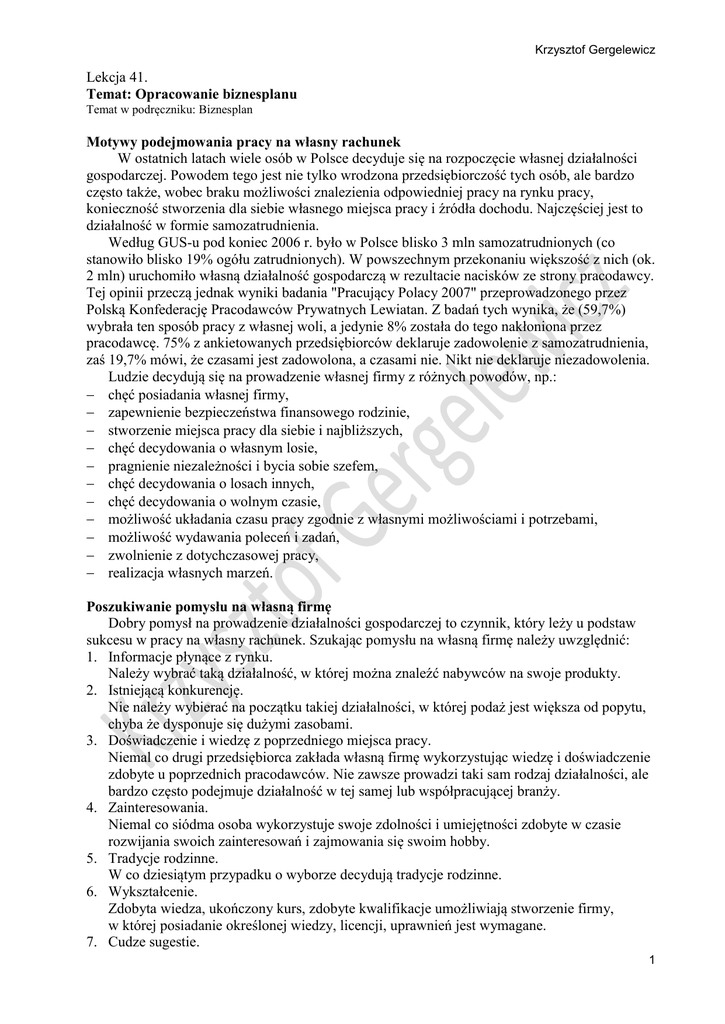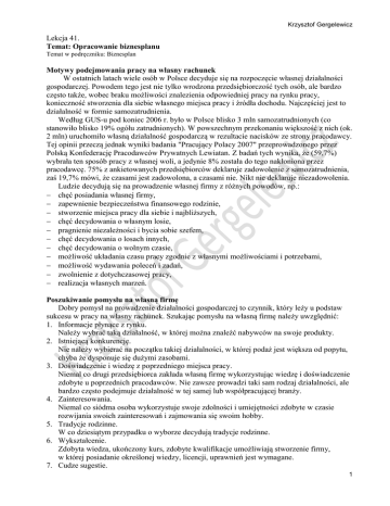 Krzysztof Gergelewicz Lekcja 41. Temat: Opracowanie biznesplanu Temat w podręczniku: Biznesplan Motywy podejmowania pracy na własny rachunek W ostatnich latach wiele osób w Polsce decyduje się na rozpoczęcie własnej działalności gospodarczej. Powodem tego jest nie tylko wrodzona przedsiębiorczość tych osób, ale bardzo często także, wobec braku możliwości znalezienia odpowiedniej pracy na rynku pracy, konieczność stworzenia dla siebie własnego miejsca pracy i źródła dochodu. Najczęściej jest to działalność w formie samozatrudnienia. Według GUS-u pod koniec 2006 r. było w Polsce blisko 3 mln samozatrudnionych (co stanowiło blisko 19% ogółu zatrudnionych). W powszechnym przekonaniu większość z nich (ok. 2 mln) uruchomiło własną działalność gospodarczą w rezultacie nacisków ze strony pracodawcy. Tej opinii przeczą jednak wyniki badania "Pracujący Polacy 2007" przeprowadzonego przez Polską Konfederację Pracodawców Prywatnych Lewiatan. Z badań tych wynika, że (59,7%) wybrała ten sposób pracy z własnej woli, a jedynie 8% została do tego nakłoniona przez pracodawcę. 75% z ankietowanych przedsiębiorców deklaruje zadowolenie z samozatrudnienia, zaś 19,7% mówi, że czasami jest zadowolona, a czasami nie. Nikt nie deklaruje niezadowolenia. Ludzie decydują się na prowadzenie własnej firmy z różnych powodów, np.: chęć posiadania własnej firmy, zapewnienie bezpieczeństwa finansowego rodzinie, stworzenie miejsca pracy dla siebie i najbliższych, chęć decydowania o własnym losie, pragnienie niezależności i bycia sobie szefem, chęć decydowania o losach innych, chęć decydowania o wolnym czasie, możliwość układania czasu pracy zgodnie z własnymi możliwościami i potrzebami, możliwość wydawania poleceń i zadań, zwolnienie z dotychczasowej pracy, realizacja własnych marzeń. Poszukiwanie pomysłu na własną firmę Dobry pomysł na prowadzenie działalności gospodarczej to czynnik, który leży u podstaw sukcesu w pracy na własny rachunek. Szukając pomysłu na własną firmę należy uwzględnić: 1. Informacje płynące z rynku. Należy wybrać taką działalność, w której można znaleźć nabywców na swoje produkty. 2. Istniejącą konkurencję. Nie należy wybierać na początku takiej działalności, w której podaż jest większa od popytu, chyba że dysponuje się dużymi zasobami. 3. Doświadczenie i wiedzę z poprzedniego miejsca pracy. Niemal co drugi przedsiębiorca zakłada własną firmę wykorzystując wiedzę i doświadczenie zdobyte u poprzednich pracodawców. Nie zawsze prowadzi taki sam rodzaj działalności, ale bardzo często podejmuje działalność w tej samej lub współpracującej branży. 4. Zainteresowania. Niemal co siódma osoba wykorzystuje swoje zdolności i umiejętności zdobyte w czasie rozwijania swoich zainteresowań i zajmowania się swoim hobby. 5. Tradycje rodzinne. W co dziesiątym przypadku o wyborze decydują tradycje rodzinne. 6. Wykształcenie. Zdobyta wiedza, ukończony kurs, zdobyte kwalifikacje umożliwiają stworzenie firmy, w której posiadanie określonej wiedzy, licencji, uprawnień jest wymagane. 7. Cudze sugestie. 1 Krzysztof Gergelewicz Często pomysły są podsuwane przez rodzinę lub znajomych, którzy potrafią opisać istniejące gdzieś i działające przedsiębiorstwo podając je za sprawdzony wzór. 8. Obserwacje i twórcze kopiowanie. Niektóre pomysły powstają nieoczekiwanie podczas obserwacji w nowym otoczeniu. Obserwowanie odmienności charakterystycznej dla obcego kraju, regionu, wsi lub miasta może pomóc w znalezieniu pomysłu na własną firmę. Można podpatrzeć jak obce firmy organizują swoją działalność, jak się promują, jakie ceny stosują. Dlatego wiele pomysłów przedsiębiorcy przywożą ze sobą z innych regionów kraju. Twórcze kopiowanie jest to przenoszenie i dopasowanie pomysłów na własny grunt. 9. Własne pomysły. Niektórzy potrafią samodzielnie opracować sposób wytwarzania produktu lub wykonywania usługi. Pomocne mogą być w tym metody twórczego myślenia. Wśród nich najpopularniejszą jest tzw. burza mózgów. Nawet najoryginalniejsze pomysły mają szansę na dobre przyjęcie przez klientów, pod warunkiem jednak, że są dobrze przygotowane. Podstawowe decyzje Należy pamiętać, że działalność produkcyjna wymaga przeważnie znacznych nakładów finansowych i jest obarczona dużym ryzykiem. Najlepiej rozpocząć od działalności usługowej albo handlowej, gdyż są one mniej ryzykowne i mniej kosztowne. Rzetelna charakterystyka potencjalnych nabywców oraz konkurencji umożliwi przygotowanie efektywnego planu marketingowego (4P), czyli dostosowanie do potrzeb klientów: produktu, ceny, dystrybucji i promocji. Planowanie działalności gospodarczej polega na udzieleniu odpowiedzi na pytania: 1. Co, komu, w jaki sposób, ile i za jaką cenę będziesz sprzedawać? 2. Ile i jakich środków będziesz potrzebować do uruchomienia działalności? 3. Jakie będą koszty prowadzenia działalności (zakup materiałów, towarów, opłata czynszu, rachunków itp.)? Lokalizacja firmy Lokalizacja oznacza umiejscowienie siedziby firmy, jej magazynów, sklepów, agencji czy przedstawicielstw. Lokalizacja firmy jest niezwykle ważnym czynnikiem z punktu widzenia szans na odniesienie sukcesu. Trafna lokalizacja zapewnia dużo klientów, a chybiona sprawia, że firma nie ma po co (dla kogo) działać. Lokalizacja firmy zależy od rodzaju działalności. W przypadku wyboru działalności usługowej i handlowej lokalizacja powinna uwzględniać przede wszystkim natężenie ruchu pieszego lub zmotoryzowanego. Idealnymi miejscami są centra handlowe i usługowe lub centra miast. Przy wyborze lokalizacji na działalność produkcyjna, ze względu na konieczność wynajęcia (zbudowania) hal produkcyjnych, magazynów, placów dla samochodów należy zwrócić uwagę na: wysokość czynszu za wynajem, możliwość rozbudowy