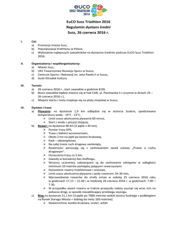 EuCO Susz Triathlon 2016 Regulamin dystans średni Susz, 26 czerwca 2016 r. I. Cel: a) Promocja miasta Susz, b) Popularyzacja triathlonu w Polsce, c) Wyłonienie najlepszych zawodników na dystansie średnim podczas EuCO Susz Triathlon 2016. II. Organizatorzy i współorganizatorzy: a) Miasto Susz, b) UKS Towarzystwo Rozwoju Sporu w Suszu, c) Centrum Sportu i Rekreacji im. Jana Pawła II w Suszu, d) Suski Ośrodek Kultury. III. Termin: a) 26 czerwca 2016 r., start zawodów o godzinie 8:00, b) Biuro zawodów będzie mieścić się w hali CSiR, ul. Piastowska 5 c (czynne w dniach 24 – 26 czerwca 2016 r.), c) Miejsce startu i mety znajduje się na plaży miejskiej w Suszu. IV. Dystans i trasa a) Pływanie: na dystansie 1,9 km odbędzie się w Jeziorze Suskim, spodziewana temperatura wody - 19°C - 22°C, Limit czasu ukończenia pływania 60 minut, Start z wody z pozycji stojącej, b) Rower: na dystansie 90 km (2 pętle x 45 km), Pomiar trasy GPS, Trasa z lekkimi wzniesieniami, Około 2 km na pętli po kostce brukowej, Kask – obowiązkowy Na całej trasie ruch drogowy zamknięty, Rowerzyści poruszają się z zachowaniem zasad ustawy „Prawo o ruchu drogowym”. Oznaczenia trasy co 5 km, Zawody w konwencji bez draftingu, Wszyscy uczestnicy zobowiązani są do zachowania odstępów w odległości minimum 10 metrów pomiędzy jadącymi rowerzystami. Dozwolone rowery triathlonowe i szosowe, Limit czasu ukończenia pływania i jazdy rowerem: 5h 30 min, Wprowadzenie rowerów do strefy zmian w sobotę 25 czerwca 2016 roku w godzinach 17.15 – 21.00 i w niedzielę 26 czerwca 2016 r. w godzinach: 7.00 – 7.30. W przypadku awarii roweru w trakcie przejazdu należy usunąć się wraz nim na pobocze drogi, w sposób niezakłócający przebiegu wyścigu. c) Bieg na dystansie 21,1 km (3 pętle po 7000 metrów wokół Jeziora Suskiego z podbiegiem na Rynek Starego Miasta + dobieg do mety 100 metrów). Nawierzchnia: kostka brukowa, szuter, asfalt d) e) f) g) V. Pętla o trzech łagodnych, kilkudziesięciu metrowych podbiegach na ulicy Wodnej. Oznaczenia trasy co 1 km. Pomiar trasy GPS, Limit ukończenia zawodów: 8 godzin. Punkty odżywiania – na trasie kolarskiej po 2 na każdej pętli, na trasie biegowej średnio co 2,3 km; w punktach będą dostępne: banany, pomarańcze, arbuzy, woda mineralna niegazowana, napoje izotoniczne. Punkty odświeżania – na trasie biegowej przy punktach odżywiania podawane będą gąbki nasączone wodą, worki z lodem. Toalety przenośne – na trasie kolarskiej przy strefie zmian, w okolicach punktów odświeżania, na trasie biegowej przy punktach odświeżania. Klasyfikacja i kategorie wiekowe a) Klasyfikacja generalna Kobiet b) Klasyfikacja generalne mężczyzn c) K 18 (18 – 24), K 25 (25 – 29), K 30 (30 – 34), K 35 (35 – 39), K 40 (40 – 44), K 45 (45 – 49), K 50 (50 – 54), K 55 (55 – 59), K 60 (+60) d) KS (najlepsza Suszanka) e) KWM (najlepsza zawodniczka województwa warmińsko – mazurskiego) f) M 18 (18 – 24), M 25 (25 – 29), M 30 (30 – 34), M 35 (35 – 39), M 40 (40 – 44), M 45 (45 – 49), M 50 (50 – 54), M 55 (55 -59), M 60 (+60) g) MS (najlepszy Suszanin) h) MWM (najlepszy zawodnik województwa warmińsko – mazurskiego) O przynależności do danej kategorii wiekowej decyduje rok urodzenia. Warunkiem przystąpienia do zawodów w kategorii suskiej i województwa warmińsko – mazurskiego jest udokumentowanie stałego miejsca zameldowania. VI. Nagrody a) Zawodnicy w klasyfikacji generalnej mężczyzn (I – X) Kobiet ( I – X) otrzymają nagrody pieniężne w kwocie: I miejsce – 5.000,00 zł II miejsce – 3.000,00 zł III miejsce – 2.000,00 zł IV miejsce – 1.500,00 zł V miejsce – 1.000,00 zł VI miejsce - 800,00 zł VII miejsce - 600,00 zł VIII miejsce - 500,00 zł IX miejsce - 300,00 zł X miejsce - 200,00 zł b) Zdobywcom nagród pieniężnych zostanie potrącony podatek dochodowy zgodnie z obowiązującymi przepisami. c) Miejsca I – III we wszystkich kategoriach otrzymają nagrody rzeczowe i okolicznościowe statuetki, d) Wszyscy zawodnicy, którzy ukończą EuCO Susz Triathlon 2016 otrzymają na mecie pamiątkowe medale, e) Organizator zastrzega sobie prawo do wprowadzenia dodatkowych nagród w wybranych przez siebie kategoriach, f) Odbiór nagród może nastąpić wyłącznie podczas kończącej zawody ceremonii wręczenia nagród. VII. Warunki uczestnictwa a) Prawo startu w zawodach posiadają osoby które w dniu 26.06.2016 r. będą miały ukończone 18 lat i okażą podczas weryfikacji dokumentów stwierdzający tożsamość, b) Wniosą opłatę startową (z wyjątkiem osób zwolnionych z opłaty) oraz podpiszą oświadczenie o braku przeciwwskazań zdrowotnych i starcie w zawodach z własnej woli. VIII. Zgłoszenia i opłata startowa 1. Zgłoszenia: a) Zgłoszenia do EuCO Susz Triathlon będą przyjmowane poprzez formularz zgłoszeniowy dostępny na stronie www.triathlon.susz.pl b) Zgłoszenia on – line będą przyjmowane od 10 grudnia 2015 roku do dnia 1 czerwca 2016r. do godz. 23:59 bądź do wyczerpania obowiązującego limitu. c) Obowiązuje limit zawodników: 600 osób. d) Organizator zastrzega sobie prawo do zmiany limitu zawodników. 2. Opłata startowa: a) Opłatę startową wnosi się przy rejestracji. b) Opłata za udział w EuCO Susz Triathlon 2016 w zależności od terminu wynosi: Do 31.01.2016 r. – 250 zł Do 31.03.2016 r. – 300 zł Do 01.06.2016 r. – 400 zł. c) Organizator wystawia faktury VAT na żądanie. d) Opłaty należy dokonać na etapie rejestracji, za pośrednictwem formularza rejestracyjnego. e) Dowodem dotarcia opłaty startowej jest pojawienia się nazwiska zawodnika na liście startowej. f) Organizator nie zwraca opłaty wniesionej opłaty startowej w przypadku rezygnacji ze startu. 3. Pakiet startowy: a) Podczas odbioru pakietu zawodnicy muszą posiadać dokument ze zdjęciem celem weryfikacji danych osobowych. b) Istnieje możliwość przepisania pakietu startowe