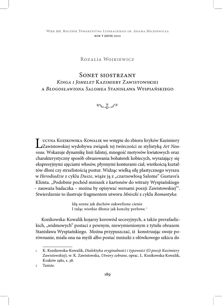 Wiek XIX . Rocznik Towarzystwa Literackiego im. Adama Mickiewicza rok V (XLVII) 2012 Rozalia Wojkiewicz Sonet siostrzany Kinga i Johelet Kazimiery Zawistowskiej a Błogosławiona Salomea Stanisława Wyspiańskiego L ucyna Kozikowska-Kowalik we wstępie do zbioru liryków Kazimiery Zawistowskiej wydobywa związek tej twórczości ze stylistyką Art Nouveau. Wskazuje dynamikę linii falistej, mnogość motywów kwiatowych oraz charakterystyczny sposób obrazowania bohaterek kobiecych, wyrażający się ekspresyjnymi ujęciami włosów, płynnymi konturami ciał, wiotkością kształtów dłoni czy strzelistością postur. Widząc wielką siłę plastycznego wyrazu w Herodiadzie z cyklu Dusze, wiąże ją z „czarnowłosą Salome” Gustave’a Klimta. „Podobnie pochód mniszek z kartonów do witraży Wyspiańskiego – zauważa badaczka – można by opisywać wersami poezji Zawistowskiej”1. Stwierdzenie to ilustruje fragmentem utworu Mniszki z cyklu Romantyka: Idą senne jak duchów zakwefione cienie I tuląc wiotkie dłonie jak konchy perłowe.2 Kozikowska-Kowalik kojarzy korowód secesyjnych, a także prerafaelickich, „widmowych” postaci z pewnym, niewymienionym z tytułu obrazem Stanisława Wyspiańskiego. Można przypuszczać, iż konstruując swoje porównanie, miała ona na myśli albo postać mniszki z ołówkowego szkicu do 1 2 K. Kozikowska-Kowalik, Dialektyka oryginalności i typowości (O poezji Kazimiery Zawistowskiej), w: K. Zawistowska, Utwory zebrane, oprac. L. Kozikowska-Kowalik, Kraków 1982, s. 38. Tamże. 189 • Rozalia Wojkiewicz • okna katedry wawelskiej3, albo niezrealizowany rysunek trzech sióstr klarysek: Salomei, Kunegundy (Kingi) i Jolenty4 – wszystkie trzy bowiem miały być bohaterkami dekoracji krakowskiego kościoła OO. Franciszkanów – lub, co najbardziej prawdopodobne, znany pastel z wizerunkiem błogosławionej Salomei5. Próżno szukać w plastycznej twórczości artysty innych kartonów przedstawiających zakonnice. Podobnym zestawieniem posłużył się Eugeniusz Kucharski w recenzji wierszy poetki z 1913 roku, zatytułowanej: Z cyklu „Dusze kobiece” – tekście znanym Kozikowskiej-Kowalik, gdyż odnotowuje jego istnienie w przypisie6. Kucharski skonfrontował liryczne portrety kobiet z cyklu Święte z witrażem Wyspiańskiego: Gdy się je porówna z ową niesłychanie tragiczną, skupioną, pełną wewnętrznej mocy i żelaznego zaparcia siebie świętością, odmalowaną przez Wyspiańskiego w witrażu św. Salomei, spostrzega się, ile wielkości grozy i uduchowienia zamknąć można w duszach owych świętych.7 Refleksję podsumował cytatem z utworu Ksieni, impresją o niespełnionym macierzyństwie zakonnicy. W rzeczywistości jednak Błogosławiona Salomea Wyspiańskiego jest pokrewna innemu lirykowi Zawistowskiej, Kindze i Johelet, i nie wynika to tylko ze ściślejszych związków artystycznych. Przyczyny są jeszcze głębsze. Wiersz ten, silniej niż można by było się tego spodziewać, osadza twórczość Zawistowskiej w kontekście średniowiecznym. Nie jest to stylizacja, choć już zewnętrzne powinowactwa pozwalają – co spostrzegła Krystyna Niklewiczówna – na zintegrowanie sonetu z mediewistycznym cyklem poetyckim Romantyka. Jednak nawiązania do epoki nie mają tylko charakteru 3 4 5 6 7 Zob. S. Wyspiański, Błogosławiona Kinga, szkic do witrażu, projekty wawelskie, 2.01.1900, Muzeum Narodowe w Warszawie (reprodukcja w: W. Bałus, Sztuka sakralna Krakowa w wieku XIX, cz. 2: Matejko i Wyspiański, Kraków 2007, il. 229). S. Wyspiański, Błogosławione Salomea, Kunegunda i Jolenta (inna nazwa: Trzy święte mniszki), projekty witrażu do kościoła OO. Franciszkanów w Krakowie, 1897 (zob. il. 1 oraz il. 2). Wizerunki trzech zakonnic znajdują się także na szkicu z przedstawieniem żywiołu ognia, żywiołu wody, trzech błogosławionych klarysek i żywiołu ognia (1897, Muzeum Narodowe w Warszawie; reprodukcja w: W. Bałus, dz. cyt., il. 183). S. Wyspiański, Błogosławiona Salomea, karton witrażu do kościoła OO. Franciszkanów w Krakowie, 1897, Muzeum Stanisława Wyspiańskiego, Oddział Muzeum Narodowego w Krakowie. Replika kartonu z 1904 roku znajduje się w Muzeum Narodowym w Poznaniu, zob. il. 3. K. Kozikowska-Kowalik, dz. cyt., s. 20 i 43. E. Kucharski, Z cyklu „Dusze kobiece”. Kazimiera Zawistowska (1870–1902), „Sfinks” 1913, t. 13, nr 8/9, s. 253, zob. il. 3. 190 • Sonet siostrzany • „dekoracji, w której ramach odgrywa się dramat serca”8, podejmują raczej rodzaj dialogu z żywą „w historii kultury anegdotą”9, jeśli to anegdota, lub rozwijają pewien wątek hagiograficzny. średniowiecze ujęte w nawias? Znane są trzy wersje sonetu. Pierwodruk utworu pod tytułem Z żywotów świętych zamieściło krakowskie „Życie” w roku 190010. Następnie wiersz o zmienionej nazwie Kinga i Johelet (cykl Święte) został dołączony do zbiorku Poezji z roku 190311. To właśnie ta książka poetycka ze względu na prawdopodobieństwo uczestnictwa samej autorki w doborze liryków (czego dowodzi wysłany na miesiąc przed śmiercią list do Zenona Przesmyckiego12) stanowi podstawę edycji opracowanej przez Kozikowską-Kowalik. W drugim wydaniu wierszy, datowanym na 1923 rok, przygotowanym z rękopisów przez Stanisława Wyrzykowskiego, poprzedzonym wstępem jego autorstwa oraz przedmową Miriama – pojawiają się istotne dla lektury tego utworu zmiany. Pod tytułem sonetu znajduje się suplement – ujęte w nawias słowo Witraż13. Ponadto wiersz zawiera drobne, lecz niemodyfikujące znaczeń, różnice w doborze i układzie wyrazów w wersie szóstym oraz jedenastym; zgodne z wariantem opublikowanym w „Życiu”. Liryk umieszczono w cyklu o nazwie Z żywotów świętych, tożsamym pod względem zawartości utworów z cyklem Święte. Wyrzykowski nie podał informacji o pochodzeniu rękopisów, z których korzystał w trakcie formowania tomiku. Trudno sprawdzić, c