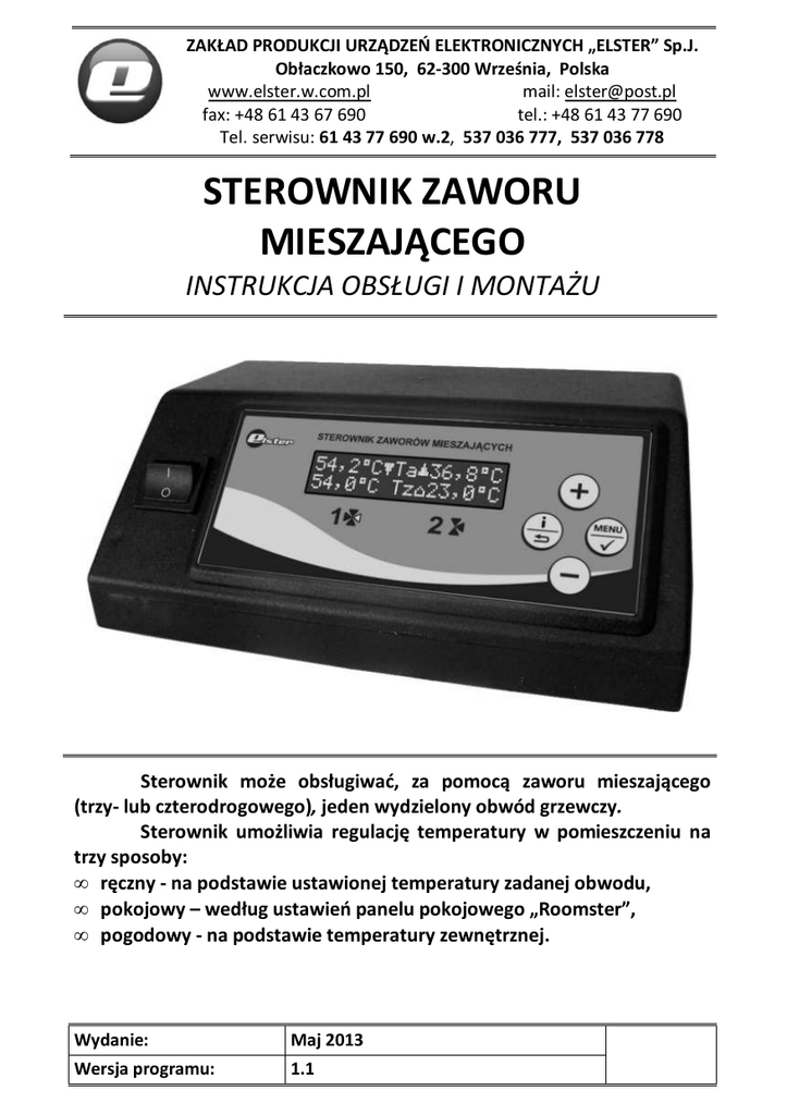 ZAKŁAD PRODUKCJI URZĄDZEŃ ELEKTRONICZNYCH „ELSTER” Sp.J. Obłaczkowo 150, 62-300 Września, Polska mail: [email protected] www.elster.w.com.pl fax: +48 61 43 67 690 tel.: +48 61 43 77 690 Tel. serwisu: 61 43 77 690 w.2, 537 036 777, 537 036 778 STEROWNIK ZAWORU MIESZAJĄCEGO INSTRUKCJA OBSŁUGI I MONTAŻU Sterownik może obsługiwać, za pomocą zaworu mieszającego (trzy- lub czterodrogowego), jeden wydzielony obwód grzewczy. Sterownik umożliwia regulację temperatury w pomieszczeniu na trzy sposoby: • ręczny - na podstawie ustawionej temperatury zadanej obwodu, • pokojowy – według ustawień panelu pokojowego „Roomster”, • pogodowy - na podstawie temperatury zewnętrznej. Wydanie: Maj 2013 Wersja programu: 1.1 STEROWNIK ZAWORÓW MIESZAJĄCYCH Spis treści I. Obsługa sterownika. ........................................................................... 3 1. Uruchamianie sterownika i obsługa pulpitu...................................... 3 2. Ustawianie parametrów zaworów mieszających. ............................. 4 3. Konfiguracja – parametry instalatora. .............................................. 5 4. Współpraca sterownika z zadajnikiem pokojowym. .......................... 6 II. Zasady sterowania zaworami. ............................................................ 7 1. Uwagi ogólne. .................................................................................. 7 2. Ogólny sposób sterowania. .............................................................. 7 3. Zasady sterowania zaworem w trybach podłogowych. ..................... 7 4. Zasady sterowania zaworem w trybach grzejnikowych. .................... 7 5. Zasady sterowania zaworem w trybie na powrocie. ......................... 8 III. Podłączenie sterownika. ................................................................... 8 1. Montaż mechaniczny. ...................................................................... 8 2. Montaż elektryczny. ......................................................................... 9 IV. Warunki pracy................................................................................. 10 V. Karta napraw gwarancyjnych........................................................... 11 Karta gwarancyjna ............................................................................... 12 2 STEROWNIK ZAWORÓW MIESZAJĄCYCH I. Obsługa sterownika. 1. Uruchamianie sterownika i obsługa pulpitu. Sterownik włączamy przyciskiem . Na początku wyświetlona zostanie wersja programu. W czasie jej wyświetlania sterownik przeprowadza test systemu, czujników i urządzeń. Po ich zakończeniu wyświetlony zostaje ekran główny. W górnym wierszu wyświetlana jest temperatura aktualna czynnika grzewczego na wyjściu zaworu oznaczona jako „Ta” oraz aktualny stan siłownika: otwieranie, zamykanie, spoczynek. W dolnym wierszu wyświetlana jest temperatura zadana oznaczona jako „Tz”, przy czym: - w przypadku aktywnego panelu pokojowego wyświetla się ikonka temperatury wyświetlany jest napis „POKOJ”. a w miejscu - w przypadku współpracy z czujnikiem pogodowym wyświetla się ikonka a wyświetlana jest temperatura zadana dla pomieszczenia. Działanie poszczególnych klawiszy: - przejście do edycji parametrów lub zatwierdzenie zmian, - uzyskanie dodatkowych informacji o obwodach grzewczych lub anulowanie zmian, - zwiększanie wartości parametru, - zmniejszanie wartości parametru 3 STEROWNIK ZAWORÓW MIESZAJĄCYCH Po pierwszym uruchomieniu, oraz każdorazowo po przywróceniu ustawień fabrycznych (patrz rozdz. III), ze względów bezpieczeństwa, oba moduły zaworów skonfigurowane są jako zawory trójdrogowe w trybie pracy podłogowym – w celu prawidłowej regulacji należy koniecznie odpowiednio skonfigurować sterownik. 2. Ustawianie parametrów zaworów mieszających. W celu przejścia do podglądu lub zmiany parametrów sterowania poszczególnych zaworów należy, będąc w ekranie głównym, jednorazowo nacisnąć przycisk , pokaże się wtedy ekran wyboru zaworu: Ponieważ jest tylko jeden moduł należy wybór zatwierdzić przyciskiem . Naciśnięcie przycisku spowoduje powrót do ekranu głównego. Po wybraniu zaworu pokaże się ekran z numerem parametru [1], opisem [TEMP. ZADANA OBWODU] i jego wartością [40,0°C]. Mrugający kursor przy numerze parametru oznacza, że uruchomione jest przeglądanie parametrów, a za pomocą przycisków metr. i możemy wybierać następny lub poprzedni para- Wciśniecie przycisku powoduje przejście do edycji wybranego parametru – kursor będzie mrugać przy wartości parametru. Przyciskami i zmieniamy wartość parametru. Po zmianie warto- lub anulować przyciskiem . Nastąpi ści można ją zatwierdzić przyciskiem powrót do trybu przeglądania parametrów. Dla użytkownika standardowo dostępne są następujące parametry: 4 STEROWNIK ZAWORÓW MIESZAJĄCYCH [1] TEMPERATURA ZADANA: OBWODU / DOMOWA / MAKSYMALNA – w zależności od aktualnego sposobu regulacji: - TZ OBOWODU, aktywna w trybie regulacji ręcznej, ustawia temperaturę zadaną dla danego obwodu grzewczego; - TZ DOMOWA, aktywna w trybie regulacji pogodowej, ustawia temperaturę pożądaną dla pomieszczenia - rzeczywista temperatura zadana dla zaworu jest obliczana na podstawie temperatury dla pomieszczenia; - TZ MAKSYMALNA, aktywna w trybie regulacji pokojowej, określa maksymalną temperaturę wody zasilającej dla danego obwodu grzewczego. Podczas pracy w trybach ogrzewania podłogowego maksymalna temperatura jaką można ustawić lub jaką może wyliczyć regulator w trybie regulacji pogodowej, jest ograniczona do 40°C. [2] TEMPERATURA ZADANA POWROTU – ustawia minimalną temperaturę wody powracającej z obiegu grzewczego – poniżej tej temperatury zawór jest ustawiany tak, aby temperatura powrotu mogła osiągnąć wartość minimalną. Parametr jest dostępny do edycji tylko podczas obsługi zaworu czterodrogowego oraz zaworu trójdro