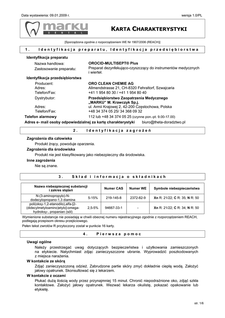 Data wystawienia: 09.01.2009 r. wersja 1.0/PL KARTA CHARAKTERYSTYKI [Sporządzona zgodnie z rozporządzeniem WE Nr 1907/2006 (REACH)] 1. Identyfikacja preparatu, Identyfikacja przedsiębiorstwa Identyfikacja preparatu OROCID-MULTISEPT® Plus Preparat dezynfekująco-czyszczący do instrumentów medycznych i wierteł. Nazwa handlowa: Zastosowanie preparatu: Identyfikacja przedsiębiorstwa Producent: Adres: Telefon/Fax: Dystrybutor: ORO CLEAN CHEMIE AG Allmendstrasse 21, CH-8320 Fehraltorf, Szwajcaria +41 1 954 80 30 / +41 1 954 80 40 Przedsiębiorstwo Zaopatrzenia Medycznego „MARKU” M. Krawczyk Sp.j. Adres: ul. Armii Krajowej 2, 42-200 Częstochowa, Polska Telefon/Fax: +48 34 374 05 25/ 34 368 09 32 Telefon alarmowy 112 lub +48 34 374 05 25 (czynne pon.-pt. 9.00-17.00) Adres e- mail osoby odpowiedzialnej za kartę charakterystyki [email protected] 2. Identyfikacja zagrożeń Zagrożenia dla człowieka Produkt żrący, powoduje oparzenia. Zagrożenia dla środowiska Produkt nie jest klasyfikowany jako niebezpieczny dla środowiska. Inne zagrożenia Nie są znane. 3. Skład i informacja o składnikach Nazwa niebezpiecznej substancji i zakres stężeń N-(3-aminopropylo)-Ndodecylopropano-1,3 diamina poli(oksy-1,2-etanodilo),alfa-[2(didecylmetyloamino)etylo]-omegahydroksy-, propanian (sól) Numer CAS Numer WE Symbole niebezpieczeństwa 5-15% 219-145-8 2372-82-9 Xn R: 21/22; C R: 35; N R: 50 2,5-5% 94667-33-1 - Xn R: 21/22; C R: 34; N R: 50 Wymienione substancje nie posiadają w chwili obecnej numeru rejestracyjnego zgodnie z rozporządzeniem REACH, podlegają przepisom okresu przejściowego. Pełen tekst zwrotów R przytoczony został w punkcie 16 karty. 4. Pierwsza pomoc Uwagi ogólne Należy przestrzegać uwag dotyczących bezpieczeństwa i użytkowania zamieszczonych na etykiecie. Natychmiast zdjąc zanieczyszczone ubranie. Wyprowadzić poszkodowanych z miejsca narażenia. W kontakcie ze skórą Zdjąć zanieczyszczoną odzież. Zabrudzone partie skóry zmyć dokładnie ciepłą wodą. Założyć jałowy opatrunek. Skonsultować się z lekarzem. W kontakcie z oczami Płukać dużą ilością wody przez przynajmniej 15 minut. Chronić niepodrażnione oko, zdjąć szkła kontaktowe. Założyć jałowy opatrunek. Wezwać lekarza okulistę, pokazać opakowanie lub etykietę. str. 1/6 KARTA CHARAKTERYSTYKI Nazwa handlowa: Producent: Adres: Telefon/Fax: Data wystawienia: OROCID-MULTISEPT® Plus ORO CLEAN CHEMIE AG Allmendstrasse 21; CH-8320 Fehraltorf +41 1 954 80 30/+41 1 954 80 40 09.01.2009 r. Dystrybutor: Adres: Telefon/Fax: Przedsiębiorstwo Zaopatrzenia Medycznego „MARKU” M. Krawczyk Sp.j. ul. Armii Krajowej 2, 42-200 Częstochowa, +48 34 374 05 25/34 368 09 32 W przypadku spożycia Nie wywoływać wymiotów. Wypłukać poszkodowanemu usta wodą, a następnie podać do picia duże ilości wody. Nigdy nie podawać niczego do ust osobie nieprzytomnej. Wezwać lekarza, pokazać opakowanie lub etykietę. W przypadku narażenia drogą oddechową W przypadku narażenia przenieść poszkodowanego na świeże powietrze. Zapewnić spokój. Skonsultować się z lekarzem. Wskazówki dla lekarza Leczenie objawowe. 5. Postępowanie w przypadku pożaru Odpowiednie środki gaśnicze Produkt sam nie jest palny, należy zastosować środki gaśnicze odpowiednie do palących się w pobliżu materiałów. Nieodpowiednie środki gaśnicze Zwarty strumień wody – ryzyko rozprzestrzenienia pożaru. Uwagi dodatkowe Zagrożone ogniem pojemniki polewać z bezpiecznej odległości rozpylonym strumieniem wody. Należy nie dopuścić do przedostania się wody gaśniczej do kanalizacji, wód powierzchniowych i gruntowych. 6. P o stę pow a n ie w prz yp a d ku n iez a m ierz on eg o uw oln i en i a do ś ro dow iska Indywidualne środki ostrożności Uwaga – niebezpieczeństwo poślizgnięcia się na rozlanym produkcie. Unikać kontaktu ze skórą i oczami. Zakładać środki ochrony indywidualnej zgodnie z punktem 8 karty. Niezbędne środki w zakresie ochrony środowiska Nie wylewać do kanalizacji, wód powierzchniowych i gruntowych. W przypadku rozlania większych ilości preparatu należy poczynić odpowiednie kroki w celu niedopuszczenia do rozprzestrzenienia się w środowisku naturalnym - obwałować. Wezwać stosowne służby ratownicze. Metody oczyszczania/wchłaniania Produkt zebrać za pomocą materiałów wchłaniających ciecze (np. piasek, ziemia, uniwersalne substancje wiążące, krzemionka, trociny itp.). Przestrzegać odpowiednich przepisów. Oczyścić skażone miejsce. 7. Postępowanie z preparatem i jego magazynowanie Postępowanie z preparatem Przestrzegać przepisów prawnych w zakresie ochrony i bezpieczeństwa. Unikać kontaktu ze skórą i oczami. Podczas pracy z produktem nie jeść, nie pić i nie palić. Magazynowanie Przechowywać tylko w oryginalnych, odpowiednio oznakowanych, szczelnie zamkniętych opakowaniach z dala od kwasów. Przechowywać w temperaturze pokojowej. Przechowywać na szczelnym, odpornym na ługi podłożu. Nie trzymać razem z żywnością i paszami dla zwierząt. Specyficzne zastosowania Preparat dezynfekująco-czyszczący do instrumentów medycznych i wierteł. 8. Kontrola narażania i środki ochrony indywidualnej Wartości graniczne narażania Produkt nie zawiera w swoim składzie substancji podlegających kontroli narażenia w miejscu pracy. str. 2/7 KARTA CHARAKTERYSTYKI Nazwa handlowa: Producent: Adres: Telefon/Fax: Data wystawienia: OROCID-MULTISEPT® Plus ORO CLEAN CHEMIE AG Allmendstrasse 21; CH-8320 Fehraltorf +41 1 954 80 30/+41 1 954 80 40 09.01.2009 r. Dystrybutor: Adres: Telefon/Fax: Przedsiębiorstwo Zaopatrzenia Medycznego „MARKU” M. Krawczyk Sp.j. ul. Armii Krajowej 2, 42-200 Częstochowa, +48 34 374 05 25/34 368 09 32 Kontrola narażenia w miejscu pracy Przestrzegać ogólnych zasad bezpieczeństwa i higieny. Przed przerwą i po zakończeniu pracy umyć ręce. W czasie pracy nie jeść, nie pić i nie palić. Unikać kontaktu ze skó