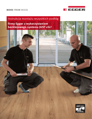 Instrukcja montażu wszystkich podłóg firmy Egger z wykorzystaniem bezklejowego systemu JUST clic! ODPOWIEDZIALNOŚĆ W ZAKRESIE KONTROLI 1. ODPOWIEDZIALNOŚĆ W ZAKRESIE KONTROLI Podłogi laminowane i podłogi w technologii cork+ firmy EGGER są wytwarzane z najwyższą precyzją, w najnowocześniejszych zakładach produkcyjnych. Zarówno półprodukty, jak również produkty końcowe poddawane są regularnym i surowym kontrolom. Pomimo przeprowadzanych kontroli jakości nie można całkowicie wykluczyć uszkodzeń poszczególnych elementów, które mogą powstać np. podczas transportu. Dlatego przed montażem należy jeszcze raz dokładnie obejrzeć elementy podłogi. 2. PODŁOŻE 2.1 Generalnie obowiązuje zasada, że zleceniobiorca przeprowadzający montaż podłogi jest zobligowany do tego, by przed przystąpieniem do prac sprawdzić, czy podłoże, na którym ma być przeprowadzony montaż, spełnia wymagane właściwości. Podczas oceny wymaganych właściwości podłoża, na którym ma być ułożona podłoga laminowana i podłoga w technologii cork+ firmy EGGER, należy uwzględnić w szczególności następujące punkty: BADANIE WILGOTNOŚCI PODŁOŻA: Badanie należy wykonać przy użyciu wilgotnościomierza karbidowego, przy czym nie mogą być przekroczone następujące wartości graniczne: W przypadku jastrychów cementowych ≤ 2% CM – jastrychów ogrzewanych ≤ 1,8% CM W przypadku jastrychów anhydrytowych/jastrychów anhydrytowych samopoziomujących ≤ 0,5% CM – jastrychów ogrzewanych ≤ 0,3% CM Wartości te obowiązują dla jastrychów bez domieszek. W przypadku użycia domieszek oraz w przypadku jastrychów szybkoschnących należy stosować się do wytycznych producenta dotyczących zalecanych pomiarów oraz wartości granicznych. Próbkę do pomiaru należy pobrać z najniższej warstwy, dzieląc całą warstwę jastrychu w poziomie na trzy równe warstwy. Jednocześnie należy zmierzyć grubość warstwy jastrychu i sporządzić odpowiednią dokumentację. BADANIE RÓWNOŚCI PODŁOŻA: Badanie równości podłoża wykonywane jest zgodnie z obowiązującymi normami i odbywa się poprzez przyłożenie poziomicy do najwyższych punktów powierzchni i ustalenie średnicy przy najniżej położonym punkcie w odniesieniu do powierzchni przylegania (odstępów punktów pomiarowych). W przypadku odstępu pomiędzy punktami pomiarowymi wynoszącego 100 cm pionowe odchylenie może wynosić maksymalnie 2 mm. Większe odchylenia należy zniwelować, stosując odpowiednie środki (np. samopoziomujące masy szpachlowe). BADANIE NOŚNOŚCI PODŁOŻA: Podłoże musi być równe i nośne. BADANIE CZYSTOŚCI PODŁOŻA: Podłoże musi być odkurzone i czyste. BADANIE WARUNKÓW KLIMATYCZNYCH W POMIESZCZENIU: Przed, w trakcie oraz po montażu zagwarantowane muszą być następujące warunki: Temperatura w pomieszczeniu powinna wynosić przynajmniej 18° C Temperatura powierzchni podłoża powinna wynosić przynajmniej 15° C Względna wilgotność powietrza powinna wynosić pomiędzy 40 % a 70 % 2.2 Do pływającego ułożenia podłóg laminowanych i podłóg w technologii cork+ firmy EGGER nadają się wszystkie podłoża, które spełniają wyżej wymienione warunki. Są to głównie: wszystkie rodzaje jastrychów, łącznie z jastrychami ogrzewanymi ciepłą wodą konstrukcje z płyt wiórowych płyty pilśniowe istniejące podłogi, np. linoleum, wykładziny PVC, posadzki z kamienia naturalnego oraz z płytek ceramicznych ZA NIEODPOWIEDNIE PODŁOŻA UZNAJE SIĘ: tekstylne wykładziny podłogowe podłoża niespełniające wymaganych właściwości 2 PODŁOŻA ZA PODŁOŻA ODPOWIEDNIE W OGRANICZONYM STOPNIU UZNAJE SIĘ: podłogi ogrzewane elektrycznie (sterowanie temperatury powierzchni) Elektryczne ogrzewanie podłogowe generalnie kwalifikuje się jako odpowiednie podłoże, w przypadku, gdy jego elementy są zatopione w warstwie jastrychu lub betonu. Nie kwalifikuje się natomiast, jeżeli zastosowane jest w formie maty grzejnej ułożonej na warstwie betonu. Maty grzejne wyposażone w regulację mogą zostać zaakceptowane jako odpowiednie podłoże, jeżeli zagwarantowane zostanie, że temperatura powierzchni w żadnym momencie nie przekroczy 28° C. UWAGA! W przypadku podłoży mineralnych przed podkładem dźwiękochłonnym ułożyć należy na całej powierzchni jako warstwę paroizolacyjną folię do izolacji przeciwwilgociowej o współczynniku SD > 75 m, tak aby nachodziła na ściany. Jeżeli stosowane są podkłady dźwiękochłonne spoza asortymentu firmy EGGER, w przypadku montażu pływającego na jastrychach z ogrzewaniem podłogowym, wyklucza się jakąkolwiek gwarancję odnośnie do zachowania efektywnego, maksymalnego dopuszczalnego oporu cieplnego całej konstrukcji. JASTRYCHY W przypadku montażu pływającego tych elementów podłogowych na jastrychach należy się liczyć z tym, że wilgoć może przenikać do góry. Z uwagi na powyższe, na wszystkich jastrychach (z wyjątkiem asfaltu lanego) przed położeniem systemowego podkładu dźwiękochłonnego (patrz punkt: UWAGA! Materiały podkładowe) ułożyć należy na całej powierzchni jako warstwę paroizolacyjną folię do izolacji przeciwwilgociowej o współczynniku SD > 75 m, tak aby nachodziła na ściany. Pasma folii powinny nachodzić na siebie na szerokości co najmniej 20 cm. JASTRYCHY Z WODNYM OGRZEWANIEM PODŁOGOWYM Każdy rodzaj ogrzewania podłogowego wymaga uzależnionego od zakresu zastosowania planowania oraz koordynacji z uwzględnieniem systemu ogrzewania oraz rodzaju jastrychu, mających na celu zagwarantowanie niepowodującego szkód oraz optymalnego działania na długi czas. Zasadniczo przed montażem podłóg należy usunąć istniejące wykładziny. Oprócz zwykłych kontroli podłoża, w przypadku nowych jastrychów należy dodatkowo przedłożyć protokół nagrzewania potwierdzający właściwe fazy nagrzewania i chłodzenia. Prawidłowe nagrzewanie i chłodzenie ogrzewany
