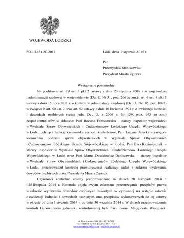 Wystąpienie pokontrolne - Łódzki Urząd Wojewódzki w Łodzi