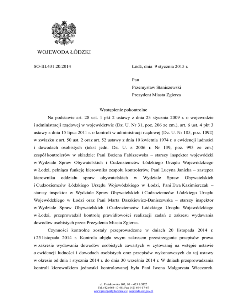 WOJEWODA ŁÓDZKI SO-III.431.20.2014 Łódź, dnia 9 stycznia 2015 r. Pan Przemysław Staniszewski Prezydent Miasta Zgierza Wystąpienie pokontrolne Na podstawie art. 28 ust. 1 pkt 2 ustawy z dnia 23 stycznia 2009 r. o wojewodzie i administracji rządowej w województwie (Dz. U. Nr 31, poz. 206 ze zm.), art. 6 ust. 4 pkt 3 ustawy z dnia 15 lipca 2011 r. o kontroli w administracji rządowej (Dz. U. Nr 185, poz. 1092) w związku z art. 50 ust. 2 oraz art. 52 ustawy z dnia 10 kwietnia 1974 r. o ewidencji ludności i dowodach osobistych (tekst jedn. Dz. U. z 2006 r. Nr 139, poz. 993 ze zm.) zespół kontrolerów w składzie: Pani Bożena Fabiszewska – starszy inspektor wojewódzki w Wydziale Spraw Obywatelskich i Cudzoziemców Łódzkiego Urzędu Wojewódzkiego w Łodzi, pełniąca funkcję kierownika zespołu kontrolerów, Pani Lucyna Janicka – zastępca kierownika oddziału spraw obywatelskich w Wydziale Spraw Obywatelskich i Cudzoziemców Łódzkiego Urzędu Wojewódzkiego w Łodzi, Pani Ewa Kazimierczak – starszy inspektor w Wydziale Spraw Obywatelskich i Cudzoziemców Łódzkiego Urzędu Wojewódzkiego w Łodzi oraz Pani Marta Daszkiewicz-Daniszewska – starszy inspektor w Wydziale Spraw Obywatelskich i Cudzoziemców Łódzkiego Urzędu Wojewódzkiego w Łodzi, przeprowadził kontrolę prawidłowości realizacji zadań z zakresu wydawania dowodów osobistych przez Prezydenta Miasta Zgierza. Czynności kontrolne zostały przeprowadzone w dniach 20 listopada 2014 r. i 25 listopada 2014 r. Kontrola objęła swym zakresem przestrzeganie przepisów prawa w zakresie wydawania dowodów osobistych zawartych w cytowanej na wstępie ustawie o ewidencji ludności i dowodach osobistych oraz przepisów wykonawczych do tej ustawy w okresie od dnia 1 stycznia 2014 r. do dnia 30 września 2014 r. W dniach przeprowadzania kontroli kierownikiem jednostki kontrolowanej była Pani Iwona Małgorzata Wieczorek. ul. Piotrkowska 103, 90 – 425 ŁÓDŻ Tel. (42) 664-17-68; Fax (42) 664-17-67 www.paszporty.lodzkie.eu; [email protected] 2 W dniu 30 listopada 2014 r. w wyniku wygranej w wyborach samorządowych, Prezydentem Miasta Zgierza został Pan Przemysław Staniszewski. Kontroli zostały poddane następujące zagadnienia: sprawdzenie dokumentacji zgromadzonej w kopertach dowodowych niezbędnej do wydawania dowodów osobistych, z uwzględnieniem szczegółowej weryfikacji danych zawartych we wniosku z danymi wynikającymi z odpisów aktów stanu cywilnego i dokumentów zgromadzonych w kopercie dowodowej oraz prawidłowości wprowadzania danych do Systemu Wydawania Dowodów Osobistych, sprawdzenie sposobu prowadzenia ewidencji wydanych i unieważnionych dowodów osobistych. Mając na uwadze dokonane podczas kontroli ustalenia stwierdzono, iż zagadnienia objęte kontrolą były realizowane zgodnie z przepisami zawartymi w ustawie o ewidencji ludności i dowodach osobistych. Kontroli poddano dokumentację dotyczącą 224 sztuk dowodów osobistych, co stanowi 4% ogólnej liczby dowodów osobistych wydanych w kontrolowanym okresie, w tym dokumentację dotyczącą 50 dowodów osobistych wydanych osobom małoletnim, a także 15 kopert dowodowych osób zmarłych. Dokumentacja zgromadzona w kopertach dowodowych odpowiada wymogom określonym w rozporządzeniu Rady Ministrów z dnia 6 lutego 2009 r. w sprawie wzoru dowodu osobistego oraz trybu postępowania w sprawach wydawania dowodów osobistych, ich unieważniania, wymiany, zwrotu lub utraty (Dz. U. Nr 47, poz. 384 ze zm.) tj. zawiera wniosek o wydanie dowodu osobistego z załączonymi dwoma fotografiami, formularz dowodowy, część B formularza zawiera datę i podpis osoby odbierającej dowód osobisty oraz pozostałe dokumenty składane w celu wydania dowodu osobistego (akt urodzenia bądź akt małżeństwa). Koperty dowodowe są oznaczone w sposób zgodny z wymaganiami określonymi w rozporządzeniu Ministra Spraw Wewnętrznych z dnia 19 grudnia 2012 r. w sprawie zgłaszania i przyjmowania danych niezbędnych do zameldowania i wymeldowania oraz prowadzenia ewidencji ludności i ewidencji wydanych i unieważnionych dowodów osobistych (Dz. U. poz. 1475) tj. zawierają imię i nazwisko osoby, imię ojca, datę urodzenia, numer PESEL oraz serię i numer dowodu osobistego. W przypadku osób małoletnich powyżej 13 roku życia na wniosku o wydanie dowodu osobistego znajdował się podpis jednego z rodziców, a małoletni składał podpis zarówno na wniosku, jak i na formularzu. Wnioski o wydanie dowodu osobistego dla osób małoletnich 3 poniżej 13 roku życia zawierały podpisy obojga rodziców oraz uzasadnienie co do przyczyny wydania dokumentu. Unieważnianie dowodów osobistych z przyczyn i w terminach określonych w art. 43 ust. 1 i ust. 2 ustawy o ewidencji ludności i dowodach osobistych odbywa się na bieżąco. We wszystkich zbadanych przypadkach dowody osobiste osób zmarłych są unieważniane na podstawie aktu zgonu osoby (jako datę unieważnienia wpisywana jest data zgonu), a dowody osobiste osób, które zgłosiły utratę dokumentu unieważniane są na podstawie zgłoszenia o utracie dowodu osobistego (w kopercie dowodowej przechowywane są kopie zaświadczeń o utracie dowodu osobistego). Wezwania z innej gminy do nadesłania koperty dowodowej są realizowane niezwłocznie, a wezwanie to jest umieszczane w dotychczasowym miejscu przechowywania koperty, co jest zgodne z § 25 ust. 2 rozporządzenia Ministra Spraw Wewnętrznych z dnia 19 grudnia 2012 r. Organ gminy prawidłowo wprowadza dane do Systemu Wydawania Dowodów Osobistych tj. dane znajdujące się w systemie SWDO są zgodne z danymi znajdującymi się na wniosku o wydanie dowodu osobistego. Dane osobowe zawarte w części A formularza oraz skanowaną fotografię i podpis wnioskodawcy organ gminy niezwłocznie przekazuje w drodze teletransmisji danych, w formie dokumentu elektronicznego, do ministra właściwego do spraw wewnętrznych w celu wytworzenia dowodu osobistego, co jest zg