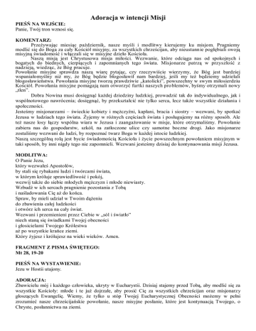 Adoracja w intencji Misji PIEŚŃ NA WEJŚCIE: Panie, Twój tron wznosi się. KOMENTARZ: Przeżywając miesiąc październik, nasze myśli i modlitwy kierujemy ku misjom. Pragniemy modlić się do Boga za cały Kościół misyjny, za wszystkich chrześcijan, aby nieustannie pogłębiali swoją misyjną świadomość i włączali się w misyjne dzieło Kościoła. Naszą misją jest Chrystusowa misja miłości. Wezwanie, które odciąga nas od spokojnych i bogatych do biednych, cierpiących i zapomnianych tego świata. Misjonarze patrzą w przyszłość z nadzieją, wiedząc, że Bóg pracuje. Powołanie misyjne sprawdza naszą wiarę pytając, czy rzeczywiście wierzymy, że Bóg jest bardziej wspaniałomyślny niż my, że Bóg będzie błogosławił nam bardziej, jeśli my też będziemy udzielali błogosławieństwa. Powołania misyjne tworzą prawdziwie „katolicki”, powszechny w swym miłosierdziu Kościół. Powołania misyjne pomagają nam otworzyć furtki naszych problemów, byśmy otrzymali nowy „tlen”. Dobra Nowina musi dosięgnąć każdej dziedziny ludzkiej, prowadzić tak do indywidualnego, jak i wspólnotowego nawrócenia; dosięgnąć, by przekształcić nie tylko serca, lecz także wszystkie działania i społeczności. Jesteśmy misjonarzami – świeckie kobiety i mężczyźni, kapłani, bracia i siostry – wezwani, by spotkać Jezusa w ludziach tego świata. Żyjemy w różnych częściach świata i posługujemy na różny sposób. Ale też nasze losy łączy wspólna wiara w Jezusa i zaangażowanie w misje, które otrzymaliśmy. Powołanie zabiera nas do gospodarstw, szkół, na zatłoczone ulice czy samotne boczne drogi. Jako misjonarze zostaliśmy wezwani do ludzi, by rozpoznać twarz Boga w każdej istocie ludzkiej. Naszą szczególną rolą jest bycie świadomością Kościoła i życie powszechnym powołaniem misyjnym w taki sposób, by inni nigdy tego nie zapomnieli. Wezwani jesteśmy dzisiaj do kontynuowania misji Jezusa. MODLITWA: O Panie Jezu, który wezwałeś Apostołów, by stali się rybakami ludzi i twórcami świata, w którym króluje sprawiedliwość i pokój, wezwij także do siebie młodych mężczyzn i młode niewiasty. Wzbudź w ich sercach pragnienie pozostania z Tobą i naśladowania Cię aż do końca. Spraw, by mieli udział w Twoim dążeniu do zbawienia całej ludzkości i otwórz ich serca na cały świat. Wezwani i przemienieni przez Ciebie w „sól i światło” niech staną się świadkami Twojej obecności i głosicielami Twojego Królestwa aż po wszystkie krańce ziemi. Który żyjesz i królujesz na wieki wieków. Amen. FRAGMENT Z PISMA ŚWIĘTEGO: Mt 28, 19-20 PIEŚŃ NA WYSTAWIENIE: Jezu w Hostii utajony. ADORACJA: Zbawicielu mój i każdego człowieka, ukryty w Eucharystii. Dzisiaj stajemy przed Tobą, aby modlić się za wszystkie Kościoły: młode i te już dojrzałe, aby prosić Cię za wszystkich chrześcijan oraz misjonarzy głoszących Ewangelię. Wiemy, że tylko u stóp Twojej Eucharystycznej Obecności możemy w pełni zrozumieć nasze chrześcijańskie powołanie, nasze misyjne posłanie, które jest kontynuacją Twojego, o Chryste, posłannictwa na ziemi. Dzięki Ci składamy! Za tych, którzy bez żadnej korzyści pogłębiają świadomość misyjną ochrzczonych, za tych duchownych i świeckich, którzy z otwartością serca pogłębiają świadomość swojego zadania misyjnego w Kościele, za misjonarzy, którzy będąc świadomi swego posłannictwa budują Kościół, włączający się świadomie w głoszenie Ewangelii wszystkim narodom. Jezu Chryste! Na klęczkach również przepraszamy Cię za każde zło uczynione, wypowiedziane i pomyślane: Panie, zmiłuj się nad nami! Za to, że nie chcemy pogłębiać i umacniać naszej świadomości misyjnej, za to, że nie zależy nam na ludziach nie znających Ewangelii, za to, że nie chcemy korzystać z prasy misyjnej, która pogłębia naszą świadomość bycia Kościołem. Panie nasz! Na klęczkach prosimy Cię, wołając: Chryste, usłysz nas! Niech w naszej parafii wszyscy świadomie przeżyją nadchodzący Światowy Dzień i Tydzień Misyjny, niech misjonarze, zakładając Kościoły i będąc sami darem wiary, uczą wyznawców Chrystusa przynależności do Kościoła, który dzieli się wiarą z innymi, niech każda nasza modlitwa i każdy czyn na rzecz misji będzie następstwem wciąż pogłębianej świadomości misyjnej. MODLITWA WIERNYCH: Módlmy się za Kościół święty, aby głosząc Ewangelię wszystkim narodom, uobecniał w świecie królestwo pokoju, sprawiedliwości i przebaczenia, a w nas budził poczucie braterstwa i odpowiedzialności za innych. Ciebie prosimy... Módlmy się za Ojca Świętego, aby w mocy Ducha Świętego wskazywał wiernym drogę Chrystusowej miłości. Ciebie prosimy... Módlmy się za biskupów całego świata, aby Ten, który wybrał ich i powołał do szczególnej posługi w Kościele, wypełniał swoją obecnością serca i umysły pasterzy Kościoła. Ciebie prosimy... Módlmy się za misjonarzy i misjonarki, aby głosząc orędzie przebaczenia i miłosierdzia, wiernie naśladowali swego Mistrza, Dobrego Nauczyciela. Ciebie prosimy... Módlmy się za wszystkich kapłanów, zakonników, siostry zakonne i wiernych świeckich, aby spiesząc z chrześcijańską misją miłości, unikali niebezpieczeństwa fanatycznej ingerencji w sumienia innych ludzi. Ciebie prosimy... Módlmy się za chorych, samotnych i zrozpaczonych, aby doświadczyli ludzkiej życzliwości i przyjaźni, a w bliskości z Chrystusem odkryli sens swojego życia i cierpienia. Ciebie prosimy... Módlmy się za nas tu obecnych, abyśmy wykorzystując ten czas jak najowocniej, wspierali się wzajemnie w gorliwości i oddaniu Kościołowi i pracy na rzecz misji oraz odnowili serca i umysły u Źródła Życia – w Eucharystycznej Ofierze Ołtarza. Ciebie prosimy... MODLITWA PRZED BŁOGOSŁAWIEŃSTWEM: Panie Jezu, który oczekujesz od nas ciągłego 