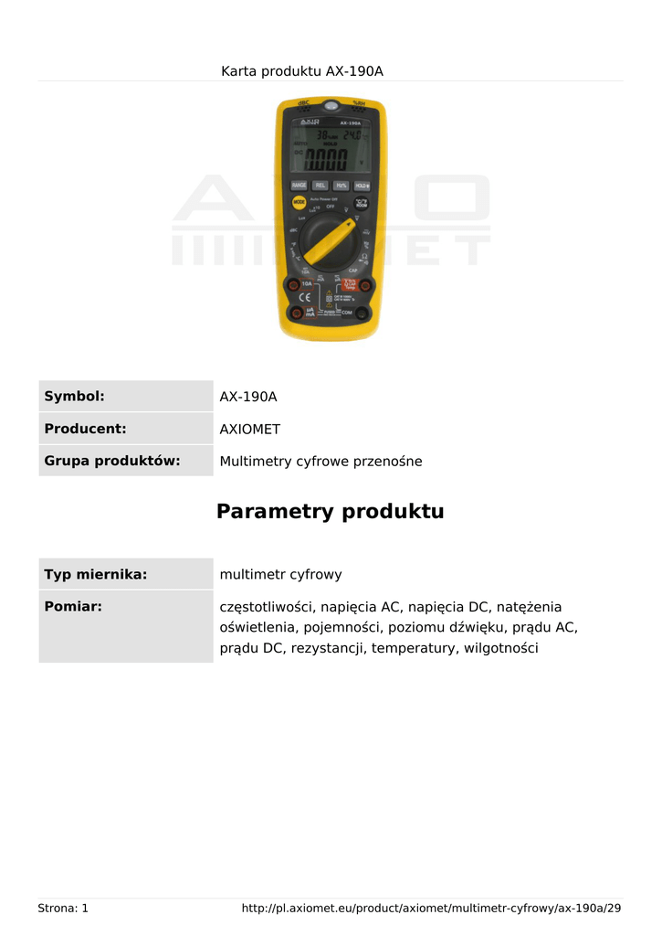 Karta produktu AX-190A Symbol: AX-190A Producent: AXIOMET Grupa produktów: Multimetry cyfrowe przenośne Parametry produktu Typ miernika: multimetr cyfrowy Pomiar: częstotliwości, napięcia AC, napięcia DC, natężenia oświetlenia, pojemności, poziomu dźwięku, prądu AC, prądu DC, rezystancji, temperatury, wilgotności Strona: 1 http://pl.axiomet.eu/product/axiomet/multimetr-cyfrowy/ax-190a/29 Karta produktu AX-190A Właściwości przyrządów pomiarowych: automatyczna zmiana polaryzacji automatyczne wyłączanie funkcja HOLD (zatrzymanie wskazań wyświetlacza) funkcja pomiaru relatywnego REL ochrona przeciwprzeciążeniowa wskaźnik przekroczenia zakresu pomiarowego bezdotykowy wykrywacz napięcia automatyczny wybór zakresów pomiarowych wskaźnik niskiego poziomu baterii Rodzaj użytego wyświetlacza: Próbkowanie: Zakres pomiaru napięcia DC: Dokładność pomiaru napięcia DC: Zakres pomiaru napięcia AC: Dokładność pomiaru napięcia AC: Zakres pomiaru prądu DC: Dokładność pomiaru prądu DC: Zakres pomiaru prądu AC: Dokładność pomiaru prądu AC: Strona: 2 LCD (4000) 3x/s 0,1m...400m/4/40/400/600V ±(1,5% + 4 cyfry) 0,1m...400m/4/40/400/600V ±(1% + 4 cyfry) 0,1µ...400µ/4000µ/400m/10A ±(1% + 2 cyfry) 0,1µ...400µ/4000µ/400m/10A ±(1,5% + 2 cyfry) http://pl.axiomet.eu/product/axiomet/multimetr-cyfrowy/ax-190a/29 Karta produktu AX-190A Zakres pomiaru rezystancji: Dokładność pomiaru rezystancji: Zakres pomiaru pojemności: Dokładność pomiaru pojemności: Zakres pomiaru częstotliwości: Dokładność pomiaru częstotliwości: Zakres pomiaru temperatury: Zakres pomiaru wilgotności: Zakres pomiaru natężenia dźwięku: Dokładność pomiaru natężenia dźwięku: Współczynnik wypełnienia: Pomiar natężenia oświetlenia: Test diody: Test ciągłości obwodu: Wymiary zewnętrzne (szer. x gł. x wys.): Strona: 3 0,1...400/4k/40k/400k/4M/40MΩ ±(1,5% + 2 cyfry) 10p...50n/500n/5µ/50µ/100µF ±(3% + 5 cyfr) 0,001...5/50/500/5k/50k/500k/10MHz ±(1,2% + 3 cyfry) -20...1300 °C 33...99 % RH 35...100 dB ±5 dB 0,1...99,9 % 0,001...40 klux 1,4mA, 2,8V sygnał akustyczny dla R 78 x 48 x 170 mm http://pl.axiomet.eu/product/axiomet/multimetr-cyfrowy/ax-190a/29 Karta produktu AX-190A Masa z baterią: 335 g Źródło zasilania: 1 bateria 9V 6F22, brak baterii w zestawie Wyposażenie standardowe: Zgodność z normą: przewody pomiarowe sonda kropelkowa typu K EN61010 1000V CAT III, EN61010 600V CAT IV Informacje dodatkowe Masa brutto: Strona: 4 0,54 kg http://pl.axiomet.eu/product/axiomet/multimetr-cyfrowy/ax-190a/29