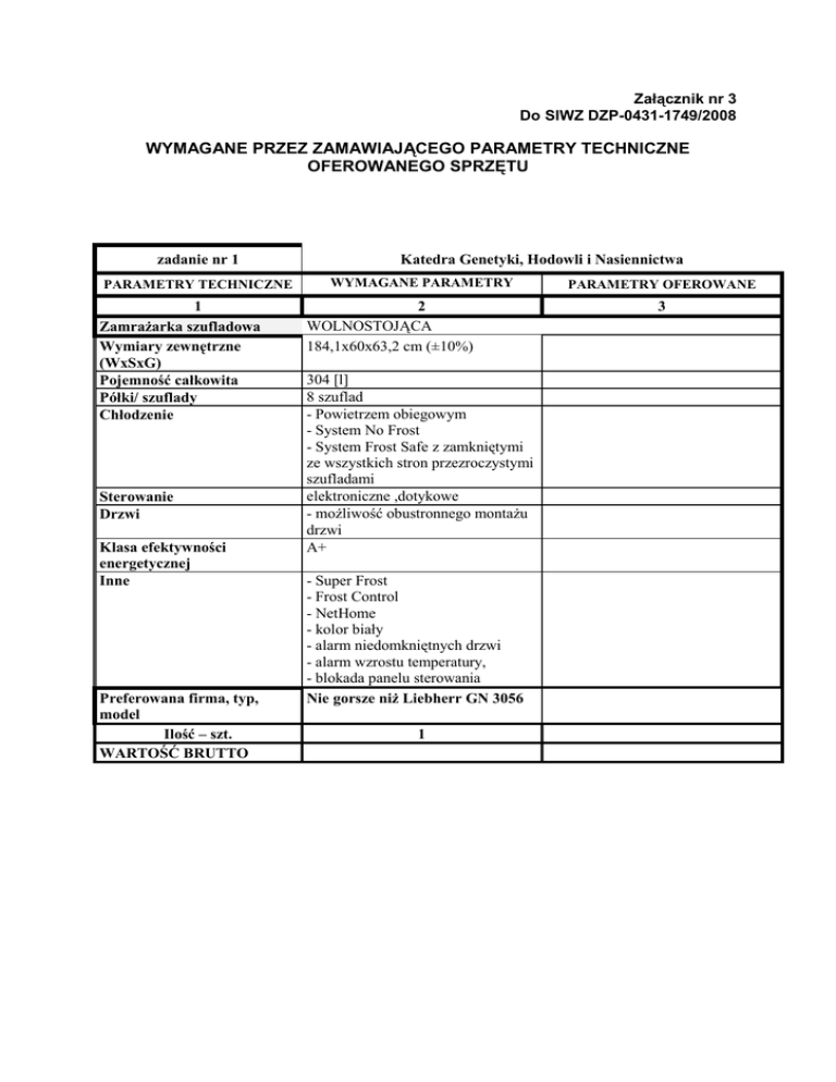 Załącznik nr 3 Do SIWZ DZP-0431-1749/2008 WYMAGANE PRZEZ ZAMAWIAJĄCEGO PARAMETRY TECHNICZNE OFEROWANEGO SPRZĘTU zadanie nr 1 PARAMETRY TECHNICZNE 1 ZamraŜarka szufladowa Wymiary zewnętrzne (WxSxG) Pojemność całkowita Półki/ szuflady Chłodzenie Sterowanie Drzwi Klasa efektywności energetycznej Inne Preferowana firma, typ, model Ilość – szt. WARTOŚĆ BRUTTO Katedra Genetyki, Hodowli i Nasiennictwa WYMAGANE PARAMETRY 2 WOLNOSTOJĄCA 184,1x60x63,2 cm (±10%) 304 [l] 8 szuflad - Powietrzem obiegowym - System No Frost - System Frost Safe z zamkniętymi ze wszystkich stron przezroczystymi szufladami elektroniczne ,dotykowe - moŜliwość obustronnego montaŜu drzwi A+ - Super Frost - Frost Control - NetHome - kolor biały - alarm niedomkniętnych drzwi - alarm wzrostu temperatury, - blokada panelu sterowania Nie gorsze niŜ Liebherr GN 3056 1 PARAMETRY OFEROWANE 3 zadanie nr 2 Katedra Fizjologii Roślin PARAMETRY TECHNICZNE WYMAGANE PARAMETRY PARAMETRY OFEROWANE 1 2 3 zamraŜarka Wymiary (WxSxG) Informacje ogólne ZuŜycie energii Klasa efektywności energetycznej ZamraŜarka Zdolność zamraŜania Zdolność przechowywania w przypadku awarii Drzwi Klasa klimatyczna Preferowana firma, typ, model Ilość – szt. WARTOŚĆ BRUTTO WOLNOSTOJĄCA 141x60x65 cm (±10%) - system wysokich drzwi, Softline Design, Bombie Softline Elektroniczna regulacja temperatury, wyświetlacz LED - Wspomaganie otwierania drzwi - odpływ wody z rozmraŜania - z przodu nóŜki o regulowanej wysokości, z tyłu rolki - system Etagenfrost - funkcja super mroŜenia - alarm optyczny i akustyczny - 5 przezroczyste szuflady, w tym 1 szuflada duŜa - kalendarz zamraŜania Ŝywności 230kWh/rok A+ **** 168 [l] 22kg w ciągu 24 h 20h - zamocowane prawostronnie, z moŜliwością zamiany strony SN-T Nie gorsze niŜ Bosch GSV 22V31 1 zadanie nr 3 Katedra Fitopatologii Leśnej PARAMETRY TECHNICZNE WYMAGANE PARAMETRY PARAMETRY OFEROWANE 1 2 3 ZamraŜarka Wymiary (WxSxG) Sterowanie Pojemność całkowita brutto [l] Pojemność całkowita netto [l] RozmraŜanie Półki Regulacja półek Pojemniki wyposaŜenie ZuŜycie energii Klasa efektywności energetycznej Powłoka antybakteryjna drzwi Poziom hałasu Oświetlenie wnętrza Waga Inne Preferowana firma, typ, model Ilość – szt. WARTOŚĆ BRUTTO WOLNOSTOJĄCA 143,5x60x62,5 cm (±10%) mechaniczne 285 284 Automatyczne 5 szklanych Szklana pokrywa Wymagana 1 pojemnik na warzywa pojemność 38 [l] - 2 pojemniki na jajka - blokada na butelki - 8 balkoników na drzwiach - błękitne baloniki 0,37 kWh/24h, 130 kWh/rok A+ Wymagana MoŜliwość obustronnego montaŜu 40 dB 52 kg - Regulowane nóŜki z przodu - samodomykjący się zawias - wypukły kształt drzwi Nie gorsze niŜ Gorenje R 6298 1 zadanie nr 4 Katedra Hodowli Roślin i Nasiennictwa PARAMETRY TECHNICZNE WYMAGANE PARAMETRY PARAMETRY OFEROWANE 1 2 3 zamraŜarka Wymiary (WxSxG) Informacje ogólne ZuŜycie energii Klasa efektywności energetycznej ZamraŜarka Zdolność zamraŜania Zdolność przechowywania w przypadku awarii Drzwi Klasa klimatyczna Preferowana firma, typ, model Ilość – szt. WARTOŚĆ BRUTTO WOLNOSTOJĄCA 141x60x65 cm (±10%) - system wysokich drzwi, Softline Design, Bombie Softline Elektroniczna regulacja temperatury, wyświetlacz LED - Wspomaganie otwierania drzwi - odpływ wody z rozmraŜania - z przodu nóŜki o regulowanej wysokości, z tyłu rolki - system Etagenfrost - funkcja super mroŜenia - alarm optyczny i akustyczny - 5 przezroczyste szuflady, w tym 1 szuflada duŜa - kalendarz zamraŜania Ŝywności 230kWh/rok A+ **** 168 [l] 22kg w ciągu 24 h 20h - zamocowane prawostronnie, z moŜliwością zamiany strony SN-T Nie gorsze niŜ Bosch GSV 22V31 1 zadanie nr 5 PARAMETRY TECHNICZNE 1 Czajnik bezprzewodowy Pojemność [l] Element grzejny Moc Automatyczne wyłączanie po zagotowaniu wody Wskaźnik poziomu wody z podziałką Dział Gospodarczy WYMAGANE PARAMETRY 2 1,7 l Płaski element grzejny ze stali nierdzewnej 2400 W Tak Tak, podwójny Filtr antyosadowy Wyjmowany filtr osadów Double Action Lampka kontrolna Tak Zabezpieczenie przed włączeniem pustego czajnika MoŜliwość nalewania wody bez zdejmowania pokrywki Tak Tak Termoizolowana obudowa Tak Stabilna nieprzesuwalna obrotowa podstawa czajnika Tak Kolor firma, typ, model Ilość – szt. WARTOŚĆ BRUTTO kremowy Nie gorszy niŜ Philips Cucina HD 4681 10 PARAMETRY OFEROWANE 3