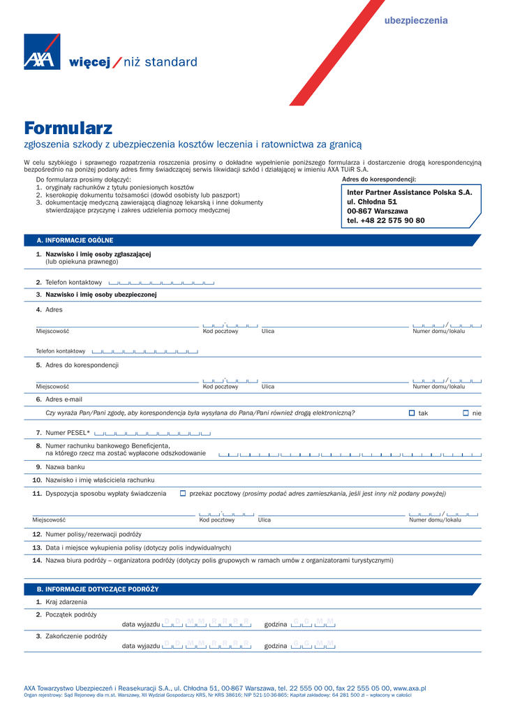 ubezpieczenia Formularz zgłoszenia szkody z ubezpieczenia kosztów leczenia i ratownictwa za granicą W celu szybkiego i sprawnego rozpatrzenia roszczenia prosimy o dokładne wypełnienie poniższego formularza i dostarczenie drogą korespondencyjną bezpośrednio na poniżej podany adres firmy świadczącej serwis likwidacji szkód i działającej w imieniu AXA TUiR S.A. Adres do korespondencji: Do formularza prosimy dołączyć: 1. oryginały rachunków z tytułu poniesionych kosztów Inter Partner Assistance Polska S.A. 2. kserokopię dokumentu tożsamości (dowód osobisty lub paszport) ul. Chłodna 51 3. dokumentację medyczną zawierającą diagnozę lekarską i inne dokumenty stwierdzające przyczynę i zakres udzielenia pomocy medycznej 00-867 Warszawa tel. +48 22 575 90 80 A. INFORMACJE OGÓLNE 1. Nazwisko i imię osoby zgłaszającej (lub opiekuna prawnego) 2. Telefon kontaktowy 3. Nazwisko i imię osoby ubezpieczonej 4. Adres Miejscowość Kod pocztowy Ulica / Numer domu/lokalu Kod pocztowy Ulica / Numer domu/lokalu Telefon kontaktowy 5. Adres do korespondencji Miejscowość 6. Adres e-mail Czy wyraża Pan/Pani zgodę, aby korespondencja była wysyłana do Pana/Pani również drogą elektroniczną? tak 7. Numer PESEL* 8. Numer rachunku bankowego Beneficjenta, na którego rzecz ma zostać wypłacone odszkodowanie 9. Nazwa banku 10. Nazwisko i imię właściciela rachunku 11. Dyspozycja sposobu wypłaty świadczenia przekaz pocztowy (prosimy podać adres zamieszkania, jeśli jest inny niż podany powyżej) Kod pocztowy Miejscowość / Numer domu/lokalu Ulica 12. Numer polisy/rezerwacji podróży 13. Data i miejsce wykupienia polisy (dotyczy polis indywidualnych) 14. Nazwa biura podróży – organizatora podróży (dotyczy polis grupowych w ramach umów z organizatorami turystycznymi) B. INFORMACJE DOTYCZĄCE PODRÓŻY 1. Kraj zdarzenia 2. Początek podróży 3. Zakończenie podróży data wyjazdu D D M M R R R R godzina G G M M data wyjazdu D D M M R R R R godzina G G M M AXA Towarzystwo Ubezpieczeń i Reasekuracji S.A., ul. Chłodna 51, 00-867 Warszawa, tel. 22 555 00 00, fax 22 555 05 00, www.axa.pl Organ rejestrowy: Sąd Rejonowy dla m.st. Warszawy, XII Wydział Gospodarczy KRS, Nr KRS 38616; NIP 521-10-36-865; Kapitał zakładowy: 64 281 500 zł – wpłacony w całości nie C. DANE DOTYCZĄCE SZKODY 1. Data zachorowania/ zajścia wypadku D D M M R R R R godzina G G M M 2. Czy centrala alarmowa Inter Partner Assistance Polska S.A. została powiadomiona o zdarzeniu? Jeśli nie, to z jakiego powodu? tak nie D. OPIS ZDARZENIA 1. Prosimy zakreślić odpowiednie pole i opisać zdarzenie: nagłe zachorowanie nieszczęśliwy wypadek 2. Od kiedy Ubezpieczony cierpiał na te dolegliwości i kiedy miała miejsce pierwsza porada medyczna w tej sprawie? 3. Imię i nazwisko lekarza oraz adres placówki medycznej, w której Ubezpieczony leczył się w Polsce Upoważnienie dla placówek medycznych Ja niżej podpisany(a) zamieszkały(a) upoważniam wszystkich lekarzy, szpitale, inne placówki opieki medycznej, a także zakłady ubezpieczeń lub osoby, które posiadają moje dane osobowe oraz dane dotyczące mojego stanu zdrowia, do udzielania w każdym czasie, na wniosek INTER PARTNER ASSISTANCE, pełnej informacji, dotyczącej mojej historii choroby, związanej z przebytymi chorobami, fizycznym i psychicznym stanem zdrowia, pobytami w szpitalu, udzielonymi poradami lub diagnostyką medyczną oraz leczeniem. W tym zakresie zwalniam lekarzy z obowiązku zachowania tajemnicy lekarskiej. D D M M R R R R Data i podpis Ubezpieczonego lub opiekuna prawnego (w przypadku gdy Ubezpieczony jest nieletni) 4. Czy byli świadkowie wypadku? Prosimy podać dane personalne osób uczestniczących w wypadku lub jego świadków: tak nie 5. Czy w chwili zdarzenia Ubezpieczony był trzeźwy? tak nie 6. Czy w chwili zdarzenia Ubezpieczony był pod wpływem narkotyków lub innych środków odurzających? tak nie E. DANE DOTYCZĄCE PONIESIONYCH KOSZTÓW Prosimy podać spis wszystkich poniesionych kosztów. Podstawą do zwrotu wydatków jest przedłożenie oryginałów rachunków z tytułu poniesionych kosztów (w razie konieczności prosimy kontynuować na odrębnej kartce). Opis rachunku (np. leki, porada medyczna, transport) Data wystawienia rachunku 1) D D M M R R R R 2) D D M M R R R R 3) D D M M R R R R 4) D D M M R R R R 5) D D M M R R R R Kwota i waluta Opłacono** tak nie tak nie tak nie tak nie tak nie ** Jeżeli rachunek został opłacony, prosimy podać kto opłacił rachunek: 2 F. DANE DOTYCZĄCE INNEGO UBEZPIECZYCIELA 1. Czy Ubezpieczony posiada inną polisę obejmującą swym zakresem koszty leczenia/ratownictwa? Jeśli tak, prosimy podać nazwę firmy, adres oraz numer polisy: tak nie 2. Czy Ubezpieczony posiada kartę bankową, oferującą ubezpieczenie kosztów leczenia? Jeśli tak, prosimy podać nazwę banku, adres oraz numer karty: tak nie G. OŚWIADCZENIA Przyjmuję do wiadomości, że moje dane osobowe będą przetwarzane przez AXA TUiR S.A., z siedzibą w Warszawie, w celu likwidacji zgłoszonej szkody. Upoważniam Towarzystwo do zasięgania wszelkich informacji medycznych, z wyłączeniem wyników badań genetycznych, dotyczących stanu mojego zdrowia od każdego lekarza, u którego leczyłem(am) się lub zasięgałem(am) porady medycznej, a także we wszystkich placówkach medycznych i zakładach opieki zdrowotnej, które udzielały mi świadczeń zdrowotnych. Równocześnie wyrażam zgodę na udostępnianie Towarzystwu przez lekarzy, placówki medyczne i zakłady opieki zdrowotnej wszelkich informacji o stanie mojego zdrowia. Upoważniam Towarzystwo do zasięgania informacji w sądzie, prokuraturze, policji oraz innych organach i instytucjach w związku z wypadkiem lub zdarzeniem będącym podstawą ustalania odpowiedzialności Towarzystwa. D D M M R R R R Data Podpis Ubezpieczonego lub pełnomocnika Niniejszym potwierdzam, iż podane powyżej informacje są zgodne z prawdą i zdaję so