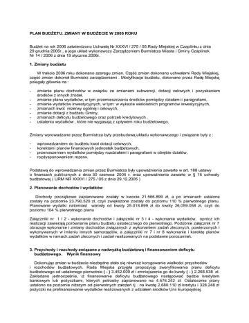 PLAN BUDŻETU. ZMIANY W BUDŻECIE W 2006 ROKU Budżet na rok 2006 zatwierdzono Uchwałą Nr XXXVI / 275 / 05 Rady Miejskiej w Czaplinku z dnia 29 grudnia 2005r., a jego układ wykonawczy Zarządzeniem Burmistrza Miasta i Gminy Czaplinek Nr 14 / 2006 z dnia 19 stycznia 2006r. 1. Zmiany budżetu W trakcie 2006 roku dokonano szeregu zmian. Część zmian dokonano uchwałami Rady Miejskiej, część zmian dokonał Burmistrz zarządzeniami . Modyfikacje budżetu, dokonane przez Radę Miejską polegały głównie na : - zmianie planu dochodów w związku ze zmianami subwencji, dotacji celowych i pozyskaniem środków z innych źródeł, zmianie planu wydatków, w tym przemieszczaniu środków pomiędzy działami i paragrafami, zmianie wydatków inwestycyjnych, w tym: w wykazie wieloletnich programów inwestycyjnych, zmianach kwot rezerwy ogólnej i celowych, zmianie dotacji z budżetu Gminy, zmianach deficytu budżetowego oraz potrzeb kredytowych , ustaleniu wydatków , które nie wygasają z upływem roku budżetowego, Zmiany wprowadzane przez Burmistrza były przebudową układu wykonawczego i związane były z : - wprowadzaniem do budżetu kwot dotacji celowych, korektami planów finansowych jednostek budżetowych, przenoszeniem wydatków pomiędzy rozdziałami i paragrafami w obrębie działów, rozdysponowaniem rezerw. Podstawą do wprowadzania zmian przez Burmistrza były upoważnienia zawarte w art. 188 ustawy o finansach publicznych z dnia 30 czerwca 2005 r. oraz upoważnienie zawarte w § 15 uchwały budżetowej ( URM NR XXXVI / 275 / 05 z dnia 29.12.2005 ) 2. Planowanie dochodów i wydatków Dochody początkowo zaplanowane zostały w kwocie 21.566.899 zł, a po zmianach ustalone zostały na poziomie 23.790.520 zł, czyli zwiększone zostały do poziomu 110 % pierwotnego planu. Planowane wydatki natomiast wzrosły od kwoty 25.018.899 zł do kwoty 26.059.058 zł, czyli do poziomu 104 % pierwotnego planu Załączniki nr 1 i 2 - wykonanie dochodów i załączniki nr 3 i 4 - wykonanie wydatków, oprócz ich realizacji zawierają porównanie planu budżetu ostatecznego do pierwotnego. Podobnie załącznik nr 7 obrazuje wykonanie i zmiany dochodów związanych z wykonaniem zadań zleconych, powierzonych i wykonywanych w imieniu innych samorządów, a załączniki nr 7 i nr 8 wykonanie i korektę planów wydatków w ramach zadań zleconych i zadań realizowanych na podstawie porozumień. 3. Przychody i rozchody związane z nadwyżką budżetową i finansowaniem deficytu budżetowego. Wynik finansowy Dokonując zmian w budżecie niezbędne stało się również korygowanie wielkości przychodów i rozchodów budżetowych. Rada Miejska przyjęła propozycję zweryfikowania planu deficytu budżetowego od ustalonego pierwotnie ( - ) 3.452.000 zł i zmniejszenia go do kwoty ( - ) 2.268.538 zł. Zakładano jednocześnie, iż finansowanie deficytu budżetowego następować będzie kredytem bankowym lub pożyczkami, których potrzeby zaplanowano na 4.576.242 zł. Ostatecznie plany ustalono na poziomie niższym od pierwotnych założeń tj . na kwotę 2.680.110 zł kredytu i 328.248 zł pożyczki na prefinansowanie wydatków realizowanych z udziałem środków Unii Europejskiej. Dochody budżetowe zrealizowano z nadwyżką . Na zadowalającą realizację dochodów wpływ miała bardzo dobra egzekucja dochodów podatkowych oraz lepsze niż oczekiwano wykonanie dochodów stanowiących udziały w podatku dochodowym od osób fizycznych i od osób prawnych. Faktyczny stan środków na rachunku i utrzymywanie płynności finansowej Gminy pozwoliło na zaciągnięcie mniejszego niż planowano kredytu bo jedynie w kwocie 1.025.000,00 zł i pożyczkę w kwocie 328.248,47 zł. Finansowanie deficytu budżetowego obrazuje załącznik nr 5 do sprawozdania. W uchwale budżetowej XXXVI/275/05 z 29.12.2005 na 2006 rok planowano spłaty rat kredytu na poziomie 1.124.242,00 zł , a ustalono ostatecznie ich wysokość na kwotę 739.820,00 zł, pierwotnie bowiem zakładano, iż znaczne kredyty uruchomione zostaną już w I połowie roku i część spłat dokonywana będzie jeszcze w tym samym roku. Przewidywano także wcześniejsze uruchomienie pożyczek na prefinansowanie i spłatę ich z refundacji środków uzyskanych z Unii Europejskiej. Jednak znaczące kwoty kredytu i pożyczki uruchomiono w ostatnich miesiącach roku 2006 .W trakcie roku Gmina nie korzystała z kredytu krótkoterminowego, odnawialnego w rachunku bieżącym. W trakcie roku lokowano natomiast wolne środki na lokatach miesięcznych i weekendowych. 4. Zadłużenie Gminy Zadłużenie Gminy obrazuje zał. Nr 5. Na wykazany w załączniku dług składają się pozostałe do spłaty kredyty w kwocie 4.335.180 zł, pożyczka 328.248,47 zł na prefinansowanie wydatków finansowanych ze środków UE oraz wymagalne zobowiązania Szkoły Podstawowej w Czaplinku w kwocie 69,95 zł Na zadłużenie kredytowe składają się pozostałe do spłaty kredyty, które wykazano w poniższej tabeli . Prezentuje ona także spłaty kredytów w roku 2006. Kredytodawca Przeznaczenie kredytu Spłaty Kwota Spłaty Rok roku w roku 2006 pozostała do uruchomienia do spłaty 2006 kredytu Bank Ochrony Środowiska w Koszalinie 2003 500.000 250.000 Bank Ochrony Środowiska w Koszalinie 2004 50.000 250.000 Bank Ochrony Środowiska w Koszalinie 2004 100.000 100.000 2005 0 60.000 2005 0 29.820 2006 0 50.000 Gospodarczy Bank Wielkopolski w Poznaniu Gospodarczy Bank Wielkopolski w Poznaniu Pomorski Bank Spółdzielczy O/Czaplinek Na pokrycie wydatków nie 1.750.000 znajdujących pokrycia w planowanych dochodach budżetowych Na pokrycie wydatków nie 700.000 znajdujących pokrycia w planowanych dochodach budżetowych Preferencyjny, 200.000 inwestycyjny ze środków Europejskiego Funduszu Wsi Polskiej na budowę wodociągu do Siemczyna Inwestycyjny na budowę 385.000 infrastruktury Osiedla Wiejska Na pokrycie wydatków nie 325.180 znajdujących pokrycia w planowanych dochodach budżetowyc