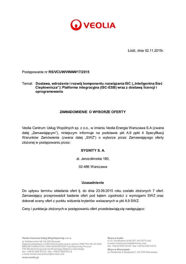 Łódź, dnia 02.11.2015r. Postępowanie nr RS/VCUW/VWAW/17/2015 Temat: Dostawa, wdrożenie i rozwój komponentu rozwiązania ISC („Inteligentna Sieć Ciepłownicza”): Platforma integracyjna (ISC-ESB) wraz z dostawą licencji i oprogramowania. ZAWIADOMIENIE O WYBORZE OFERTY Veolia Centrum Usług Wspólnych sp. z o.o., w imieniu Veolia Energia Warszawa S.A (zwana dalej „Zamawiającym”), niniejszym informuje na podstawie pkt A.9 ppkt 4 Specyfikacji Warunków Zamówienia (zwana dalej „SWZ”) o wyborze przez Zamawiającego oferty złożonej w postępowaniu przez: SYGNITY S. A. al. Jerozolimskie 180, 02-486 Warszawa Uzasadnienie Do upływu terminu składania ofert tj. do dnia 23.09.2015 roku zostało złożonych 7 ofert. Zamawiający przeprowadził badanie ofert pod kątem zgodności z wymogami SWZ oraz dokonał oceny ofert z punktu widzenia kryteriów wskazanych w pkt A.9 SWZ. Ceny i punktacja złożonych w postępowaniu ofert przedstawiają się następująco: Pozycja Nazwa i adres Wykonawcy 1. Sygnity S. A., Al. Jerozolimskie 180, 02-486 Warszawa Zaoferowana cena netto Ilość punktów Wariant II pn.-pt. 7-17 Wariant II pn.-pt. 7-17 1 901 000,00 97,13 1 948 864,40 95,02 Konsorcjum wykonawców : Alma S. A., ul. Hodowlana 5, 61-680 Poznań 2. CrossVista Polska Sp. z o. o., Ul. Kopernika 42, 42-200 Częstochowa 3. AMG.net/ATOS Polska Sp. z o. o., ul. Królewska 16, 00-103 Warszawa 2 645 005,00 83,50 4. SII Sp. z o. o., Al. Niepodległości 69, 02-626 Warszawa 2 293 200,00 93,19 5. Pentacomp Systemy Informatyczne S.A., Aleje Jerozolimskie 179, 02-222 Warszawa 4 677 239,71 73,39 3 590 000,00 74,36 2 981 552,00 79,37 6. Konsorcjum wykonawców : Intertrading Systems Technology Sp. z o.o., Al. Jerozolimskie 162 A, 02-342 Warszawa Connectpoint Sp. z o. o., Ul. Łopuszańska 32, 02-220 Warszawa 7. Outbox Sp. z o. o., ul. Puławska 182, 02-670 Warszawa Umowa z wybranym Wykonawcą zostanie podpisana w określonym przez Zamawiającego terminie.