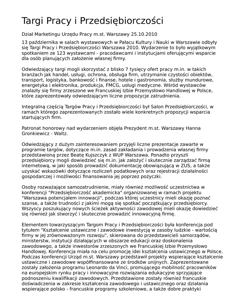 Targi Pracy i Przedsiębiorczości Dział Marketingu Urzędu Pracy m.st. Warszawy 25.10.2010 13 października w salach wystawowych w Pałacu Kultury i Nauki w Warszawie odbyły się Targi Pracy i Przedsiębiorczości Warszawa 2010. Wydarzenie to było wyjątkowym spotkaniem ze 123 wystawcami - pracodawcami i instytucjami oferującymi wsparcie dla osób planujących założenie własnej firmy. Odwiedzający targi mogli skorzystać z blisko 7 tysięcy ofert pracy m.in. w takich branżach jak handel, usługi, ochrona, obsługa firm, utrzymanie czystości obiektów, transport, logistyka, bankowość i finanse, hotele i gastronomia, służby mundurowe, energetyka i elektronika, produkcja, FMCG, usługi medyczne. Wśród wystawców znalazły się firmy zrzeszone we Francuskiej Izbie Przemysłowo Handlowej w Polsce, które zaprezentowały odwiedzającym liczne propozycje zatrudnienia. Integralną częścią Targów Pracy i Przedsiębiorczości był Salon Przedsiębiorczości, w ramach którego zaprezentowanych zostało wiele konkretnych propozycji wsparcia startujących firm. Patronat honorowy nad wydarzeniem objęła Prezydent m.st. Warszawy Hanna Gronkiewicz - Waltz. Odwiedzający z dużym zainteresowaniem przyjęli liczne prezentacje zawarte w programie targów, dotyczące m.in. zasad zakładania i prowadzenia własnej firmy przedstawioną przez Beatę Kujszczyk z WUP Warszawa. Ponadto przyszli przedsiębiorcy mogli dowiedzieć się m.in. jak założyć i skutecznie zarządzać firmą internetową, w jaki sposób prowadzić dokumentację obowiązującą w ZUS, a także uzyskać wskazówki dotyczące rozliczeń podatkowych oraz rejestracji działalności gospodarczej i możliwości finansowania jej poprzez pożyczki. Osoby rozważające samozatrudnienie, miały również możliwość uczestnictwa w konferencji "Przedsiębiorczość akademicka" organizowanej w ramach projektu "Warszawa potencjałem innowacji", podczas której uczestnicy mieli okazję poznać szanse, a także trudności z jakimi mogą się spotkać początkujący przedsiębiorcy. Wszyscy poszukujący nowych ścieżek aktywności zawodowej mieli okazję dowiedzieć się również jak stworzyć i skutecznie prowadzić innowacyjną firmę. Elementem towarzyszącym Targom Pracy i Przedsiębiorczości była konferencja pod tytułem "Kształcenie ustawiczne i zawodowe inwestycją w zasoby ludzkie - wartością firmy w jej zrównoważonym rozwoju", skierowana do przedstawicieli samorządów, ministerstw, instytucji działających w obszarze edukacji oraz doskonalenia zawodowego, a także inwestorów zrzeszonych we Francuskiej Izbie Przemysłowo Handlowej. Konferencja miała na celu promocję idei kształcenia ustawicznego w Polsce. Podczas konferencji Urząd m.st. Warszawy przedstawił projekty wspierające kształcenie ustawiczne i zawodowe współfinansowane ze środków unijnych. Zaprezentowane zostały założenia programu Leonardo da Vinci, promującego mobilność pracowników na europejskim rynku pracy i innowacyjne rozwiązania edukacyjne sprzyjające podnoszeniu kwalifikacji zawodowych. Przedstawione zostały również francuskie doświadczenia w zakresie kształcenia zawodowego i ustawicznego oraz działania wspierające polsko - francuskie programy szkoleniowe, a także dobre praktyki współpracy szkół z przedsiębiorcami. Targi Pracy i Przedsiębiorczości spotkały się z dużym zainteresowaniem odwiedzających, odwiedziło je ponad 8 000 osób. Dużym zainteresowaniem cieszyło się również stoisko Wojewódzkiego Urzędu Pracy w Warszawie, w którym goście targów mogli zapoznać się z ofertą naszego urzędu m.in. w zakresie doradztwa zawodowego skierowanego do osób bezrobotnych lub zamierzających dokonać zmiany zawodu, informacjami odnośnie procedury zakładania i prowadzenia własnej działalności gospodarczej, ofertą dotyczącą systemu EURES oraz wsparciem dla przedsiębiorców znajdujących się w przejściowych trudnościach finansowych realizowanym w ramach ustawy z dnia 1 lipca 2009 r. o łagodzeniu skutków kryzysu ekonomicznego dla pracowników i przedsiębiorców. Organizatorami Targów Pracy i Przedsiębiorczości byli: Urząd m.st. Warszawy, Urząd Pracy m.st. Warszawy, Uniwersytet Warszawski, Centralny Ośrodek Aktywizacji Zawodowej, Wojewódzki Urząd Pracy w Warszawie, Zakład Doskonalenia Zawodowego w Warszawie oraz Warszawskie Koło Polskiego Stowarzyszenia na Rzecz Osób z Upośledzeniem Umysłowym. Partnerzy Organizacyjni: Francuska Izba Przemysłowo Handlowa w Polsce, Monster Worldwide Polska, Louvre Hotels, Med-Expert, Zarząd Transportu Miejskiego. Patronat medialny: Dziennik Gazeta Prawna, Radio Dla Ciebie, Portal Rynku Pracy HRK.pl, TVN CNBC, TVN Warszawa.