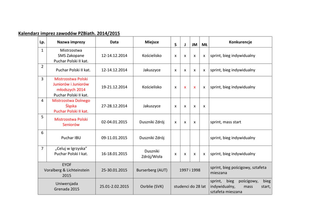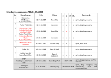 Kalendarz imprez zawodów PZBiath. 2014/2015 Lp. Nazwa imprezy Data Miejsce 1 Mistrzostwa SMS Zakopane Puchar Polski II kat. 12-14.12.2014 2 3 4 5 M Konkurencje S J JM MŁ Kościelisko x x x x sprint, bieg indywidualny 12-14.12.2014 Jakuszyce x x x x sprint, bieg indywidualny 19-21.12.2014 Kościelisko x x x x sprint, bieg indywidualny 27-28.12.2014 Jakuszyce x x x x Mistrzostwa Polski Seniorów 02-04.01.2015 Duszniki Zdrój x x x Puchar IBU 09-11.01.2015 Duszniki Zdrój „Celuj w Igrzyska” Puchar Polski I kat. 16-18.01.2015 Duszniki Zdrój/Wisła 25-30.01.2015 Burserberg (AUT) Puchar Polski II kat. Mistrzostwa Polski Juniorów i Juniorów młodszych 2014 Puchar Polski II kat. Mistrzostwa Dolnego Śląska Puchar Polski II kat. sprint, mass start 6 7 EYOF Voralberg & Lichteinstein 2015 Uniwersjada Grenada 2015 25.01-2.02.2015 Osrblie (SVK) sprint, bieg indywidualny x x x x 1997 i 1998 studenci do 28 lat sprint, bieg indywidualny sprint, bieg pościgowy, sztafeta mieszana sprint, bieg pościgowy, bieg indywidualny, mass start, sztafeta mieszana Mistrzostwa Europy Seniorów i Juniorów sprint, bieg indywidualny, bieg pościgowy, sztafeta 26.01-3.02.2015 Otepaa (EST) x x „Celuj w Igrzyska” Puchar Polski I kat. 6-8.02.2015 Kościelisko x x x x sprint, bieg pościgowy Puchar Europy Centralnej Puchar Polski II kat 13-15.02.2015 Kościelisko/Wisła x x x x sprint, bieg pościgowy Mistrzostwa Świata Juniorów 15-22.02.2015 Raubichi (BLR) x x sprint, bieg pościgowy, indywidualny, sztafeta bieg x x sprint, bieg pościgowy, indywidualny, sztafeta bieg 8 9 10 Mistrzostwa Polski Juniorów Ogólnopolska Olimpiada Młodzieży Mistrzostwa Świata Seniorów 11 „Finał Celuj w Igrzyska” Mistrzostwa Polski Młodzików Nadzieje Olimpijskie 12 „Puchar Karkonoszy” Puchar Polski II kat. CISM 25.02-1.03.2015 02-15.03.2015 Kontiolahti (FIN) x 06-08.03.2015 Wisła/Duszniki Zdrój x 13-15.03.2014 Jablonec (CZE) 20-22.03.2015 Jakuszyce 23-28.03.2015 Boden (SWE) sprint, bieg pościgowy, bieg indywidualny, mass start, sztafety, sztafeta mieszana x x x 1996-1997 1998-1999 x x x żołnierze sprint, sztafeta bieg indywidualny, sprint, bieg indywidualny x sprint, bieg pościgowy