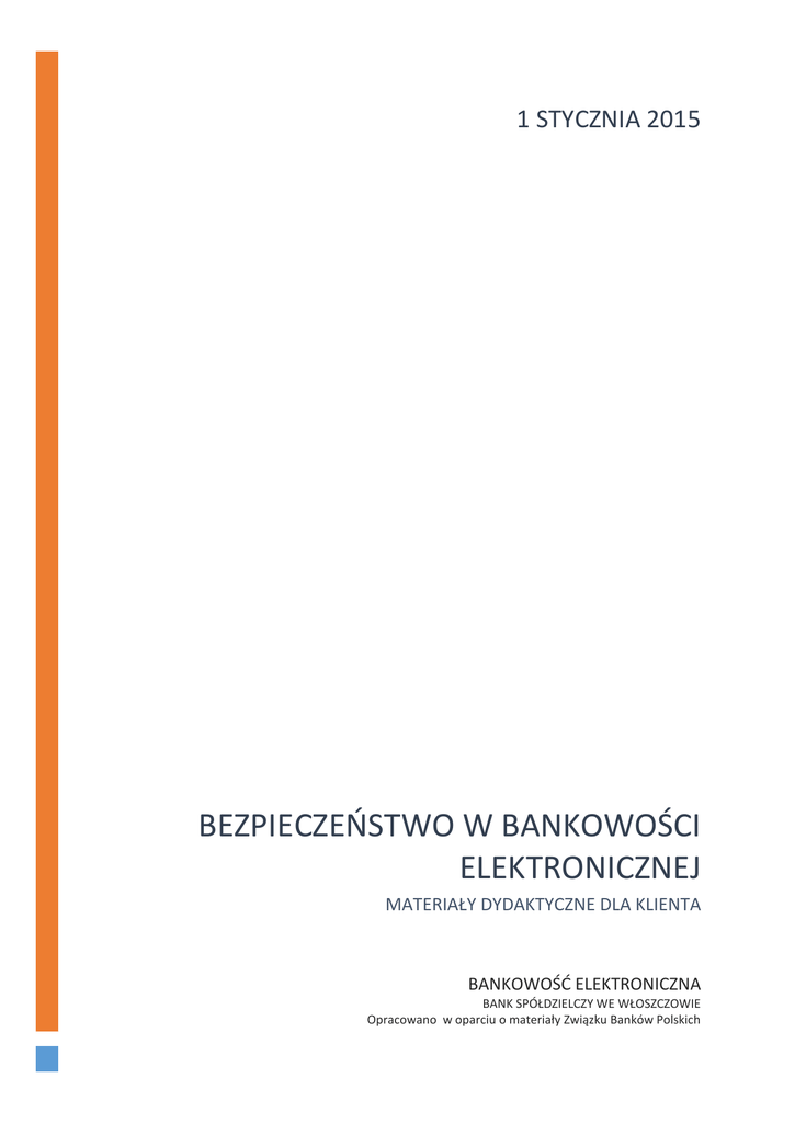 1 STYCZNIA 2015 BEZPIECZEŃSTWO W BANKOWOŚCI ELEKTRONICZNEJ MATERIAŁY DYDAKTYCZNE DLA KLIENTA BANKOWOŚĆ ELEKTRONICZNA BANK SPÓŁDZIELCZY WE WŁOSZCZOWIE Opracowano w oparciu o materiały Związku Banków Polskich Strona |1 Spis treści WSTĘP...................................................................................................................................................... 2 CO ZAGRAŻA NASZEMU BEZPIECZEŃSTWU W BANKOWOŚCI ELEKTRONICZNEJ I JAK SIĘ PRZED TYM BRONIĆ? .................................................................................................................................................. 3 Wyłudzenia danych pozwalających na przeprowadzenie transakcji................................................... 3 Kradzieże z wykorzystaniem złośliwego oprogramowania ................................................................. 5 Kopiowanie kart płatniczych ............................................................................................................... 8 Kradzieże związane z kartami zbliżeniowymi .................................................................................... 10 Kradzieże przy użyciu danych karty płatniczej .................................................................................. 12 Zagrożenia dotyczące płatności mobilnych ....................................................................................... 13 Kradzieże tożsamości......................................................................................................................... 15 „Oszustwa nigeryjskie” ...................................................................................................................... 17 Kradzieże w sklepach internetowych ................................................................................................ 18 Co zrobić, gdy pieniądze znikną z rachunku bankowego w wyniku przestępstwa?.......................... 19 PODSUMOWANIE .................................................................................................................................. 21 Poufność ............................................................................................................................................ 21 Spokój ................................................................................................................................................ 22 Zdrowy rozsądek ............................................................................................................................... 23 Wiedza ............................................................................................................................................... 23 Strona |2 WSTĘP Rozwój bankowości elektronicznej, w tym dynamicznie rozwijającej się bankowości internetowej, opartej na elektronicznym przetwarzaniu danych, pociąga za sobą wzrost liczby różnorodnych form przestępczej aktywności wymierzonej przeciwko bezpieczeństwu danych, zagrażających bezpieczeństwu finansowemu na rynku usług bankowych, w szczególności bezpieczeństwu środków zgromadzonych na rachunku bankowym, do których dostęp możliwy jest na odległość za pomocą urządzeń do elektronicznego przetwarzania i przechowywania danych, takich jak komputer, telefon itp. Nie ulega wątpliwości, że skala zagrożeń przestępczością w bankowości elektronicznej będzie wciąż rosła wraz z nieuniknionym, dalszym rozpowszechnianiem się usług bankowości elektronicznej, m.in. ze względu na coraz łatwiejszy do nich dostęp oraz atrakcyjność tych usług polegającą na wygodnym, niewymagającym osobistego udania się do banku, dostępie do środków zgromadzonych na rachunku bankowym, praktycznie nieograniczonym co do miejsca i czasu. Nie można pominąć faktu, że na rozmiar przestępczości w elektronicznym obrocie bankowym ma również wpływ zachowanie indywidualnych uczestników rynku finansowego, którzy nie zawsze w dostatecznym stopniu są świadomi istniejących zagrożeń. Często nie posiadają też wiedzy o tym, jak mogą się przed nimi bronić. Ważne było więc stworzenie opracowania, którego celem będzie wzrost świadomości uczestników rynku finansowego w sferze zagrożeń związanych z korzystaniem z bankowości elektronicznej oraz upowszechnienie wiedzy na temat zasad postępowania, których przestrzeganie w znacznym stopniu pozwoli ustrzec się przed nimi, a także przybliżenie problematyki dotyczącej istoty i specyfiki przestępstw związanych z bankowością elektroniczną. Strona |3 CO ZAGRAŻA NASZEMU BEZPIECZEŃSTWU ELEKTRONICZNEJ I JAK SIĘ PRZED TYM BRONIĆ? W BANKOWOŚCI Wyłudzenia danych pozwalających na przeprowadzenie transakcji Przykład Po ciężkim dniu spędzonym w pracy zmęczony Pan Robert w końcu wsiadł do samochodu i ruszył w kierunku domu. Nagle usłyszał dzwonek telefonicznego zestawu głośnomówiącego. – Dzień dobry Panie Robercie. Dzwonię z pańskiego banku w związku z realizowanym przez nas projektem, którego celem jest znaczące podniesienie poziomu bezpieczeństwa naszych klientów oraz deponowanych przez nich środków pieniężnych. W celu potwierdzenia pańskiej tożsamości, uprzejmie proszę podać swój login do bankowości internetowej. – Bardzo proszę: robkow123. – Dziękuję. Proszę jeszcze podać pierwsze sześć znaków pańskiego hasła. – „L”, „u”, „b”, „i”, „e”, „K”. – Niestety, coś się nie zgadza. Proszę w takim razie podać sześć ostatnich znaków. – Przepraszam, musiałem coś pomylić. Ostatnie sześć znaków to: „i”, „e”, „K”, „o”, „t”, „y”. – Dziękuję, już wszystko się zgadza. Jednym z elementów naszego projektu jest przeniesienie funkcji potwierdzeń SMS na nowoczesne, super bezpieczne serwery. W związku z tym, w celu przełączenia pańskiego konta na nowy serwer, za chwilę prześlemy panu SMS testowy. Proszę spraw