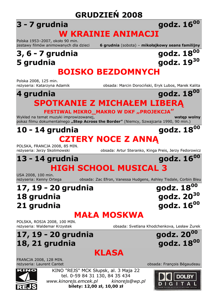 GRUDZIEŃ 2008 3 - 7 grudnia godz. 1600 W KRAINIE ANIMACJI Polska 1953–2007, około 90 min. zestawy filmów animowanych dla dzieci 6 grudnia (sobota) – mikołajkowy seans familijny godz. 1800 godz. 1930 3, 6 - 7 grudnia 5 grudnia BOISKO BEZDOMNYCH Polska 2008, 125 min. reżyseria: Katarzyna Adamik obsada: Marcin Dorociński, Eryk Lubos, Marek Kalita godz. 1800 4 grudnia SPOTKANIE Z MICHAŁEM LIBERĄ FESTIWAL MIKRO_MAKRO W DKF „PROJEKCJA” Wykład na temat muzyki improwizowanej, wstęp wolny pokaz filmu dokumentalnego „Step Across the Border” (Niemcy, Szwajcaria 1990, 90 min.) godz. 1800 10 - 14 grudnia CZTERY NOCE Z ANNĄ POLSKA, FRANCJA 2008, 85 MIN. reżyseria: Jerzy Skolimowski obsada: Artur Steranko, Kinga Preis, Jerzy Fedorowicz 13 - 14 grudnia godz. 1600 HIGH SCHOOL MUSICAL 3 USA 2008, 100 min. reżyseria: Kenny Ortega obsada: Zac Efron, Vanessa Hudgens, Ashley Tisdale, Corbin Bleu godz. 1800 godz. 2030 godz. 1600 17, 19 - 20 grudnia 18 grudnia 21 grudnia MAŁA MOSKWA POLSKA, ROSJA 2008, 100 MIN. reżyseria: Waldemar Krzystek obsada: Svetlana Khodchenkova, Lesław Żurek godz. 2000 godz. 1800 17, 19 - 20 grudnia 18, 21 grudnia KLASA FRANCJA 2008, 128 MIN. reżyseria: Laurent Cantet obsada: François Bégaudeau KINO "REJS" MCK Słupsk, al. 3 Maja 22 tel. 0-59 84 31 130, 84 35 434 www.kinorejs.emcek.pl [email protected] bilety: 12,00 zł, 10,00 zł